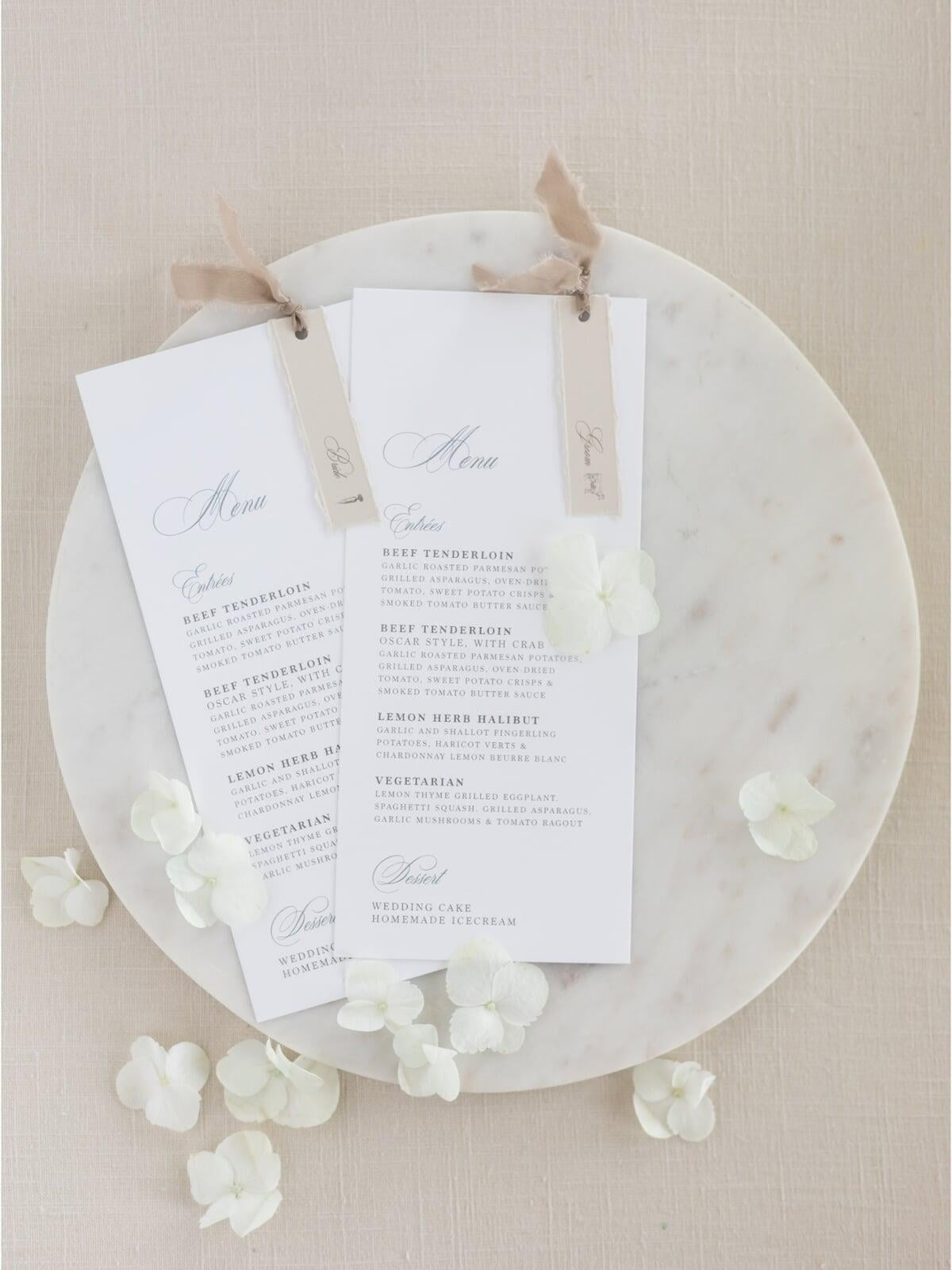 Set your guests' mouths watering with gorgeous menu cards at the table. Take it a step further, by pairing it with place cards — or customizing menus to feature each guest's name, so they not only know what they'll be eating, but where they'll be sitting.