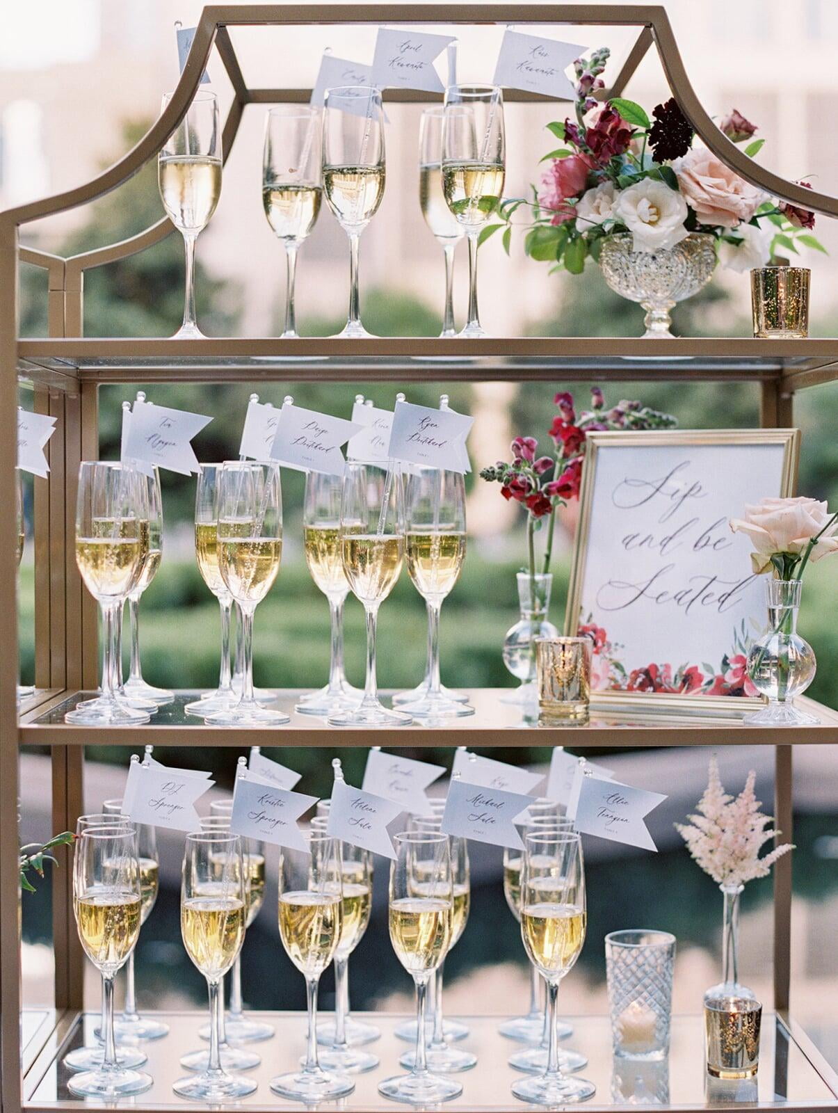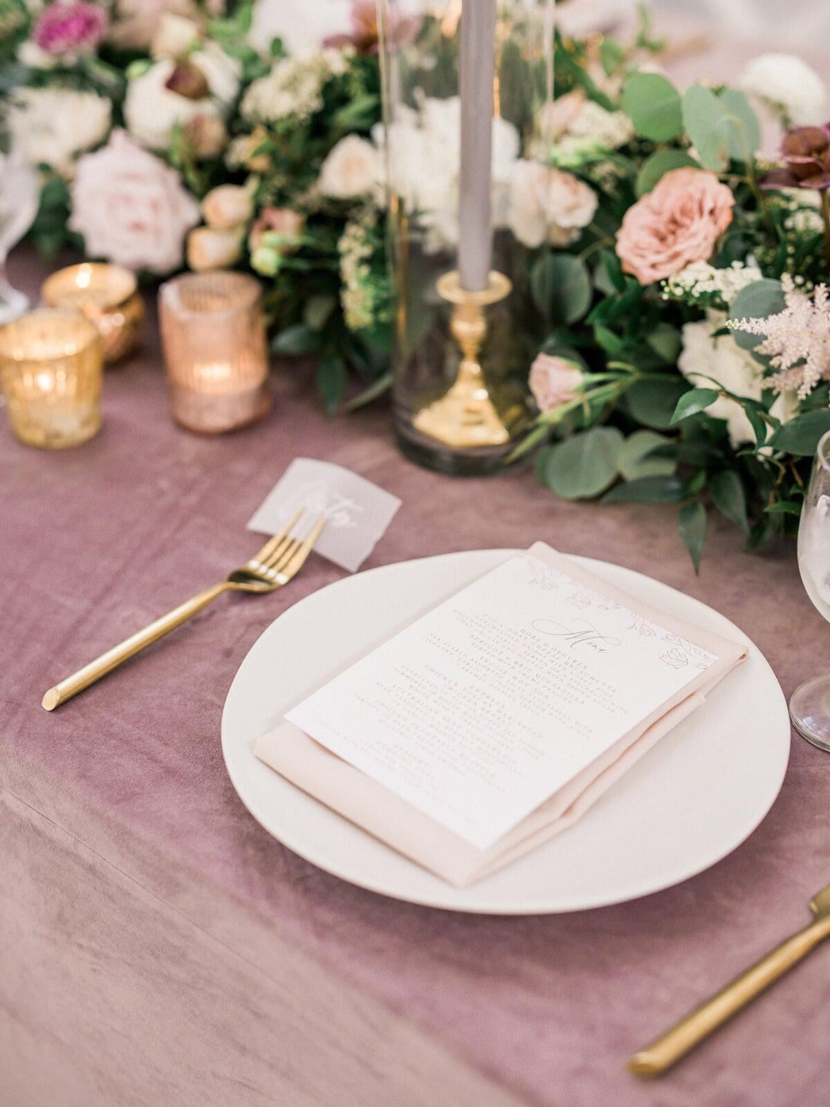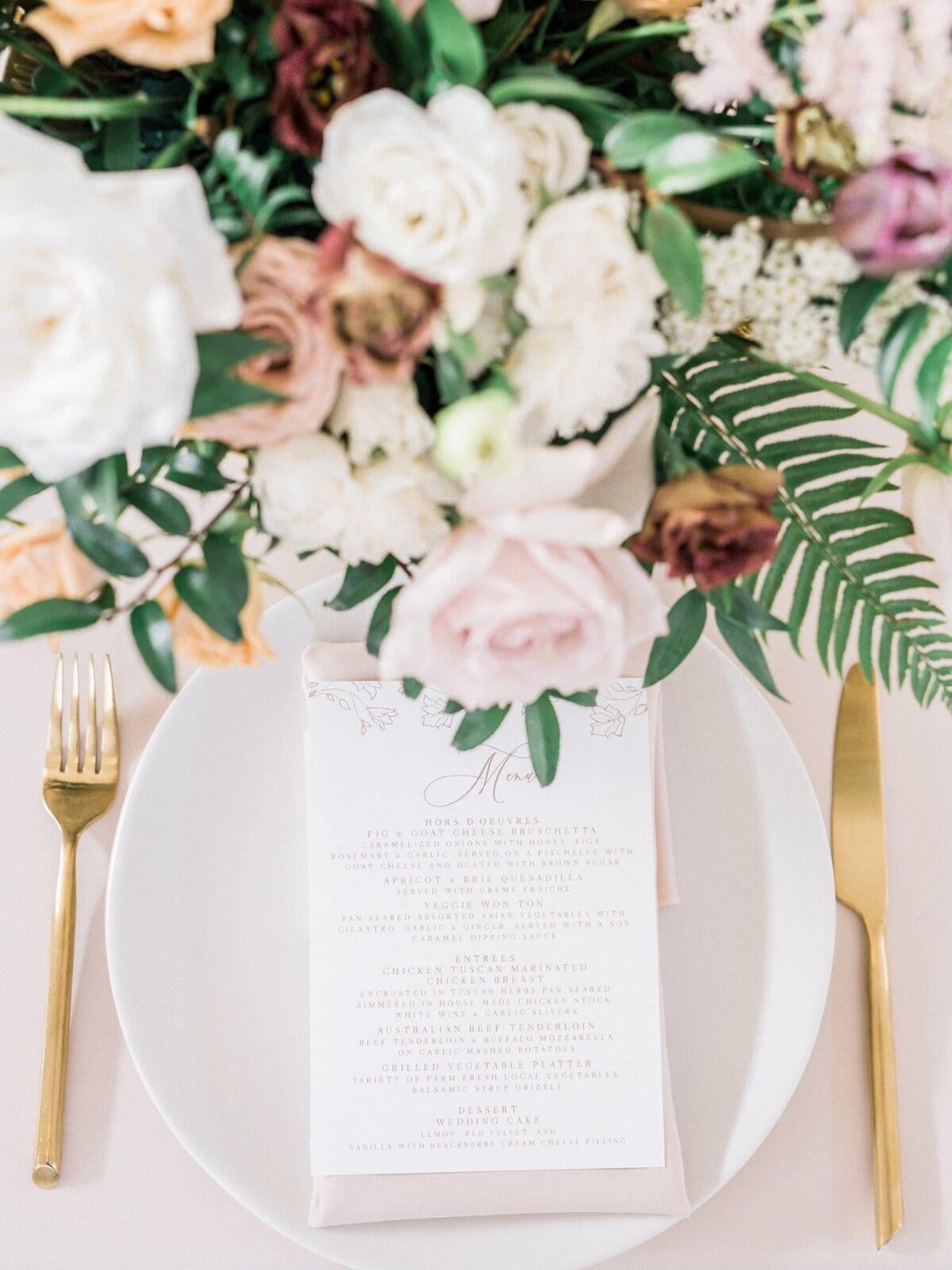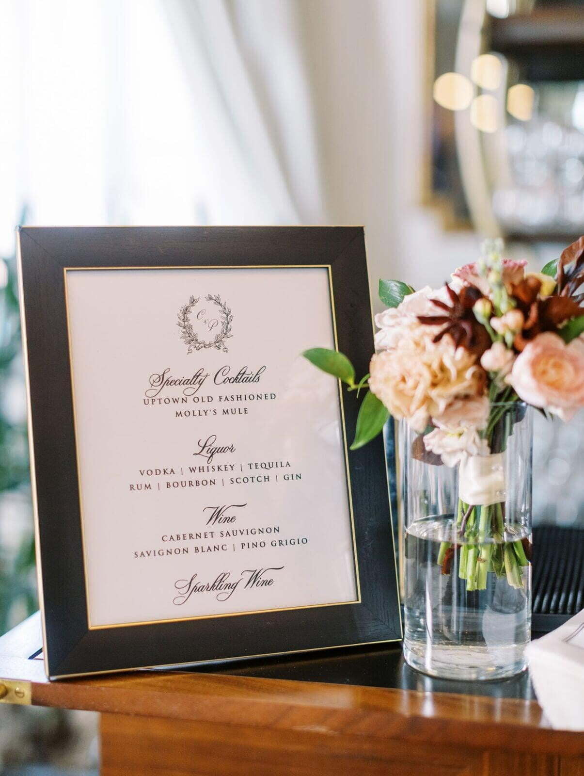 Lauren and Garrett envisioned a garden affair with lush florals in blush and burgundy. To tie in that vision, we created a monogram wreath featuring those florals and gold foil for the couples' names. Instead of a traditional escort card, guests grabbed flutes of Champagne with acrylic stir sticks sporting their seat assignment. At the table, guests found favors boxed with with blush ribbon and gold wax seal atop the menu which mimicked the invitation suite. Signage featured the same burgundy and blush florals to complete the look.