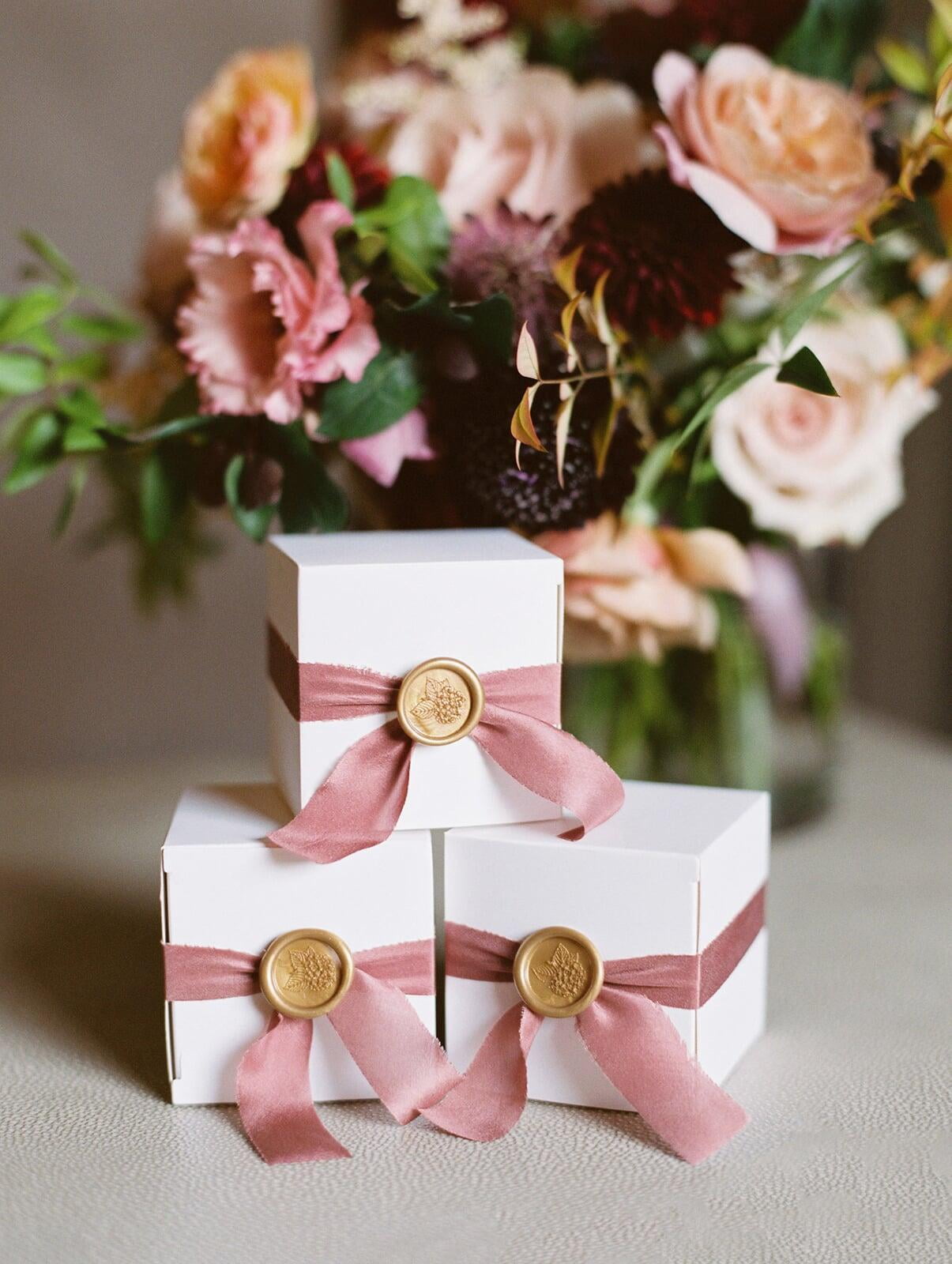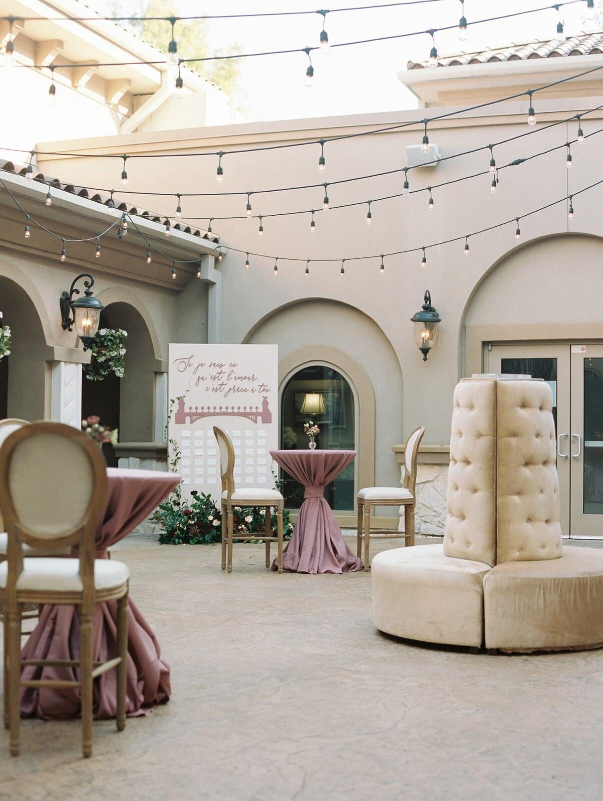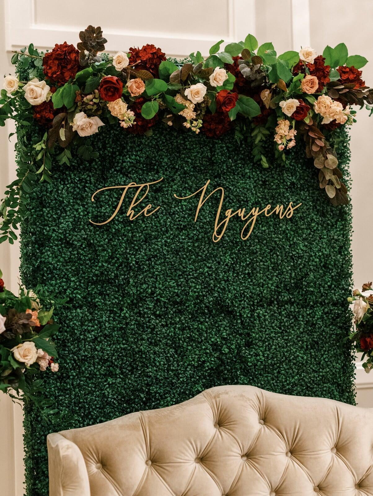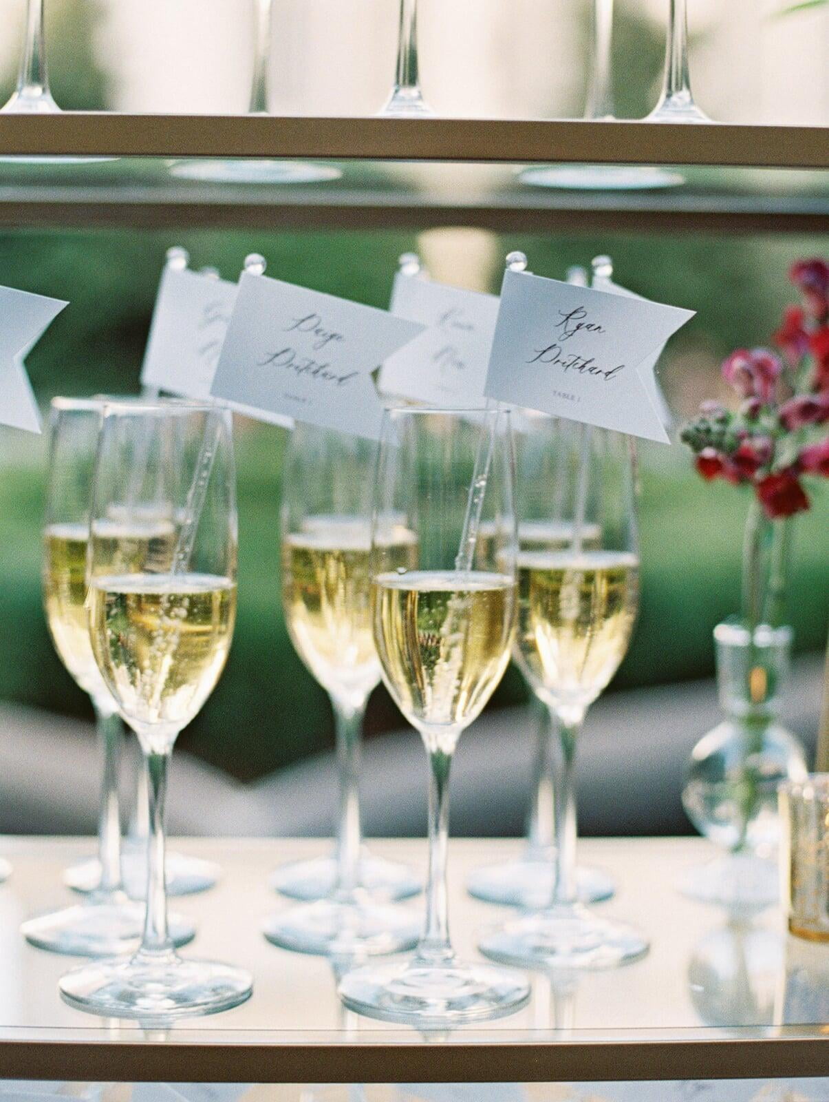 Lauren and Garrett envisioned a garden affair with lush florals in blush and burgundy. To tie in that vision, we created a monogram wreath featuring those florals and gold foil for the couples' names. Instead of a traditional escort card, guests grabbed flutes of Champagne with acrylic stir sticks sporting their seat assignment. At the table, guests found favors boxed with with blush ribbon and gold wax seal atop the menu which mimicked the invitation suite. Signage featured the same burgundy and blush florals to complete the look.