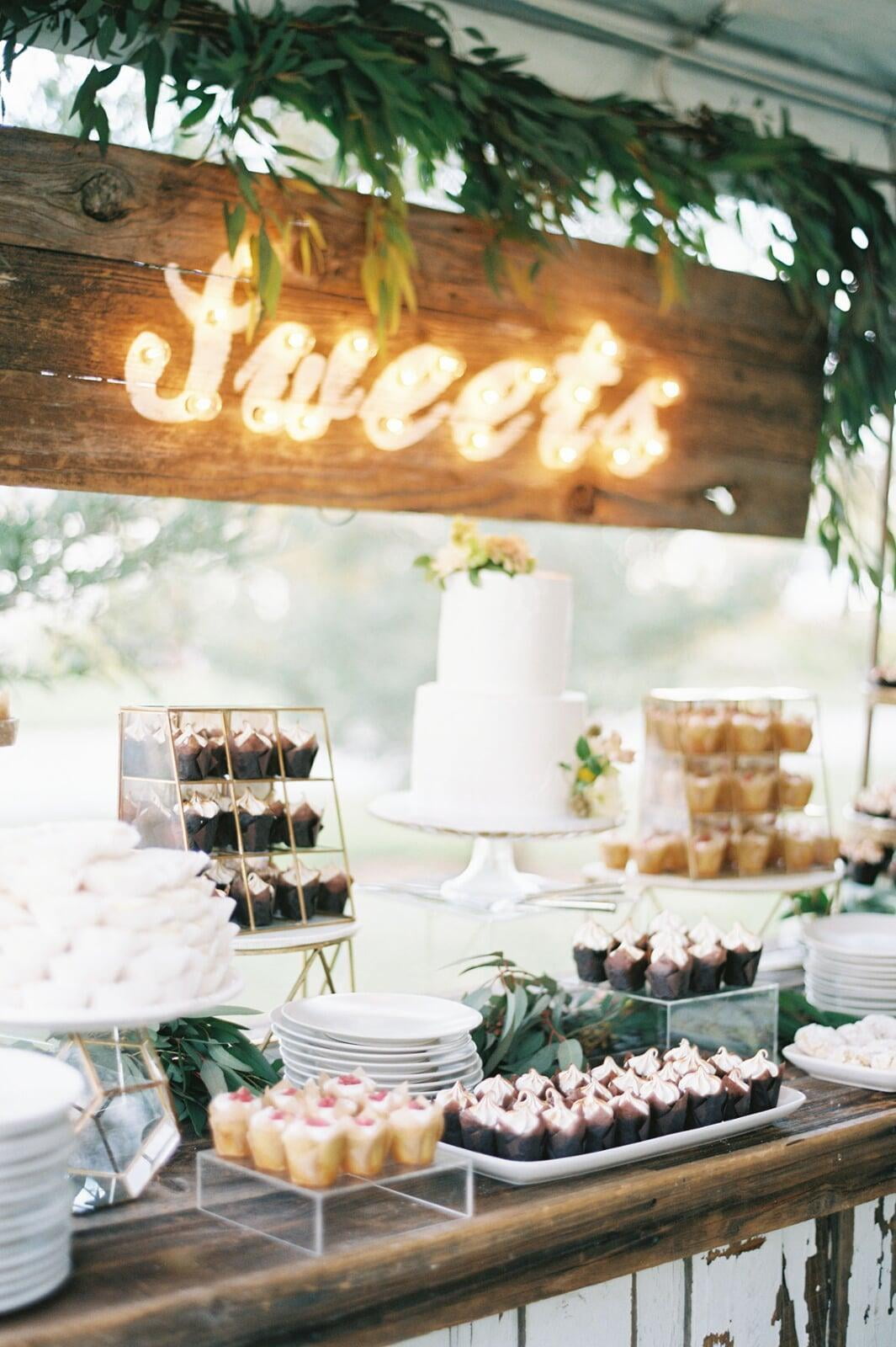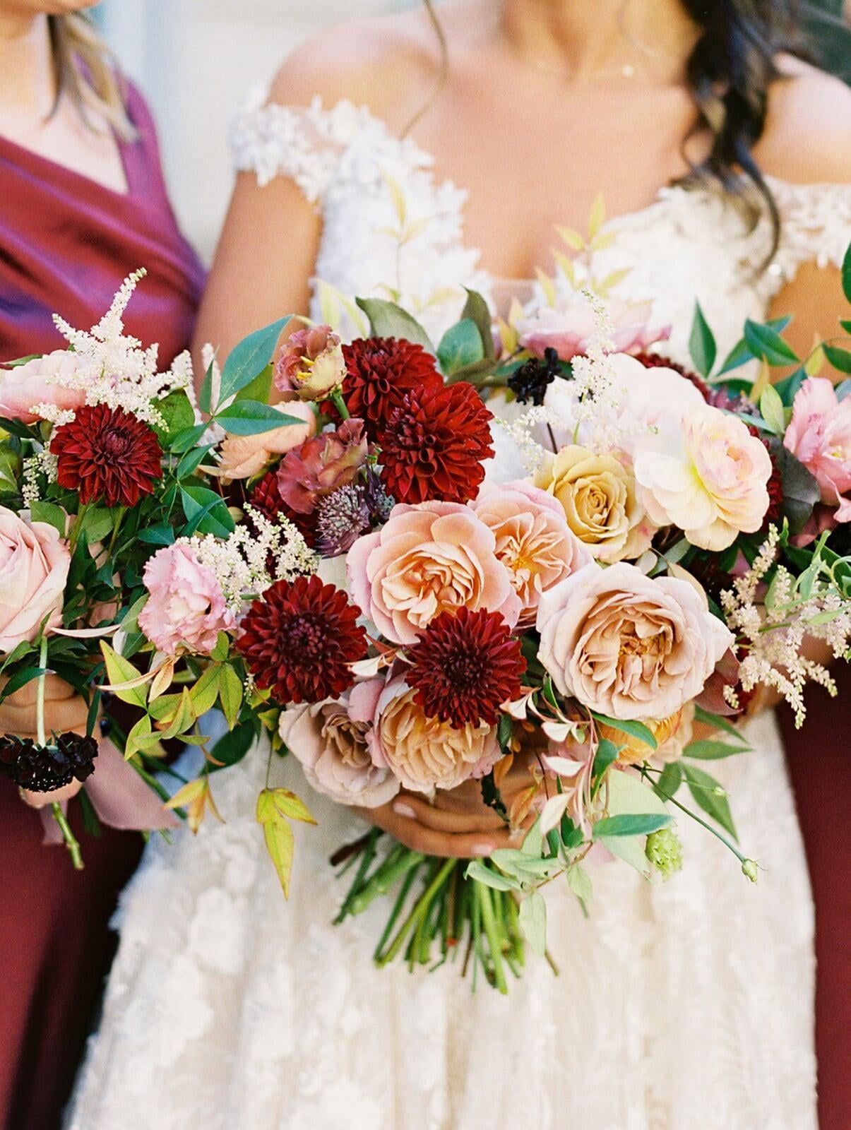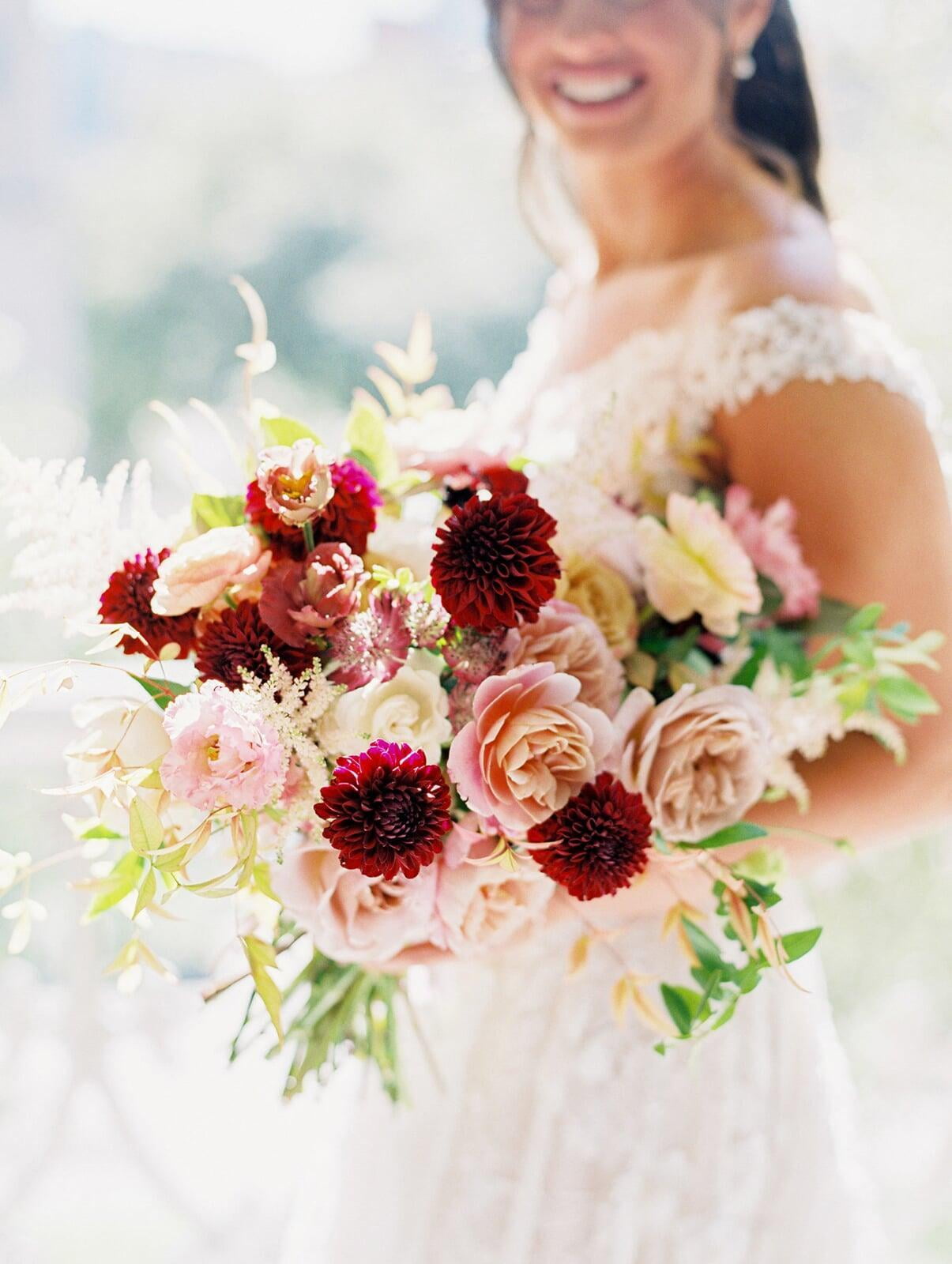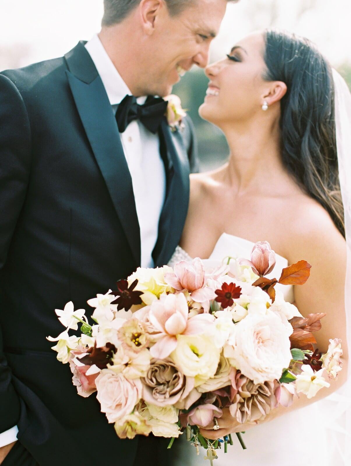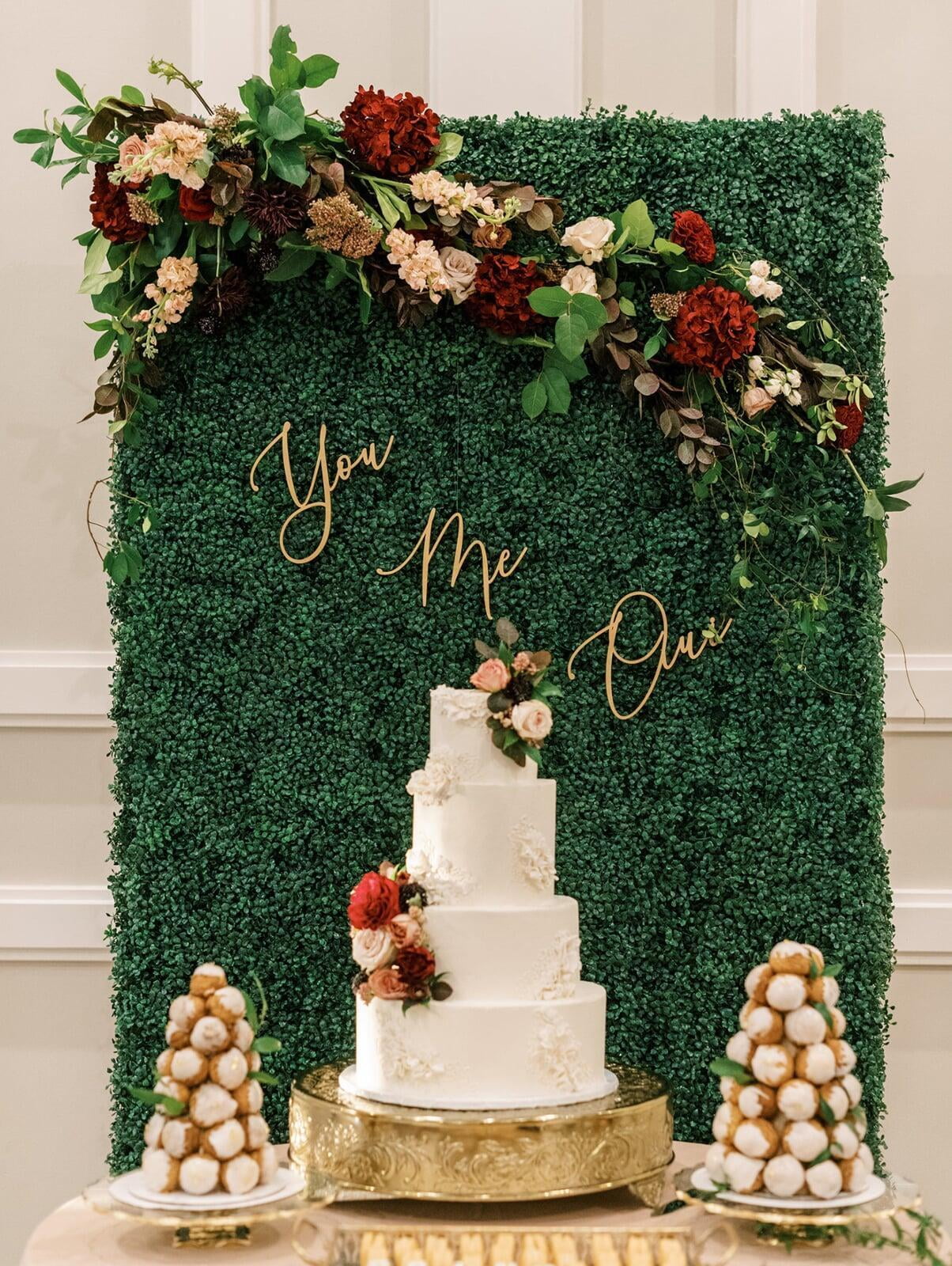 Lauren and Garrett envisioned a garden affair with lush florals in blush and burgundy. To tie in that vision, we created a monogram wreath featuring those florals and gold foil for the couples' names. Instead of a traditional escort card, guests grabbed flutes of Champagne with acrylic stir sticks sporting their seat assignment. At the table, guests found favors boxed with with blush ribbon and gold wax seal atop the menu which mimicked the invitation suite. Signage featured the same burgundy and blush florals to complete the look.
