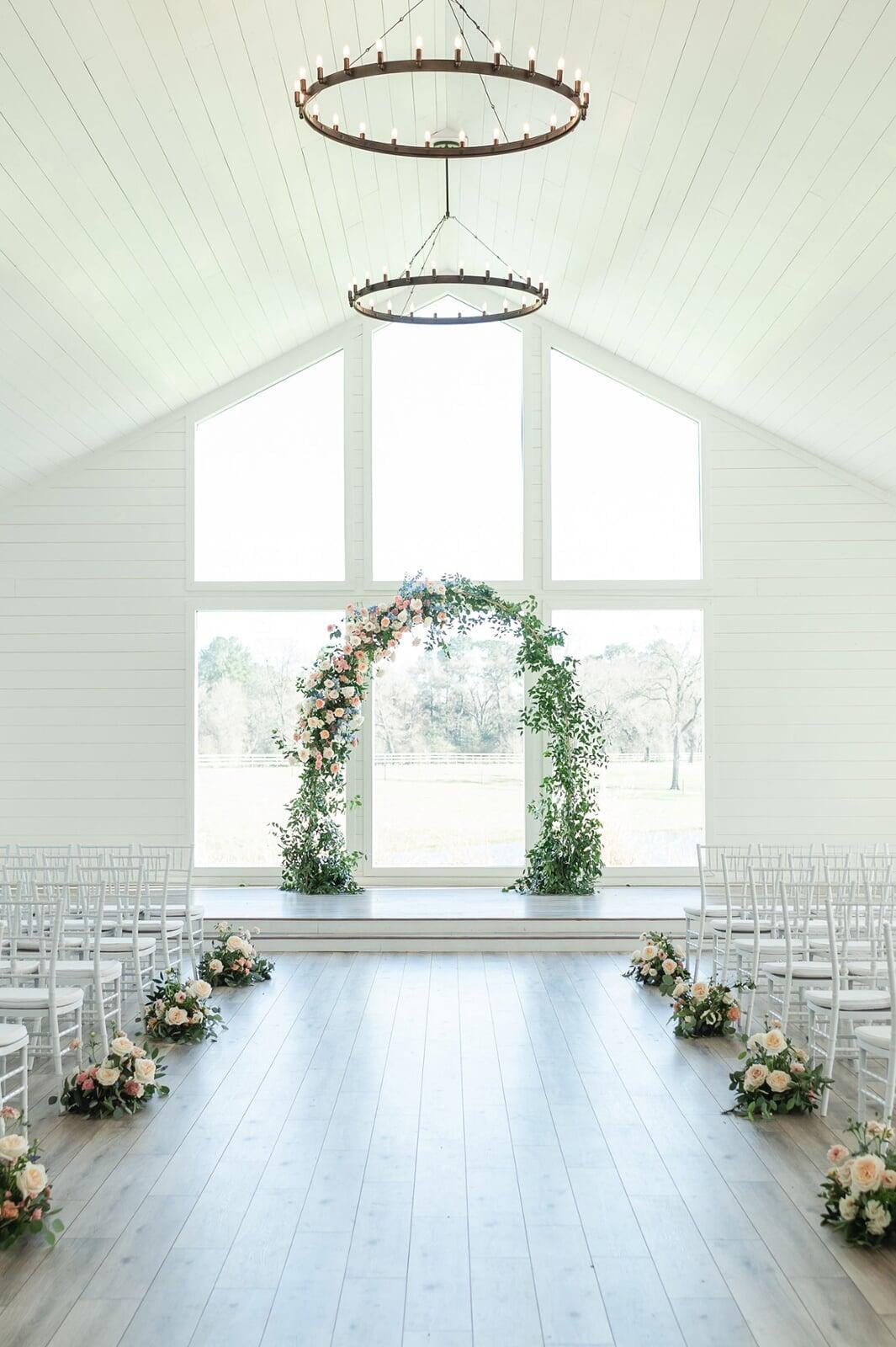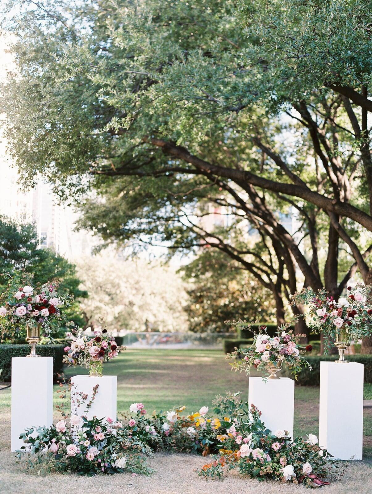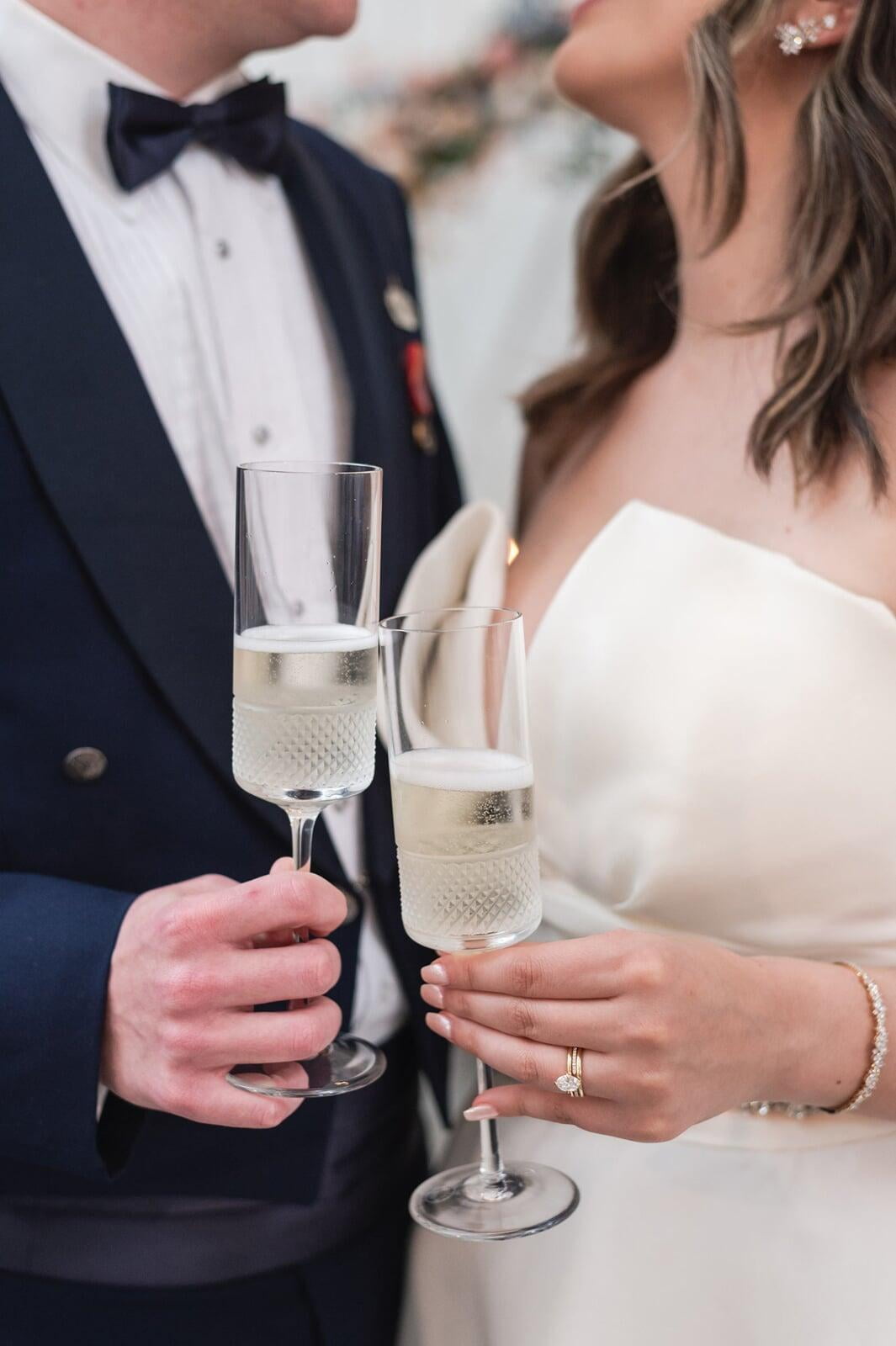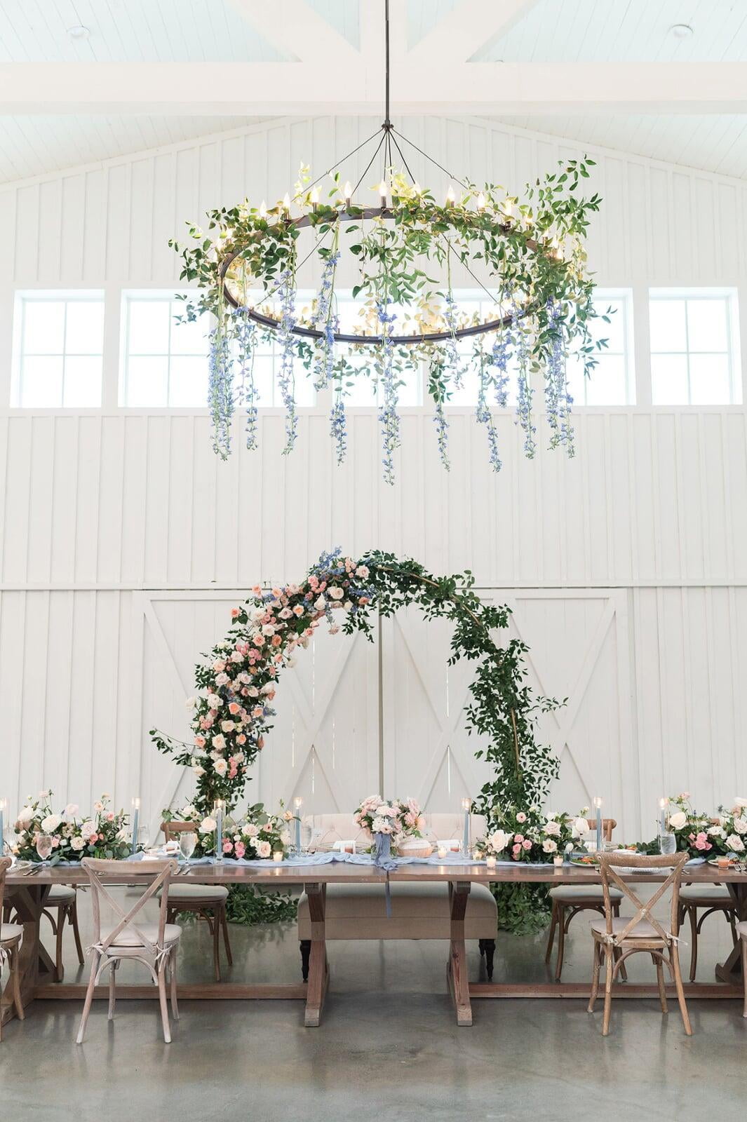 Lauren and Garrett envisioned a garden affair with lush florals in blush and burgundy. To tie in that vision, we created a monogram wreath featuring those florals and gold foil for the couples' names. Instead of a traditional escort card, guests grabbed flutes of Champagne with acrylic stir sticks sporting their seat assignment. At the table, guests found favors boxed with with blush ribbon and gold wax seal atop the menu which mimicked the invitation suite. Signage featured the same burgundy and blush florals to complete the look.