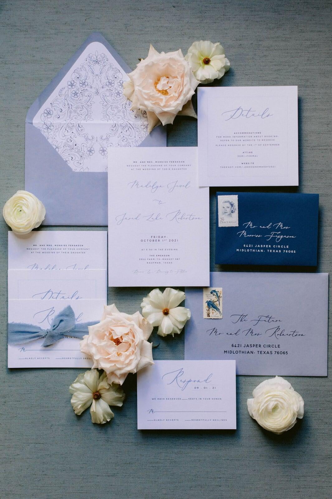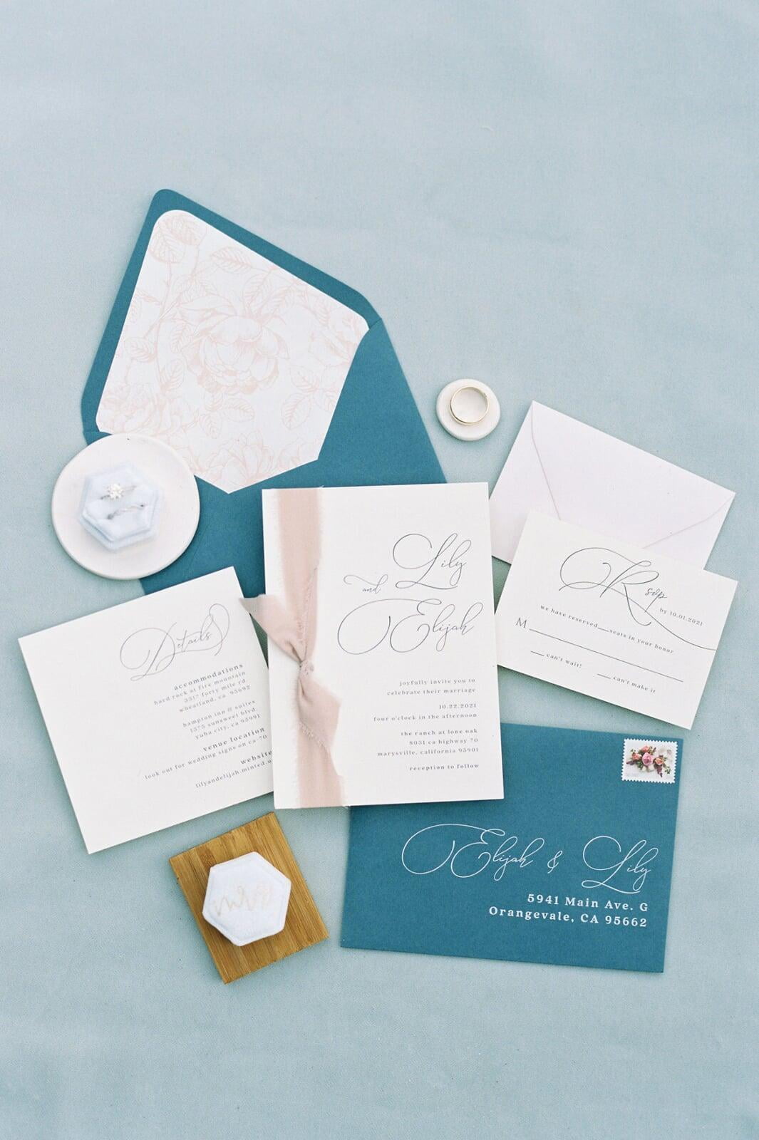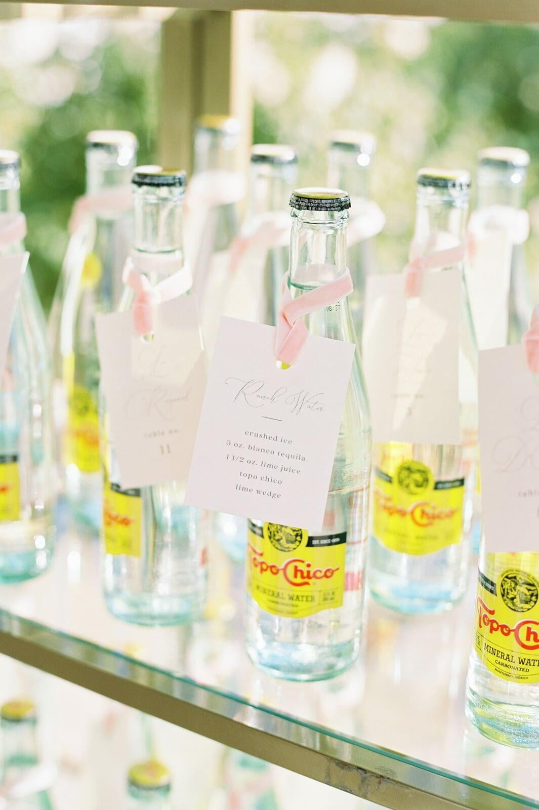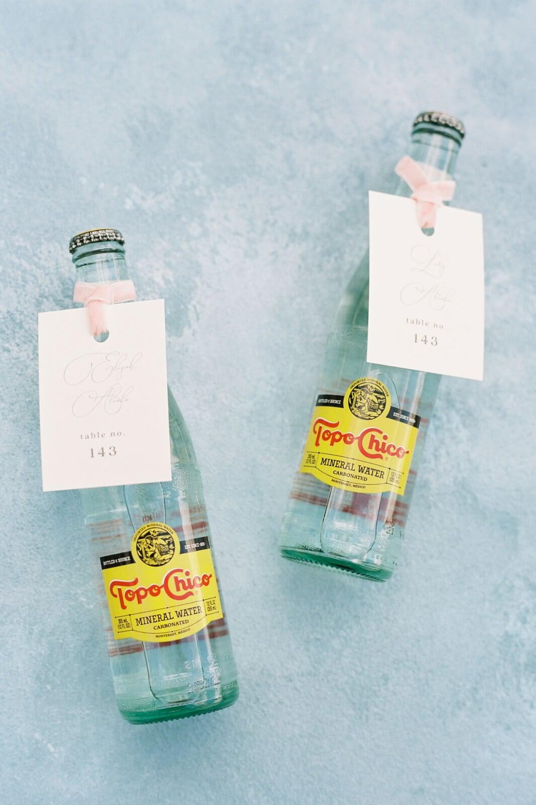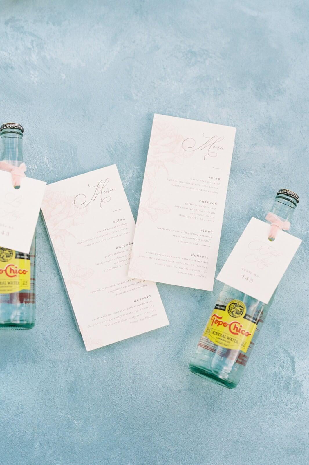 Lily and Elijah's wedding was colorful and fun, and those colors we're prominent in their wedding invitation suite with blue envelopes, a blush silk ribbon, and grey type — all with a simple and clean design. The suite featured a floral envelope liner in blush, which was also present on the menus. Guests found their seats via an escort display of Topo-Chico bottles, which served as their favor.
