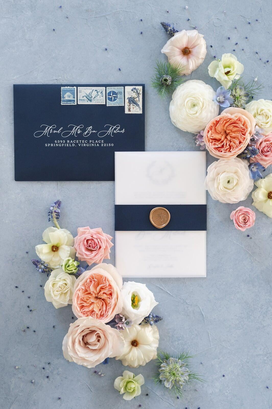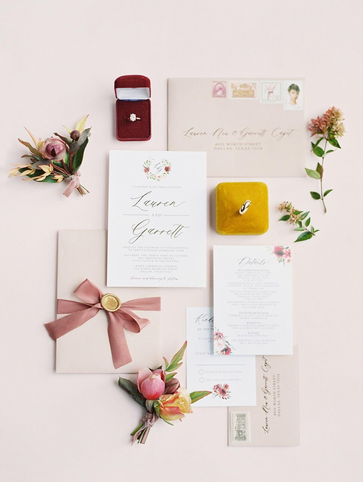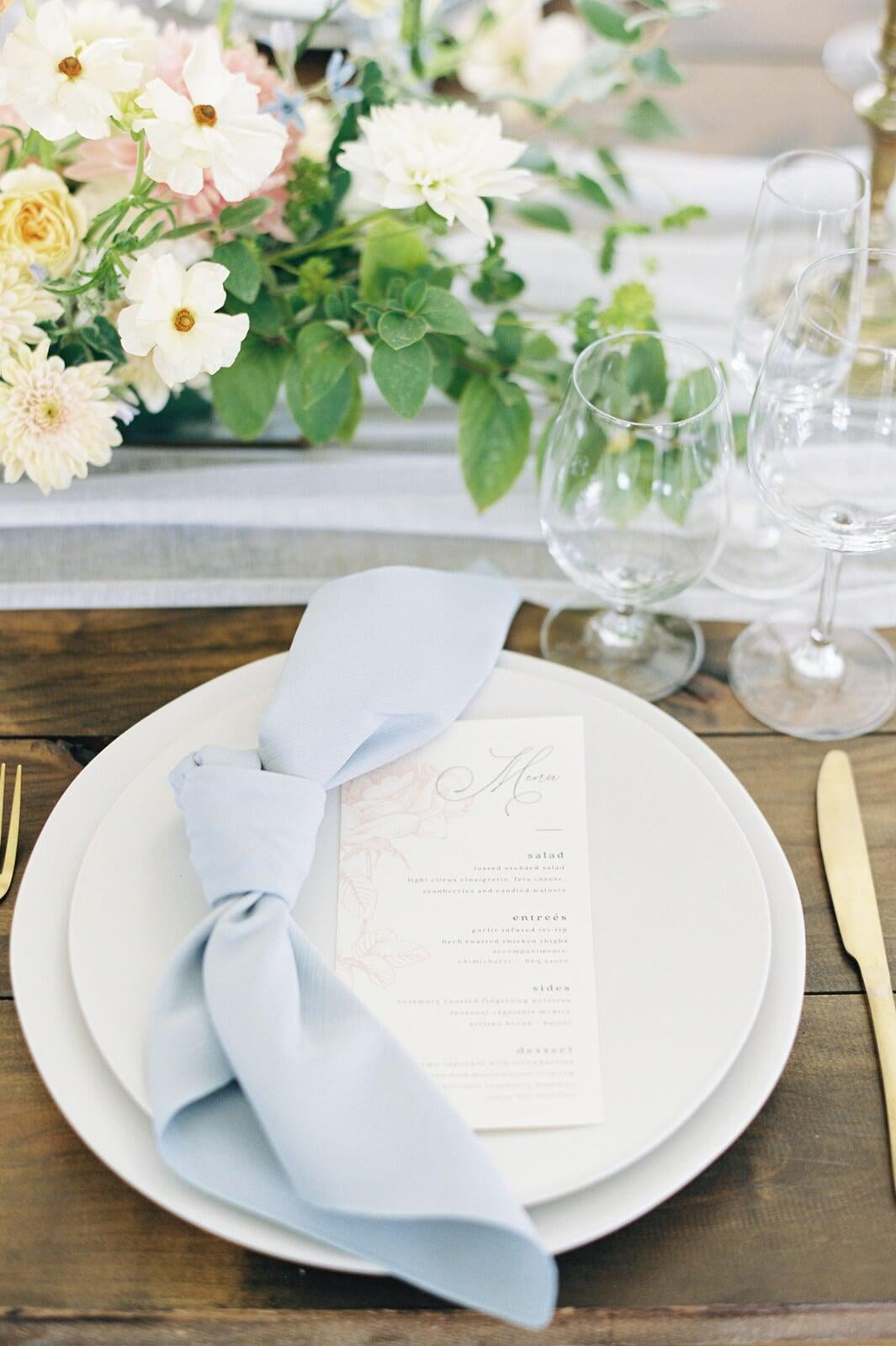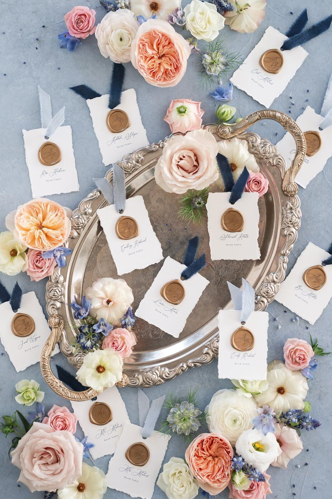 Lily and Elijah's wedding was colorful and fun, and those colors we're prominent in their wedding invitation suite with blue envelopes, a blush silk ribbon, and grey type — all with a simple and clean design. The suite featured a floral envelope liner in blush, which was also present on the menus. Guests found their seats via an escort display of Topo-Chico bottles, which served as their favor.