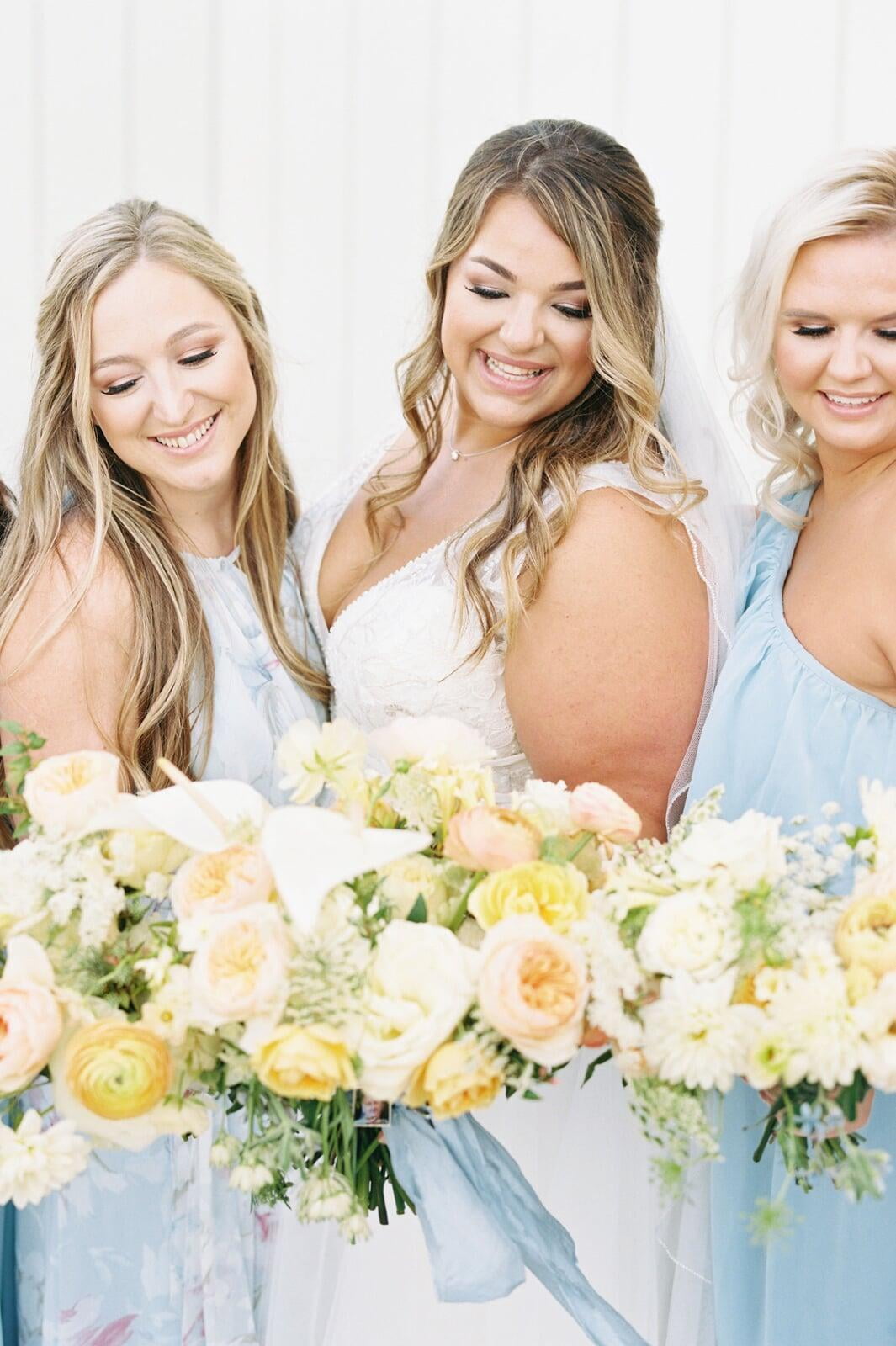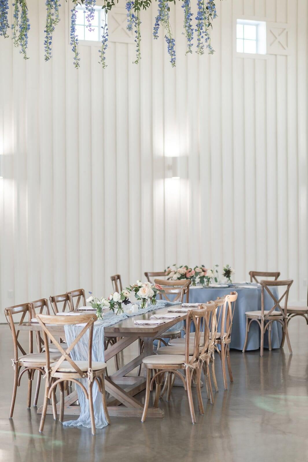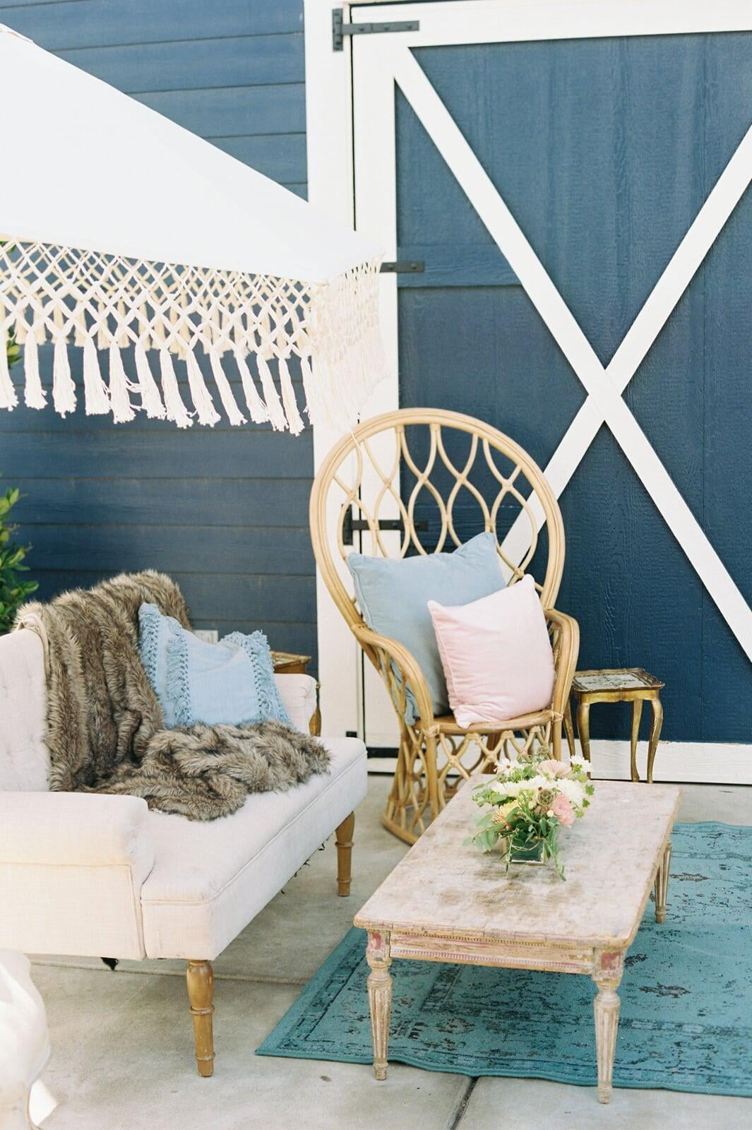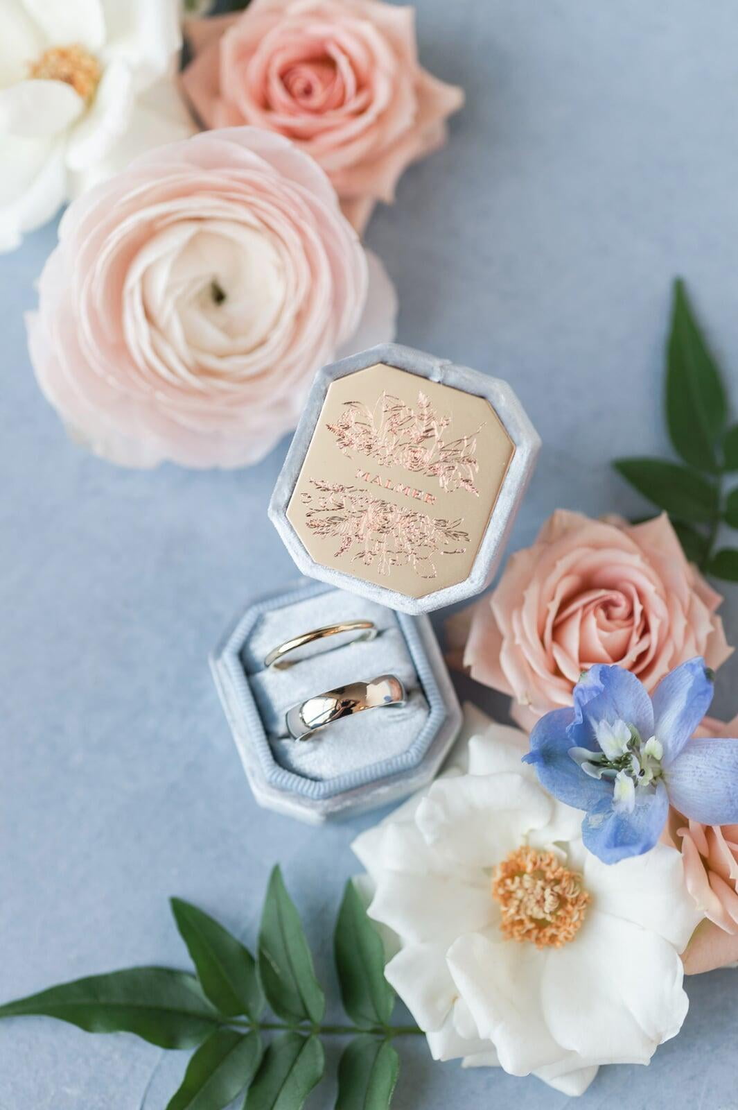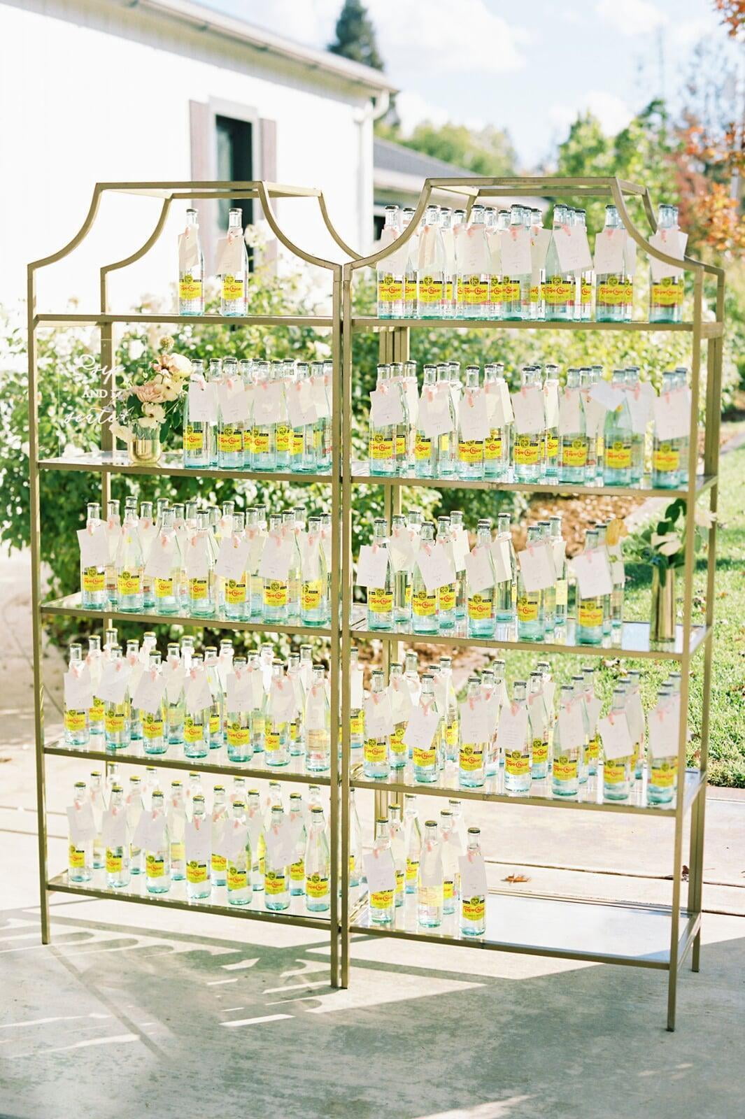 Lily and Elijah's wedding was colorful and fun, and those colors we're prominent in their wedding invitation suite with blue envelopes, a blush silk ribbon, and grey type — all with a simple and clean design. The suite featured a floral envelope liner in blush, which was also present on the menus. Guests found their seats via an escort display of Topo-Chico bottles, which served as their favor.