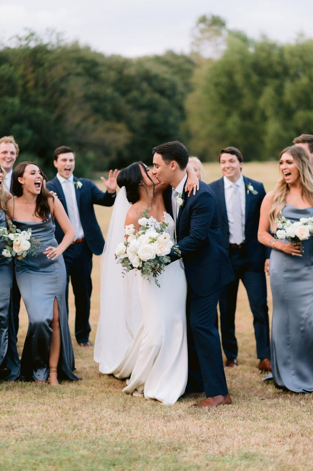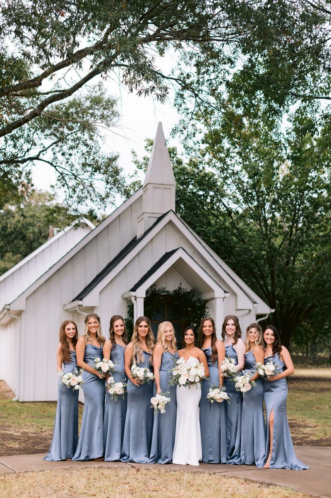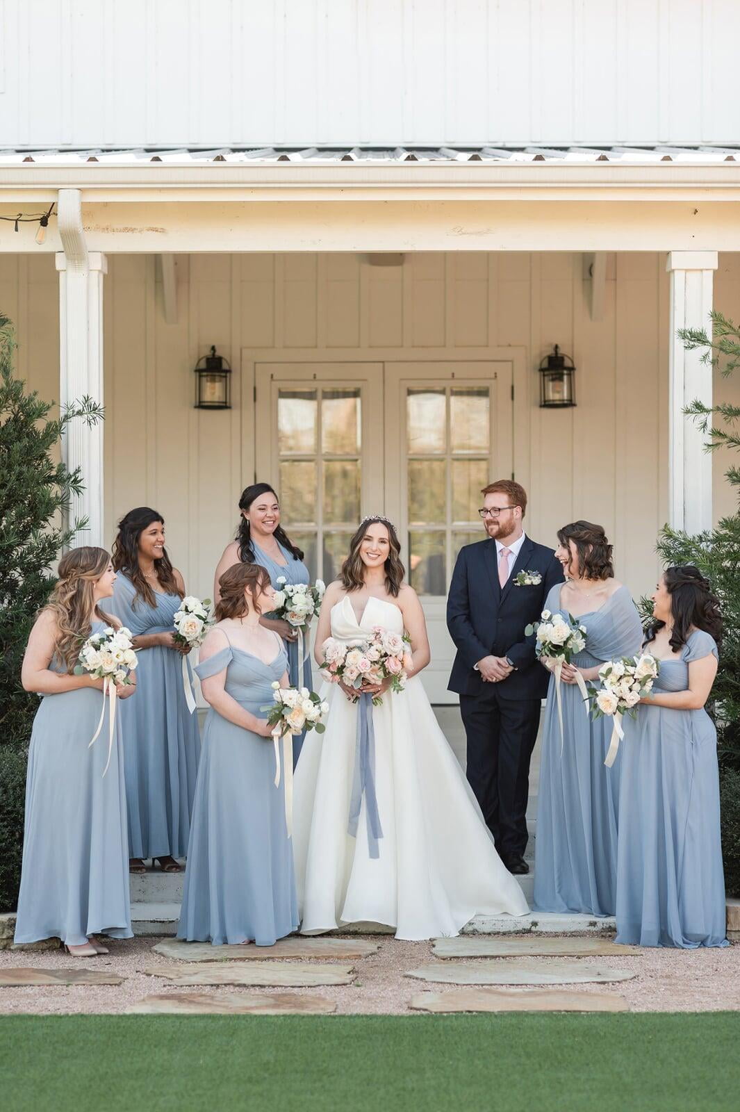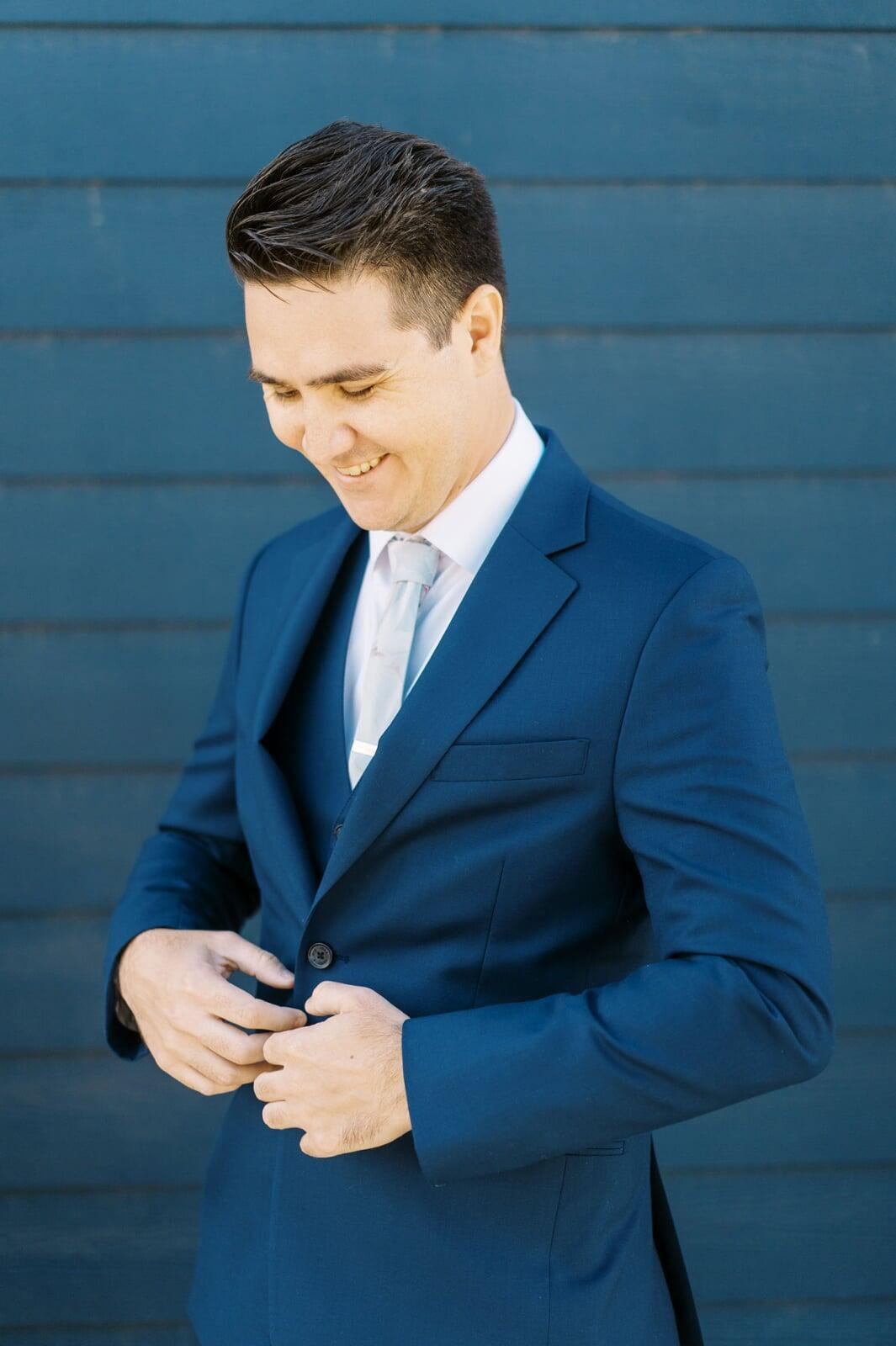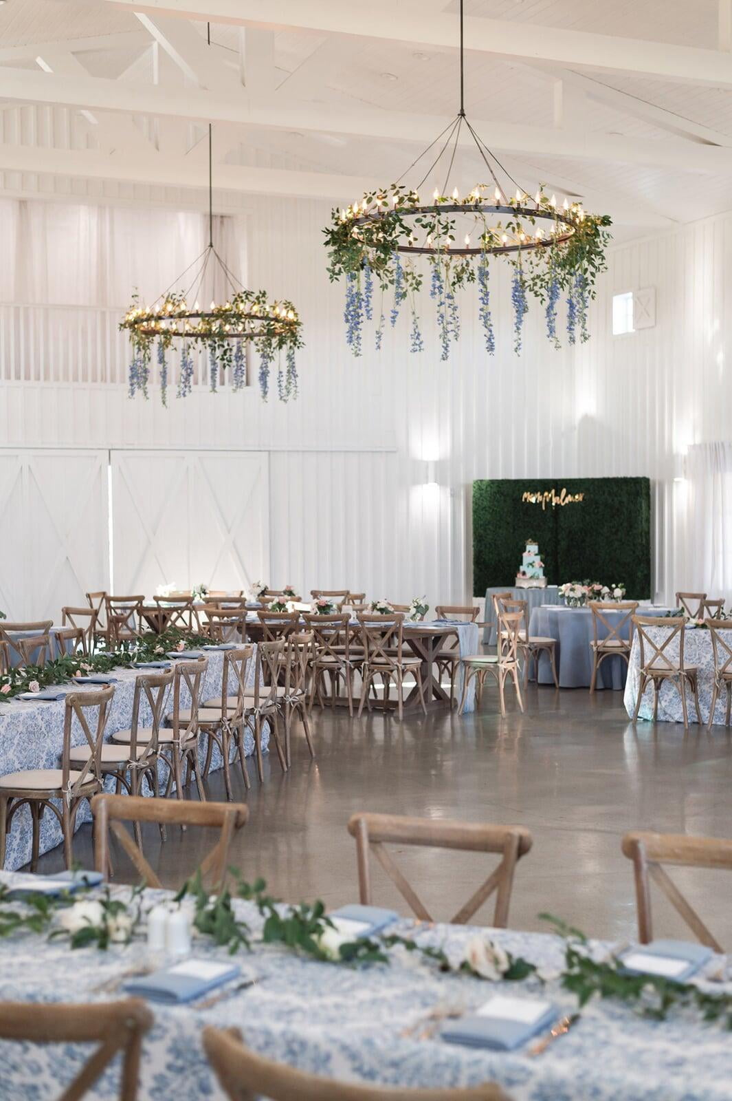 Lily and Elijah's wedding was colorful and fun, and those colors we're prominent in their wedding invitation suite with blue envelopes, a blush silk ribbon, and grey type — all with a simple and clean design. The suite featured a floral envelope liner in blush, which was also present on the menus. Guests found their seats via an escort display of Topo-Chico bottles, which served as their favor.