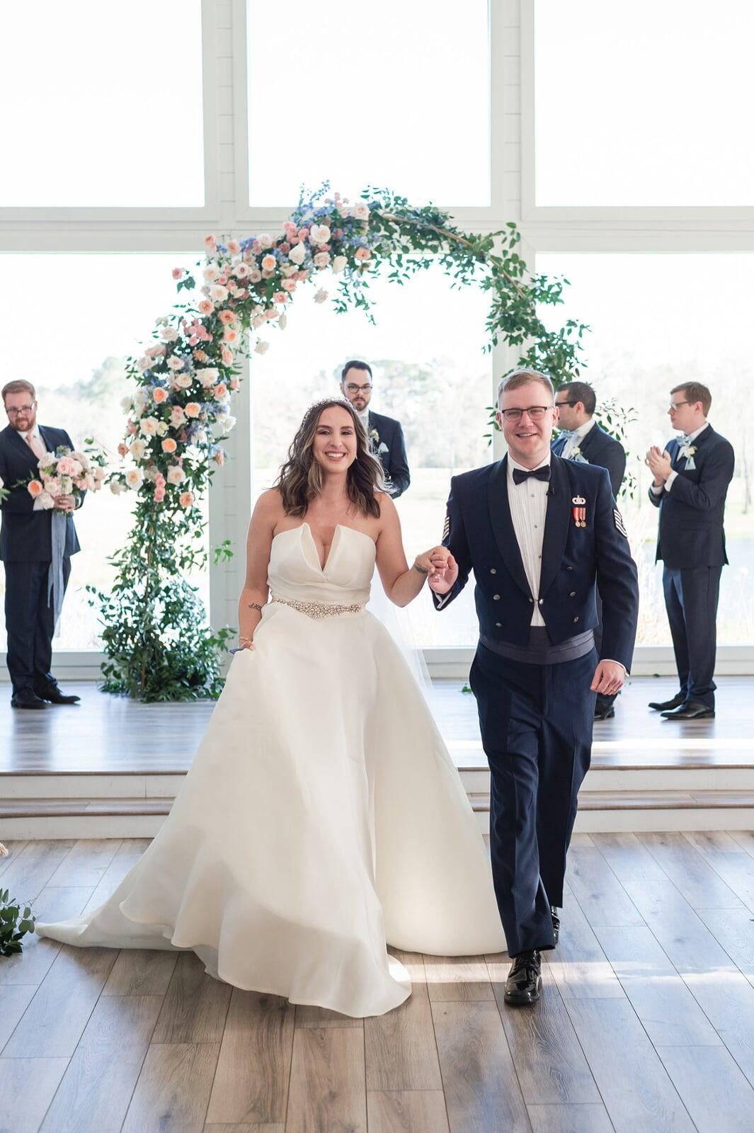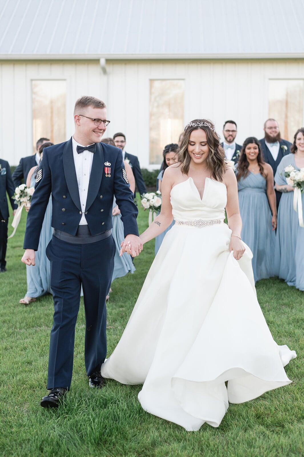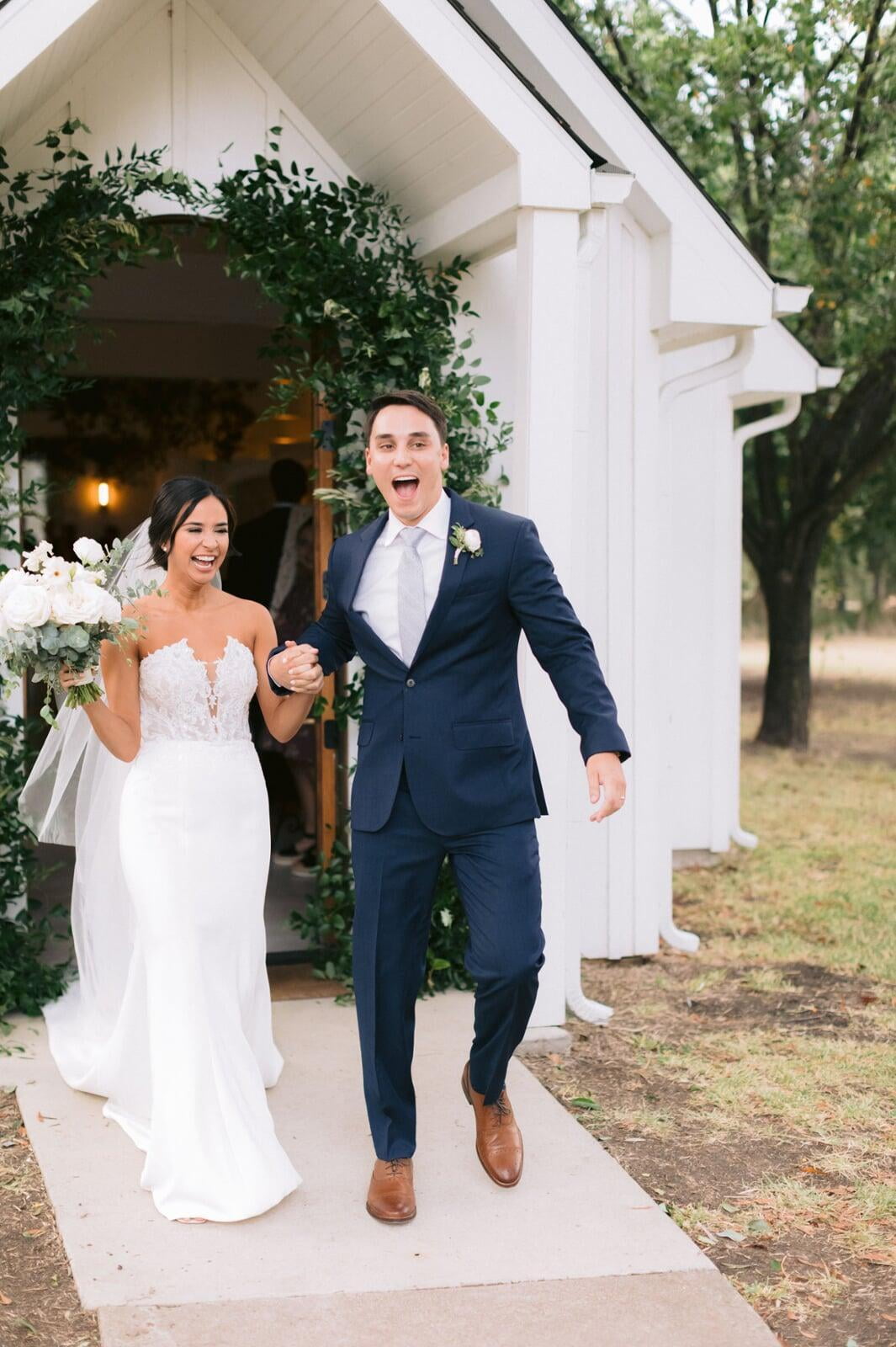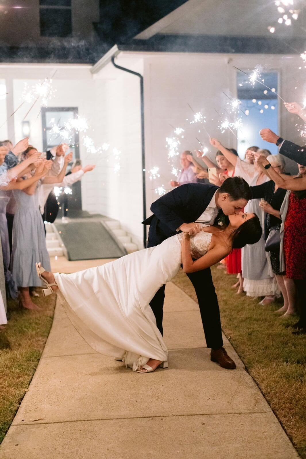 Lily and Elijah's wedding was colorful and fun, and those colors we're prominent in their wedding invitation suite with blue envelopes, a blush silk ribbon, and grey type — all with a simple and clean design. The suite featured a floral envelope liner in blush, which was also present on the menus. Guests found their seats via an escort display of Topo-Chico bottles, which served as their favor.