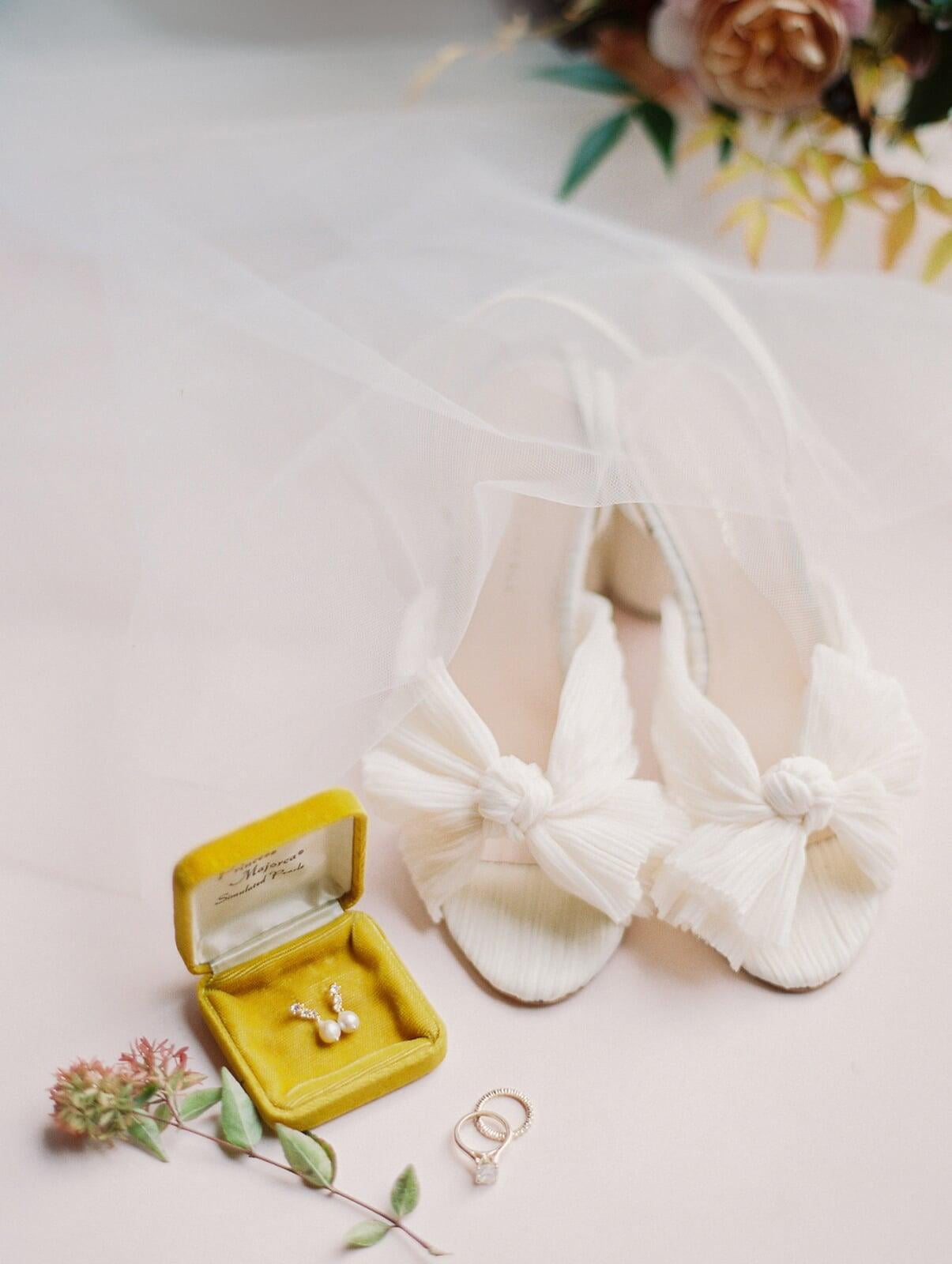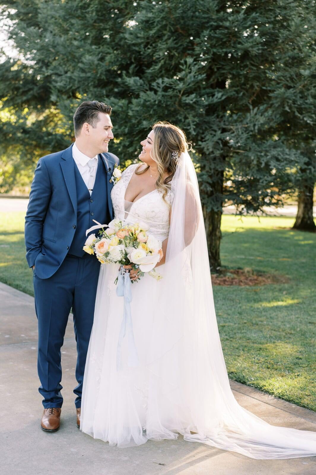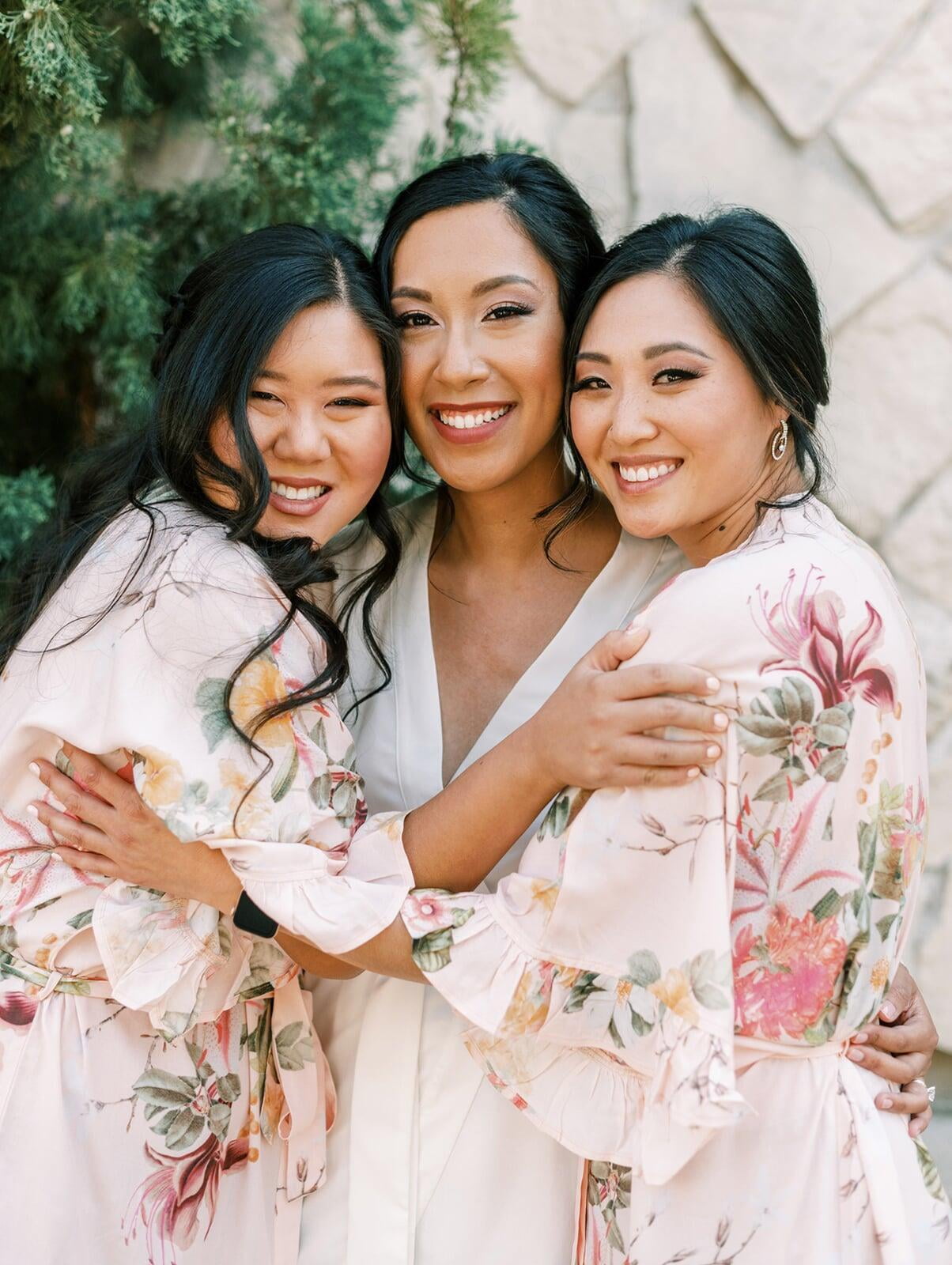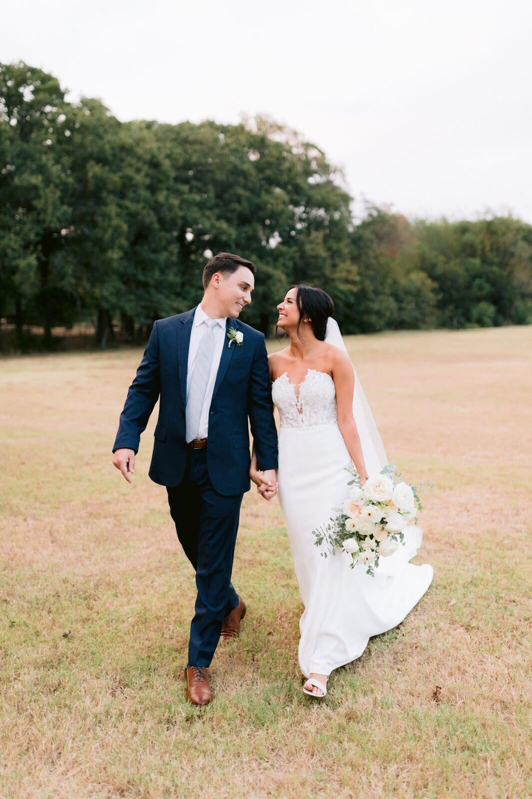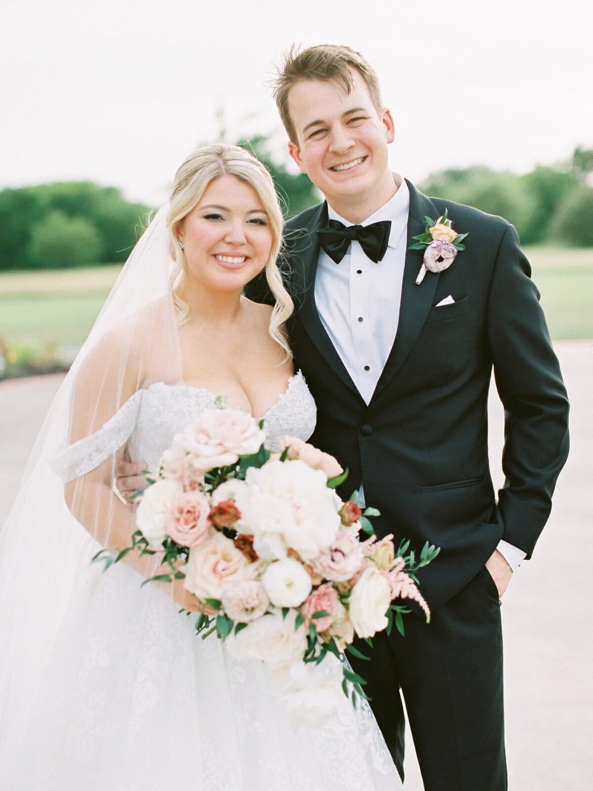 Lily and Elijah's wedding was colorful and fun, and those colors we're prominent in their wedding invitation suite with blue envelopes, a blush silk ribbon, and grey type — all with a simple and clean design. The suite featured a floral envelope liner in blush, which was also present on the menus. Guests found their seats via an escort display of Topo-Chico bottles, which served as their favor.