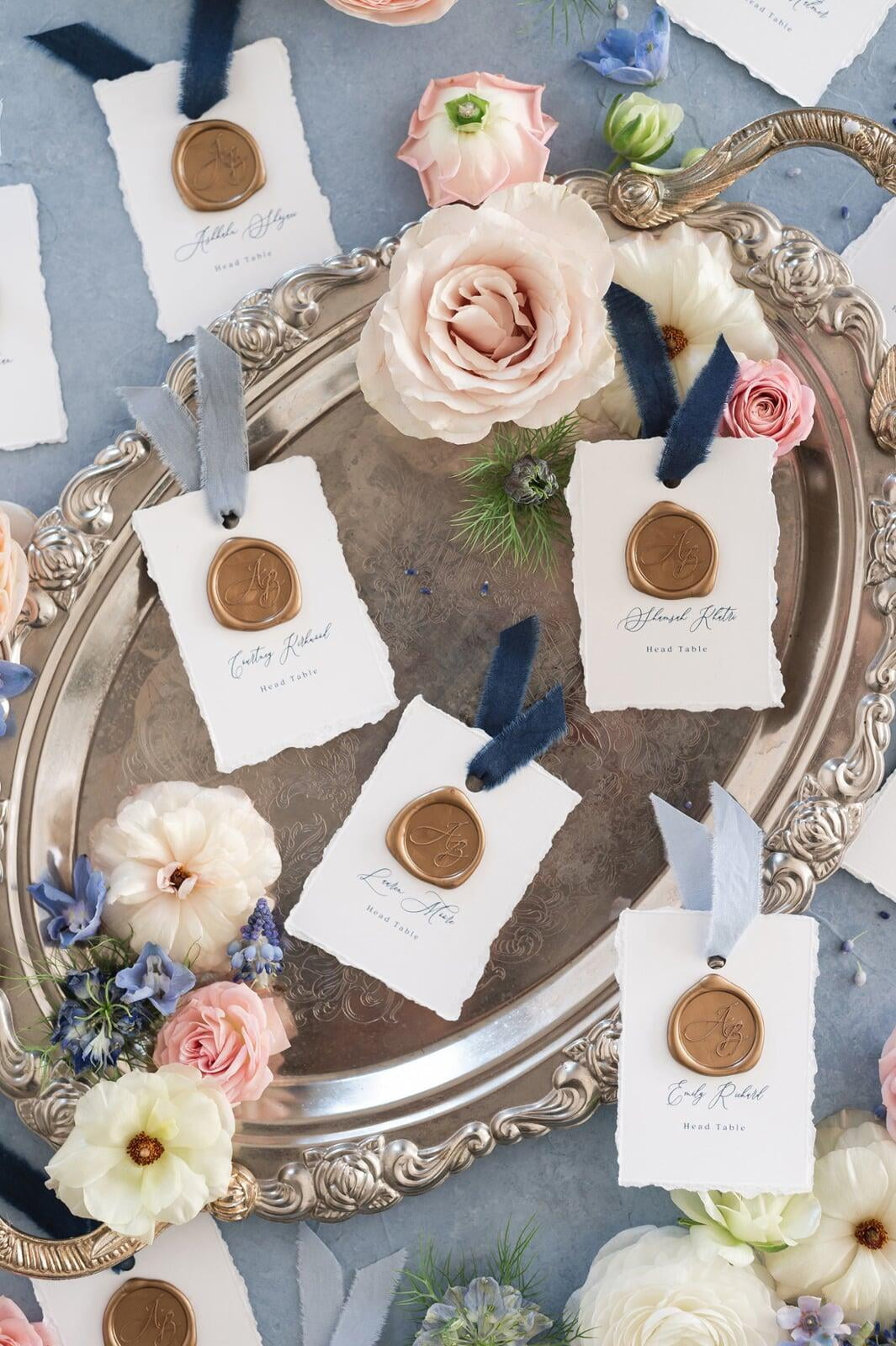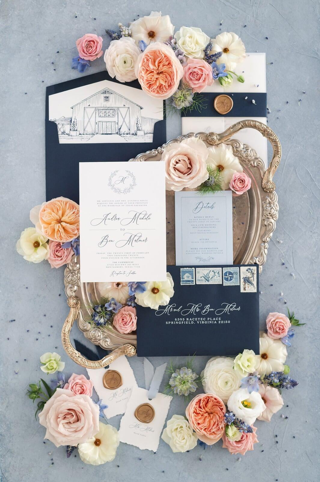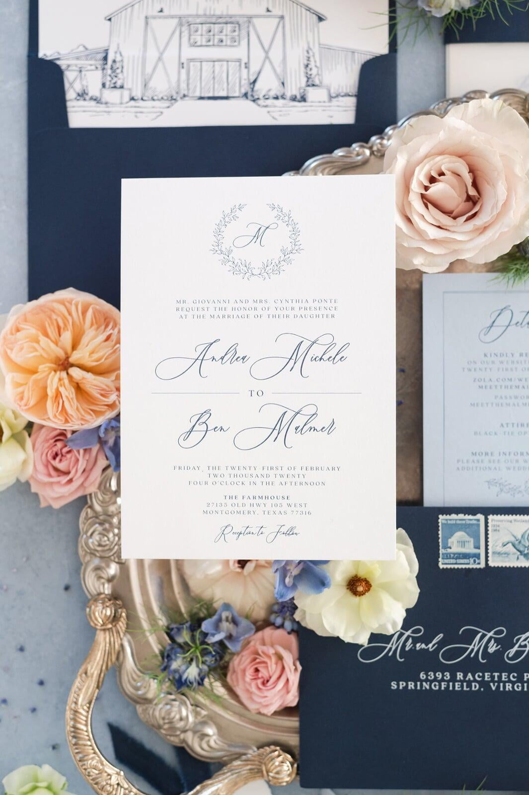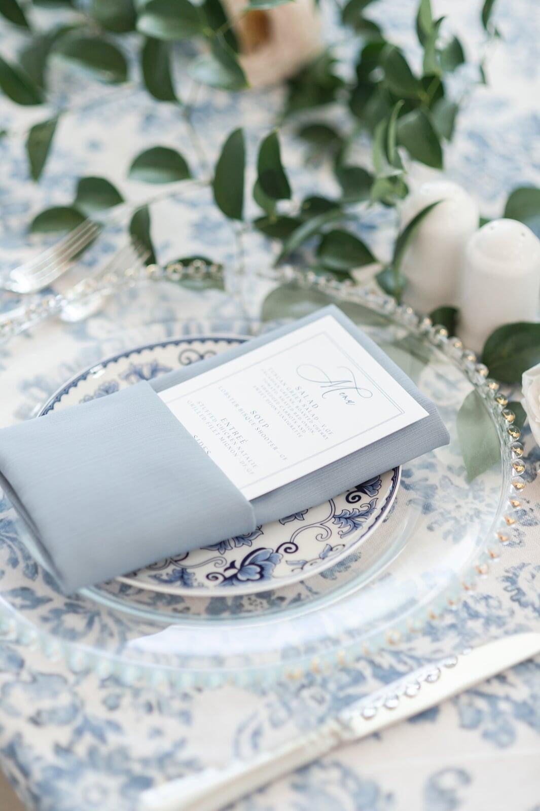 Andrea and Ben wanted a classically formal affair — with nods to the traditional, but with a modern twist. The invitation suite is lead with the couple's monogram, featuring delicate greenery and swirly calligraphy. The suite was wrapped in vellum and bound with a navy band and gold wax seal. The envelope liner featured a hand-drawn sketch of their venue. Guests found their seats by finding their name on a deckled escort card decorated with a wax seal and hung with linen ribbon on a trellis. At the table, a clean menu accented the patterned plates and linens.