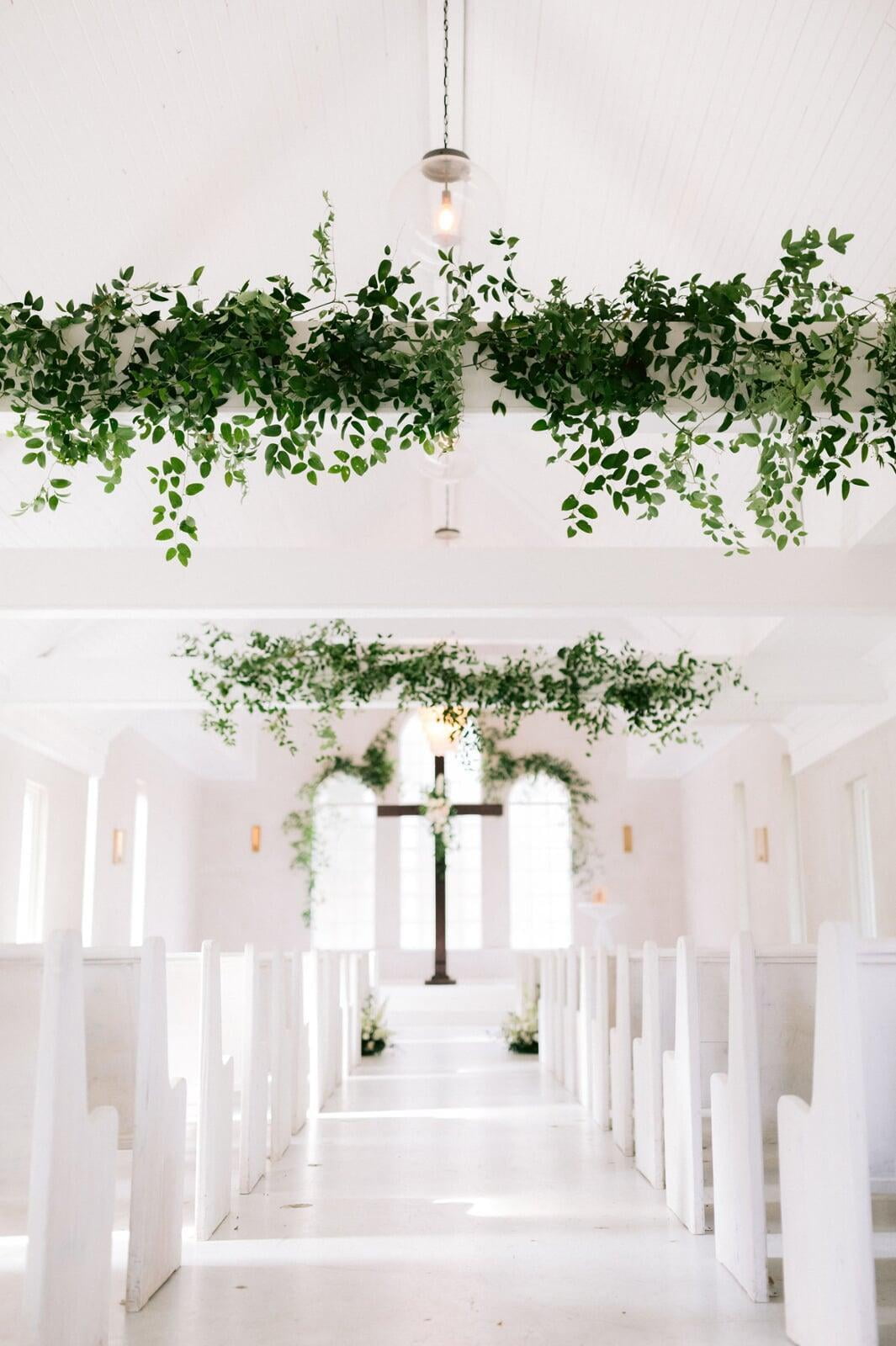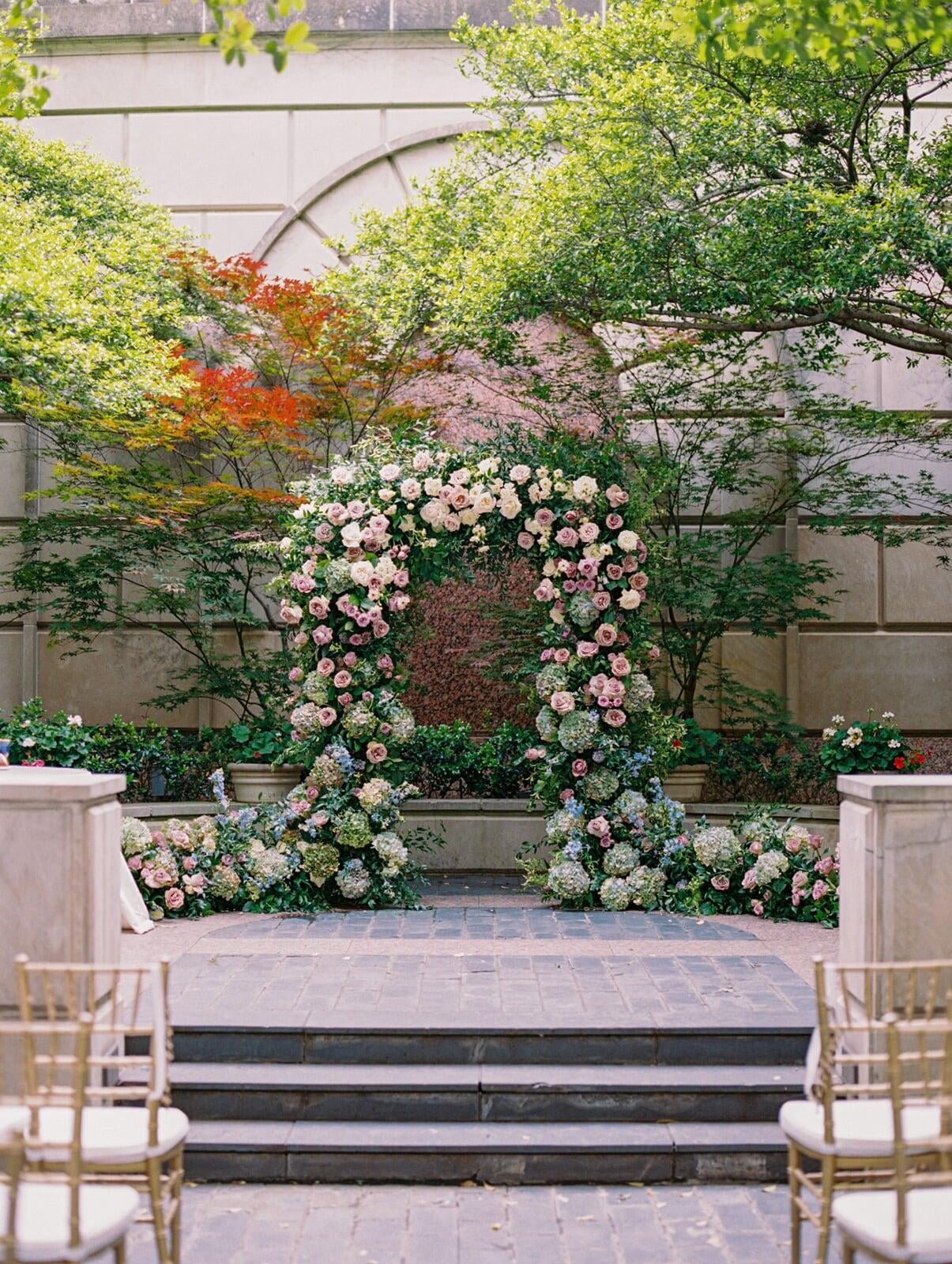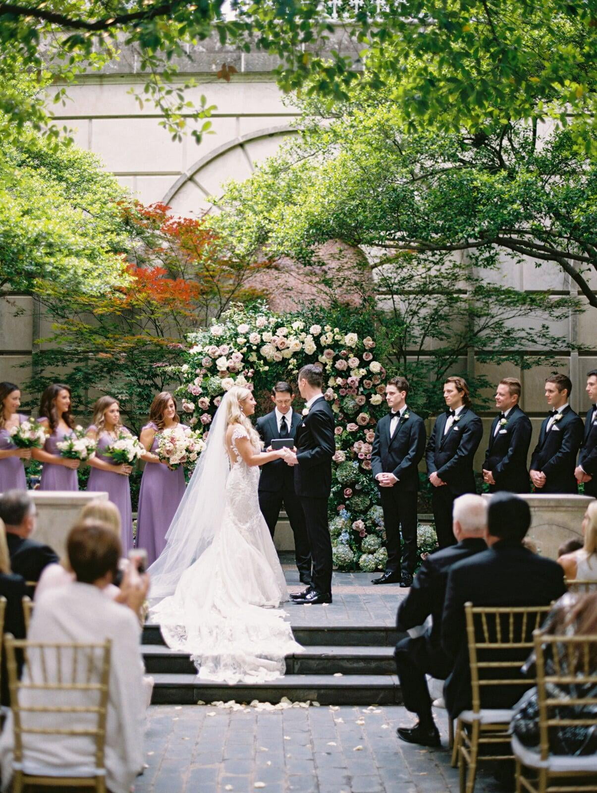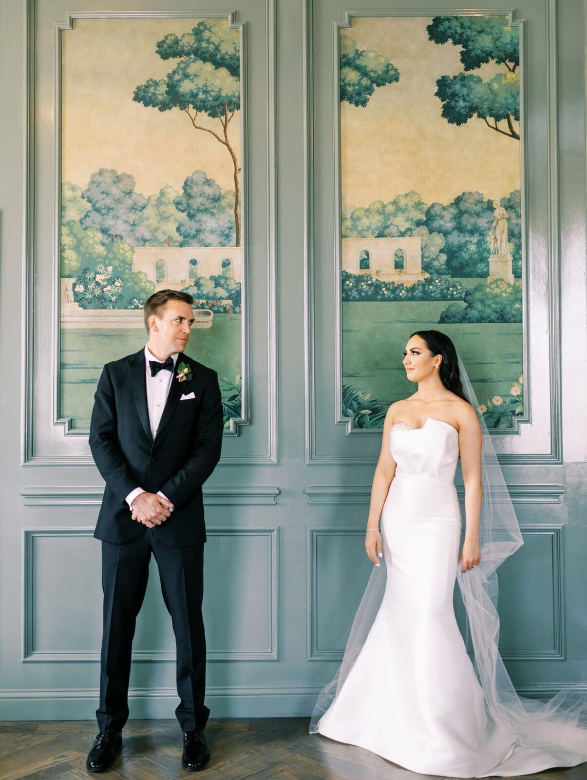 Andrea and Ben wanted a classically formal affair — with nods to the traditional, but with a modern twist. The invitation suite is lead with the couple's monogram, featuring delicate greenery and swirly calligraphy. The suite was wrapped in vellum and bound with a navy band and gold wax seal. The envelope liner featured a hand-drawn sketch of their venue. Guests found their seats by finding their name on a deckled escort card decorated with a wax seal and hung with linen ribbon on a trellis. At the table, a clean menu accented the patterned plates and linens.