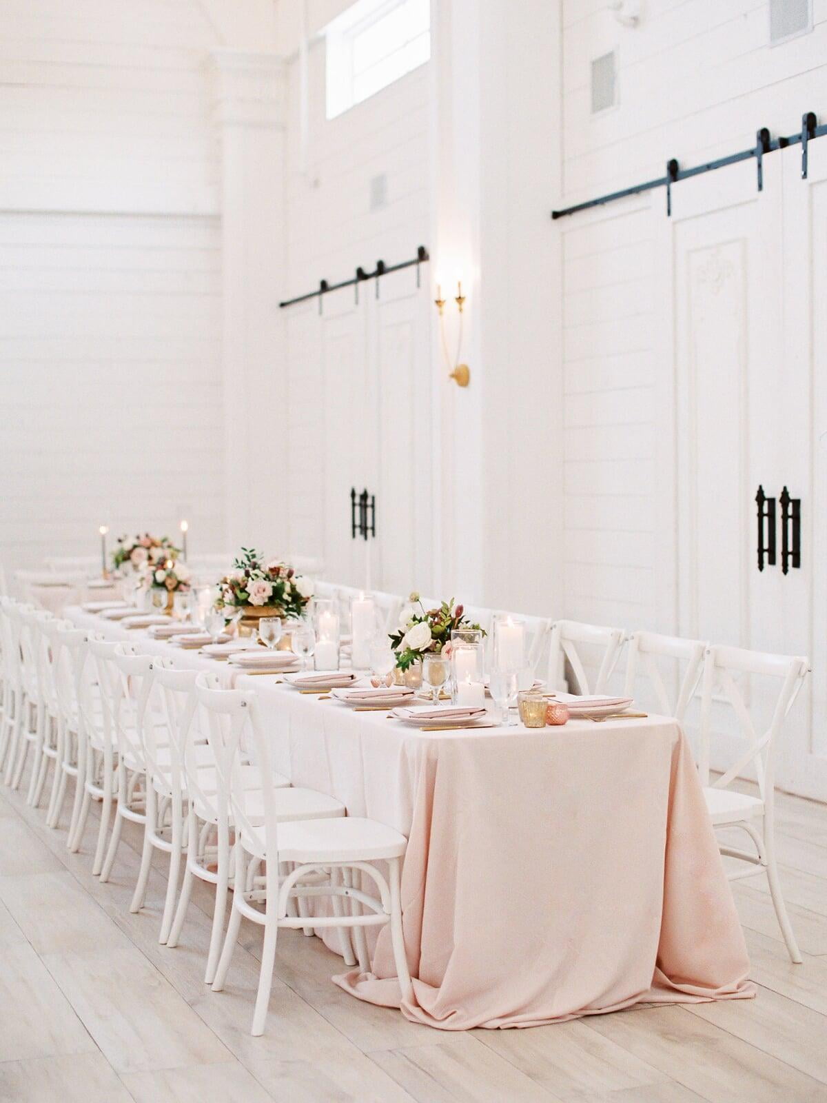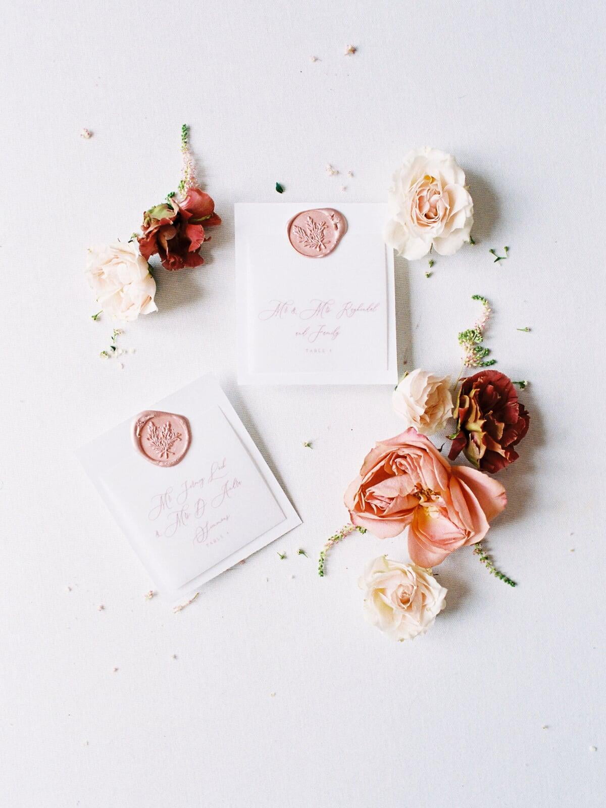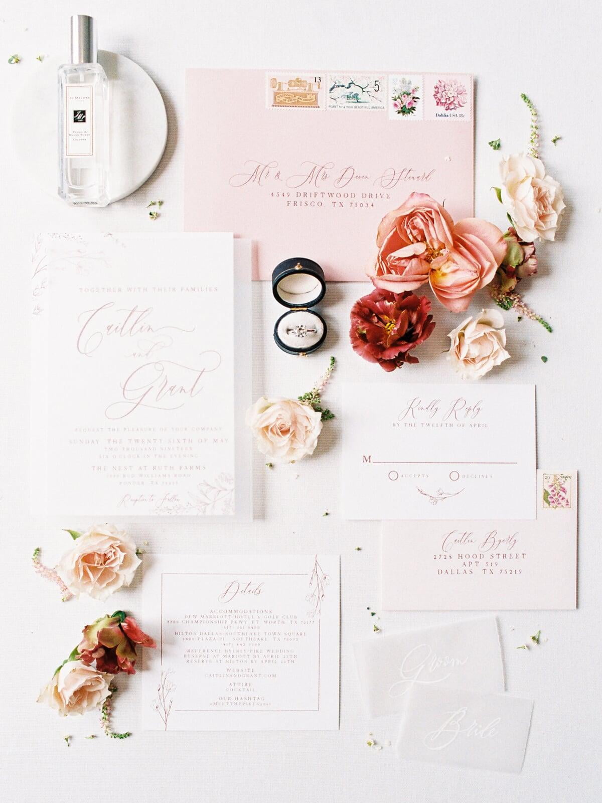 Caitlin and Grant dreamed of a romantic affair. We started with their save the date, which hinted at the couple's color scheme — blush, peachy pink, dusty rose and white, and paired with delicate, line drawn floral. For their invitation suite, we crafted a dual layer effect. Soft florals graced the corners of the backing piece, the invitation itself was printed on translucent vellum. Their guests found their seats via vellum place cards adhered with wax seals on a blush escort display. A splash of florals graced the top of the menu, and vellum place cards with white ink marked guest's seats at the table.