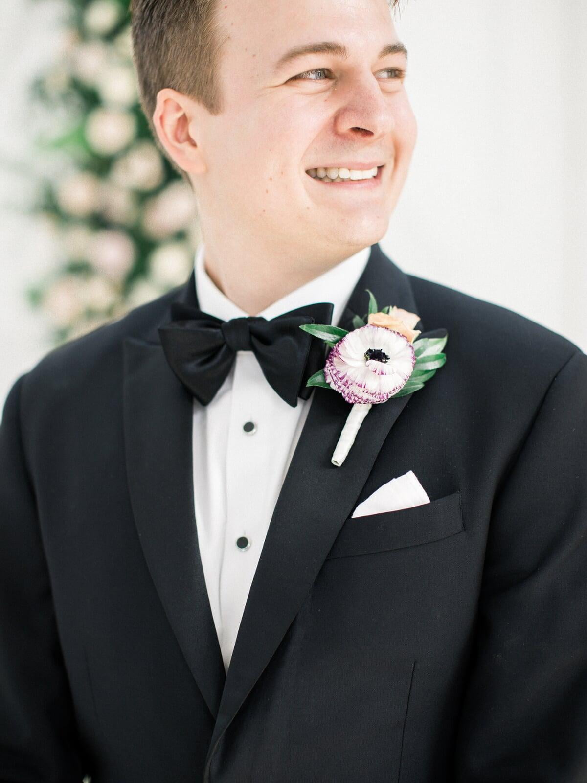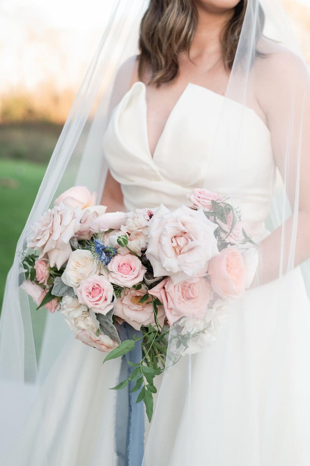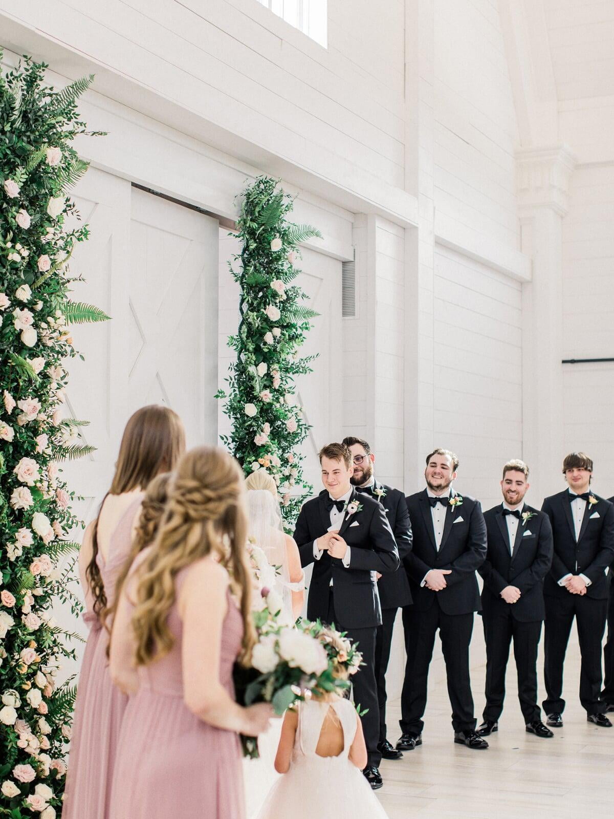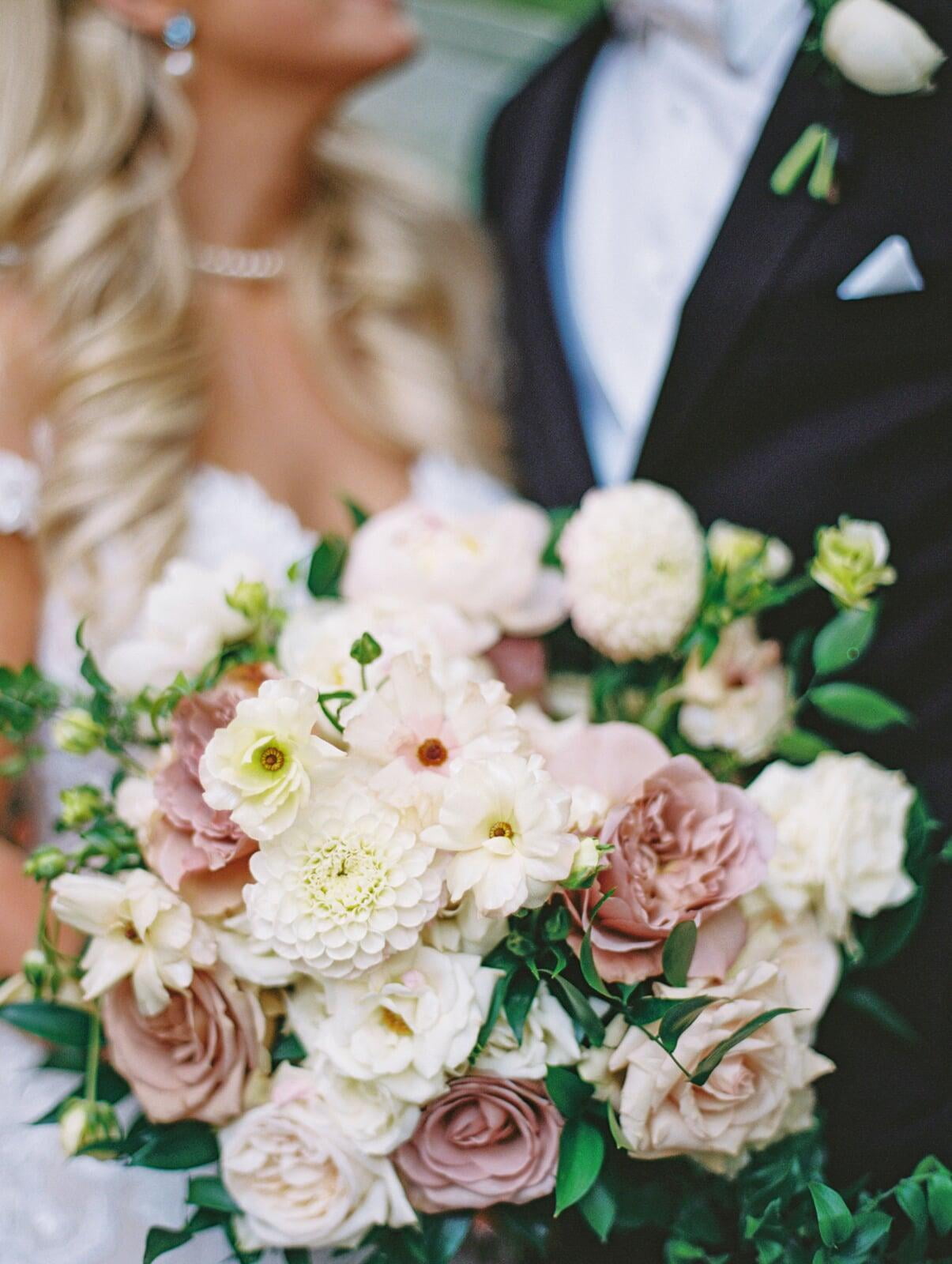 Caitlin and Grant dreamed of a romantic affair. We started with their save the date, which hinted at the couple's color scheme — blush, peachy pink, dusty rose and white, and paired with delicate, line drawn floral. For their invitation suite, we crafted a dual layer effect. Soft florals graced the corners of the backing piece, the invitation itself was printed on translucent vellum. Their guests found their seats via vellum place cards adhered with wax seals on a blush escort display. A splash of florals graced the top of the menu, and vellum place cards with white ink marked guest's seats at the table.