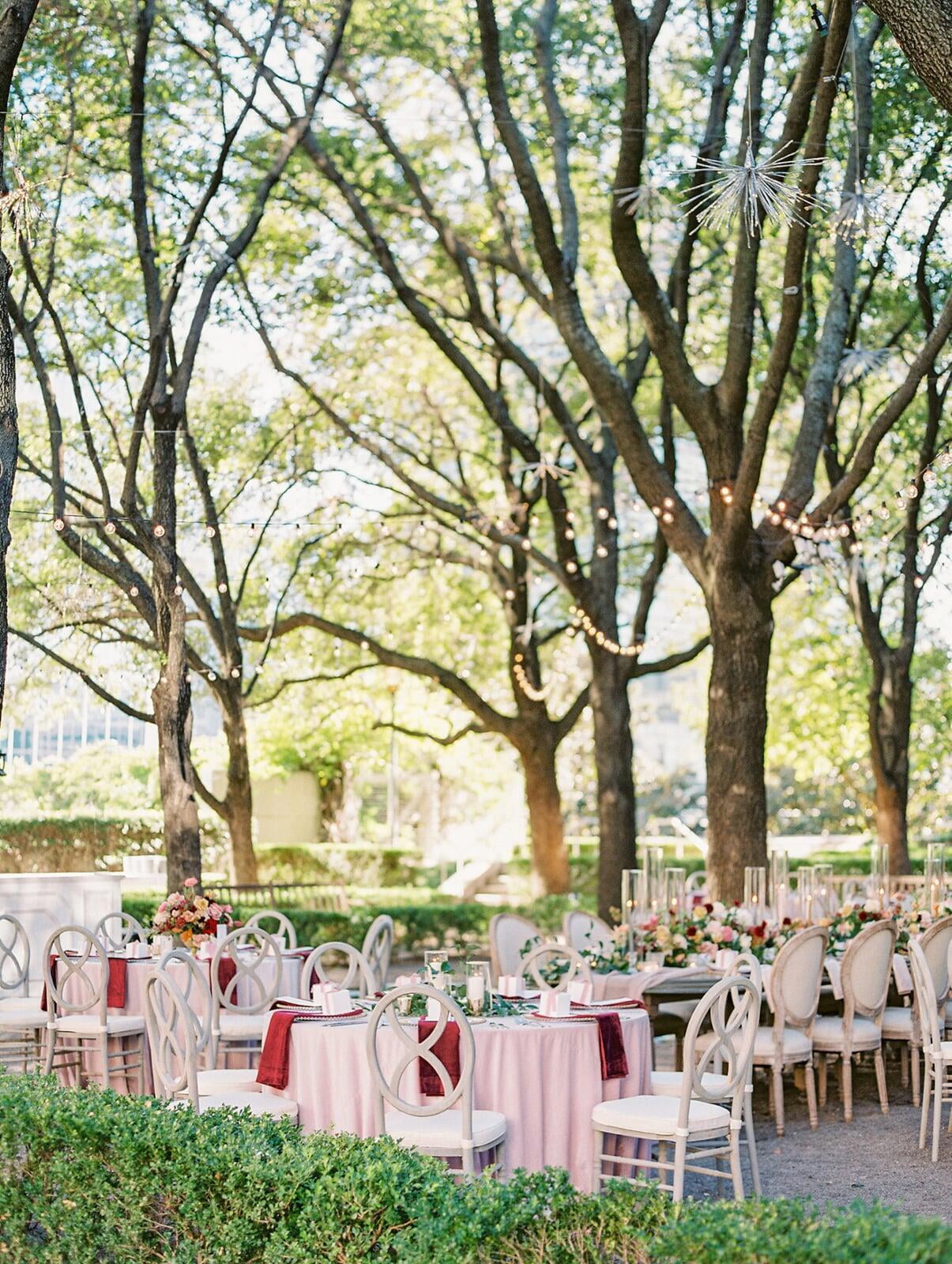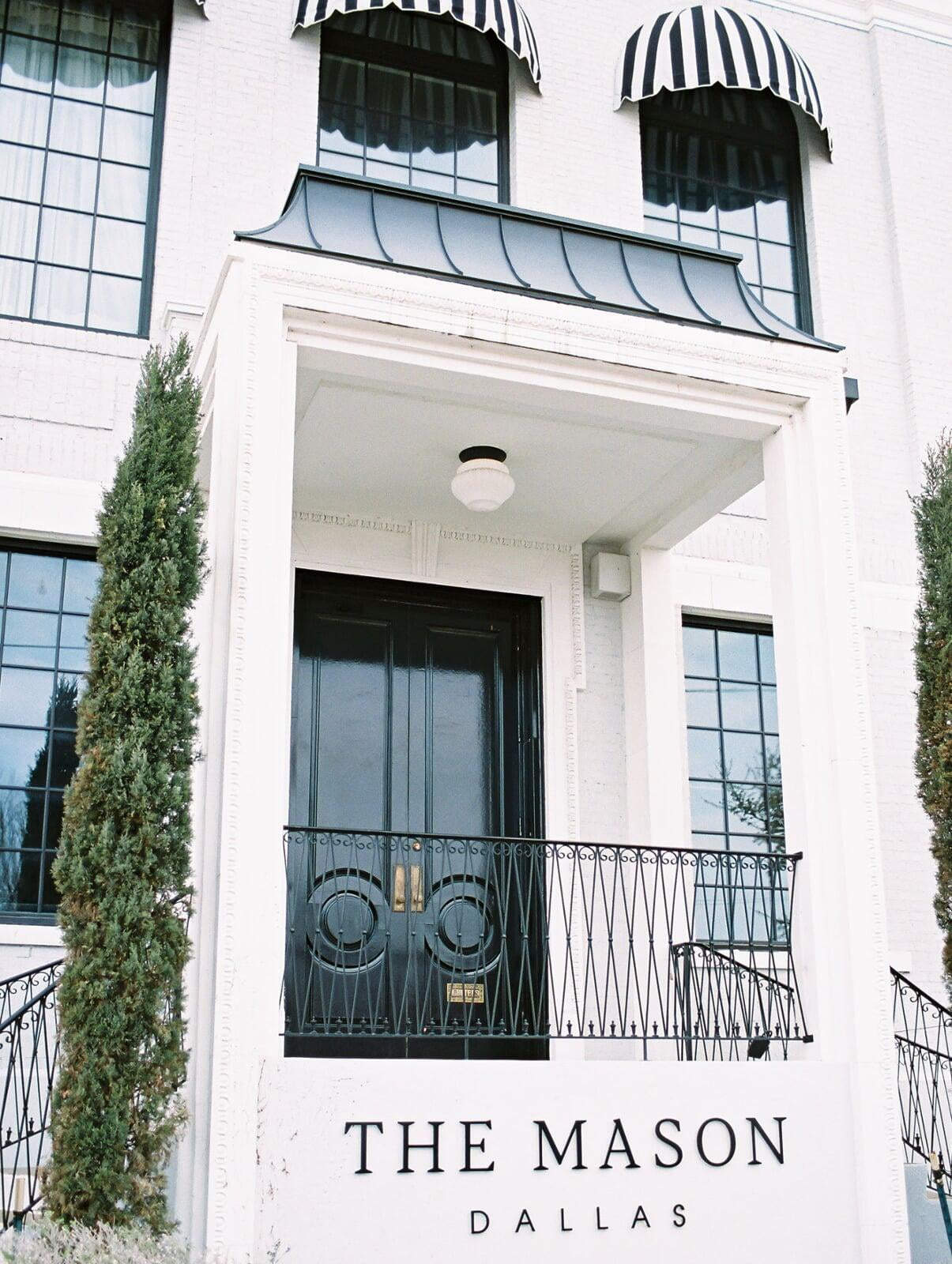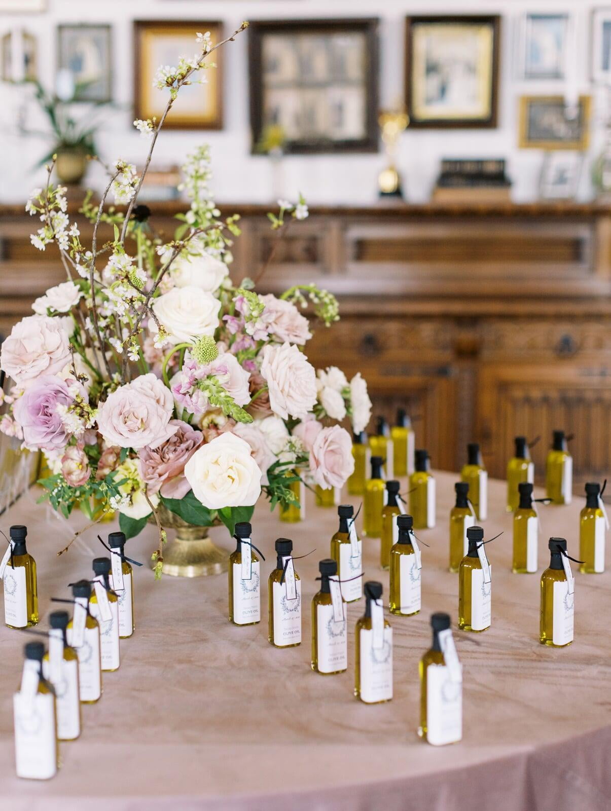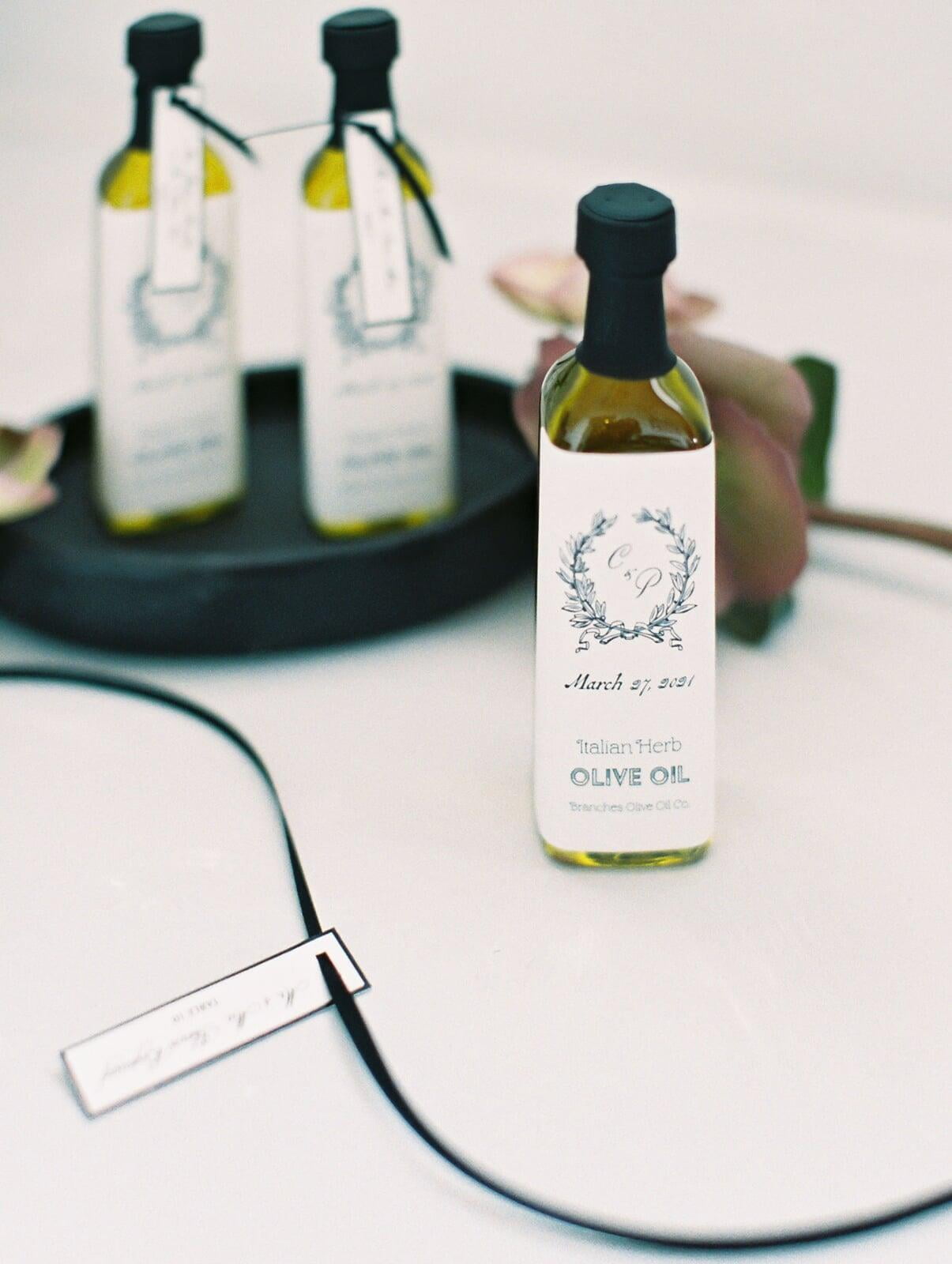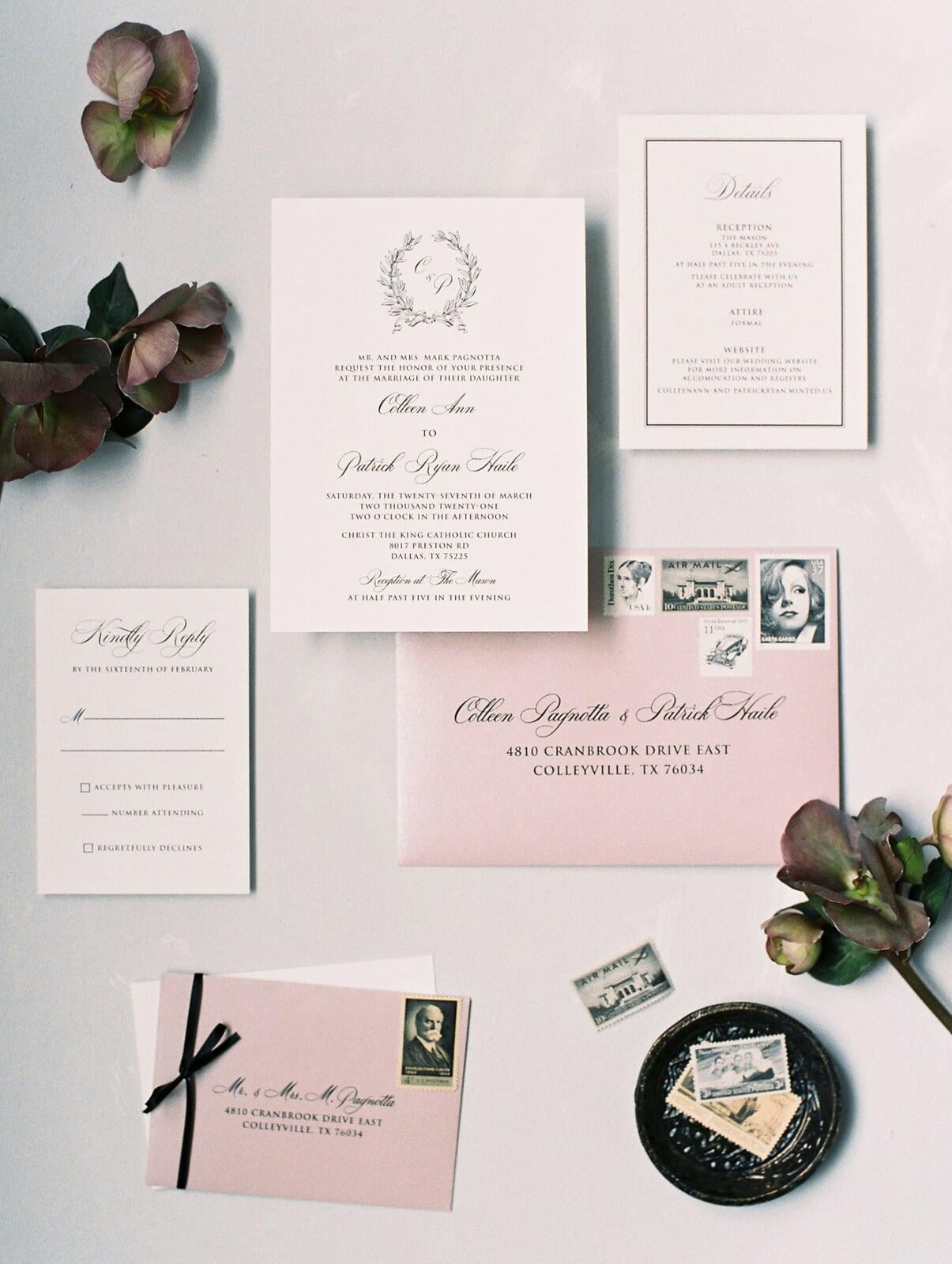 Colleen and Patrick were married in Christ the King Catholic Church with reception to follow at The Mason in Dallas, Texas. The couple's invitation suite included a simple laurel wreath monogram and mauve envelopes paired with vintage postage. Their place cards were delicate deckled edge scrolls placed upon glasses. Their escort cards doubled as favors — miniature olive oil bottles with their wedding monogram and each guest's seat and table assignment. Their classic, yet modern style was carried throughout the wedding day on menus, bar signage and cocktail napkins. The table setting was complete with a classic black and white menu paired with black satin ribbon weaved through it.