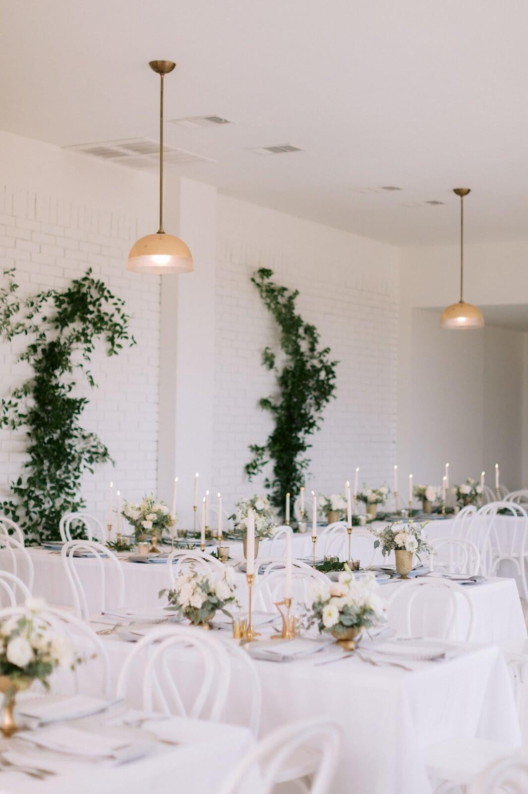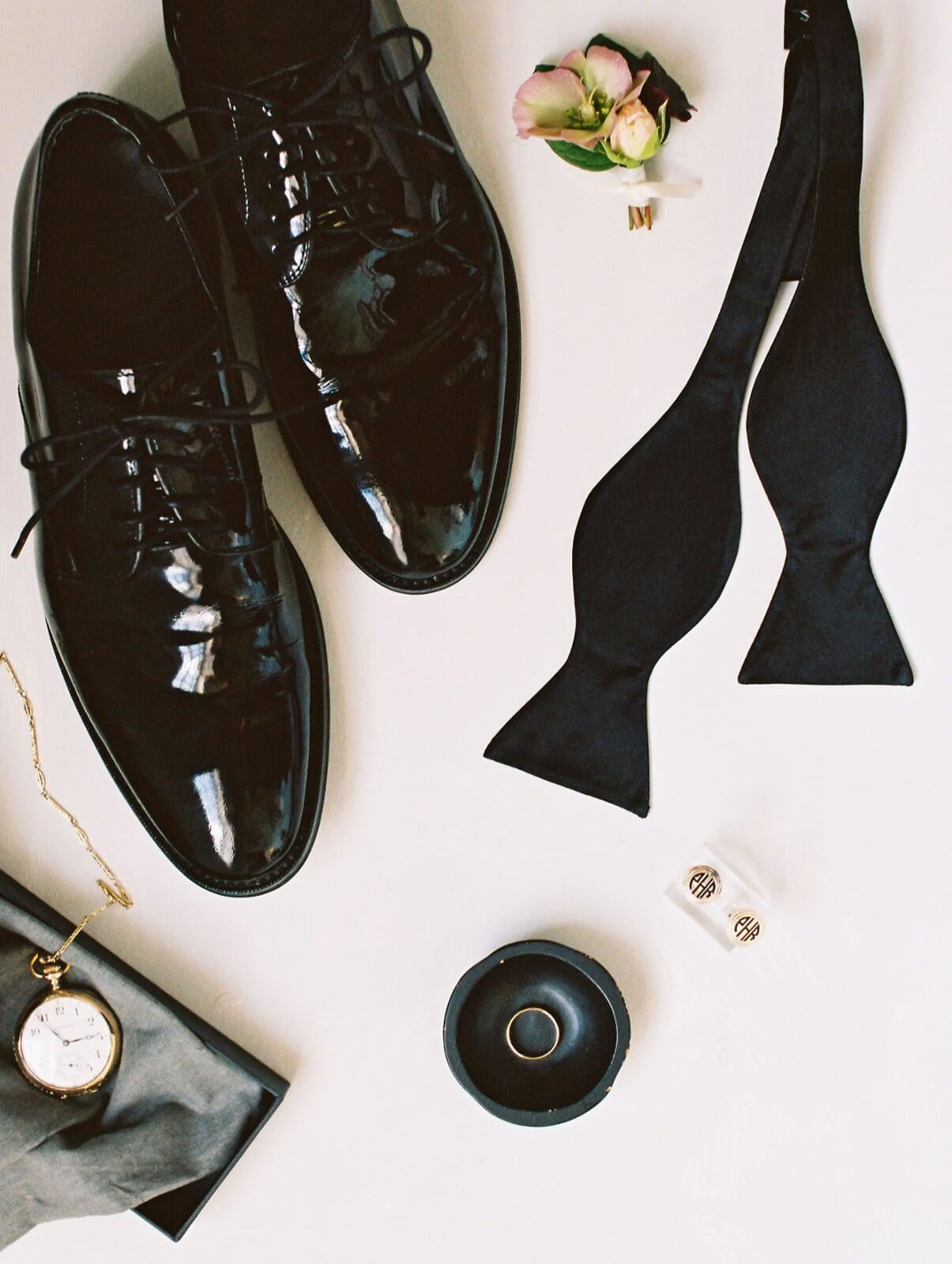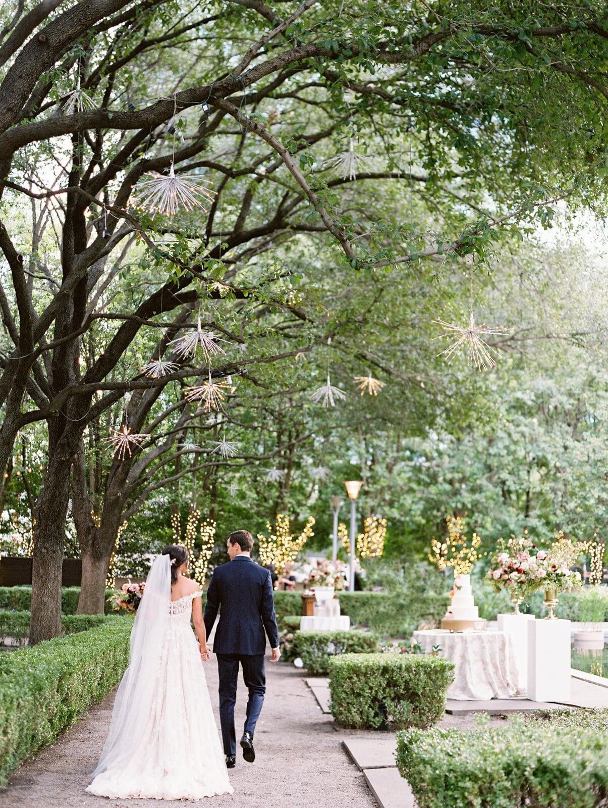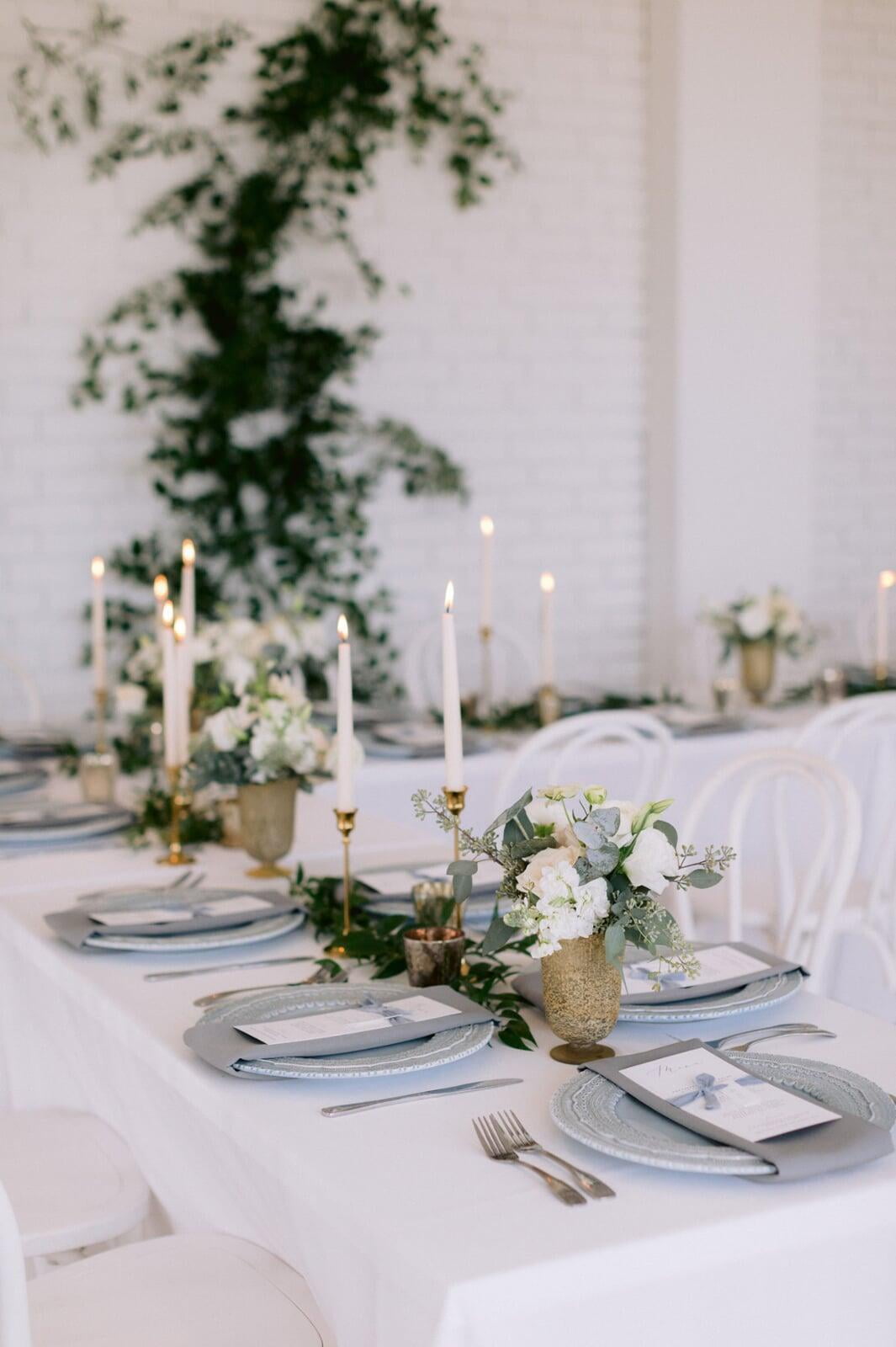 Colleen and Patrick were married in Christ the King Catholic Church with reception to follow at The Mason in Dallas, Texas. The couple's invitation suite included a simple laurel wreath monogram and mauve envelopes paired with vintage postage. Their place cards were delicate deckled edge scrolls placed upon glasses. Their escort cards doubled as favors — miniature olive oil bottles with their wedding monogram and each guest's seat and table assignment. Their classic, yet modern style was carried throughout the wedding day on menus, bar signage and cocktail napkins. The table setting was complete with a classic black and white menu paired with black satin ribbon weaved through it.