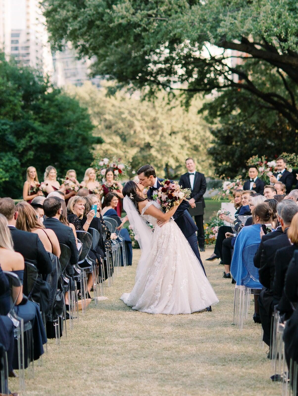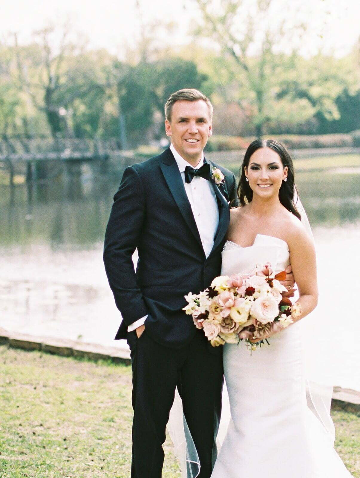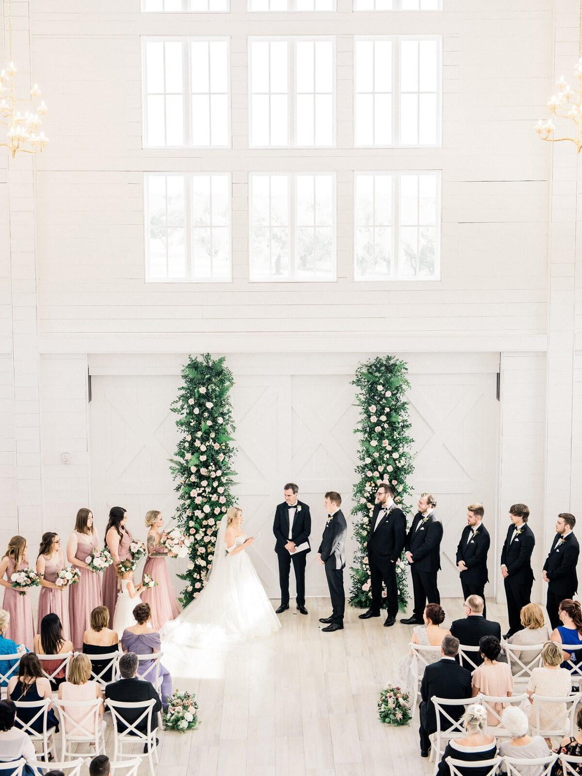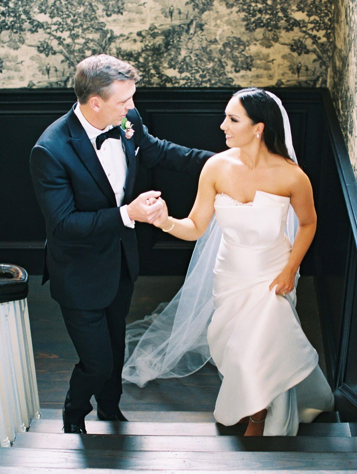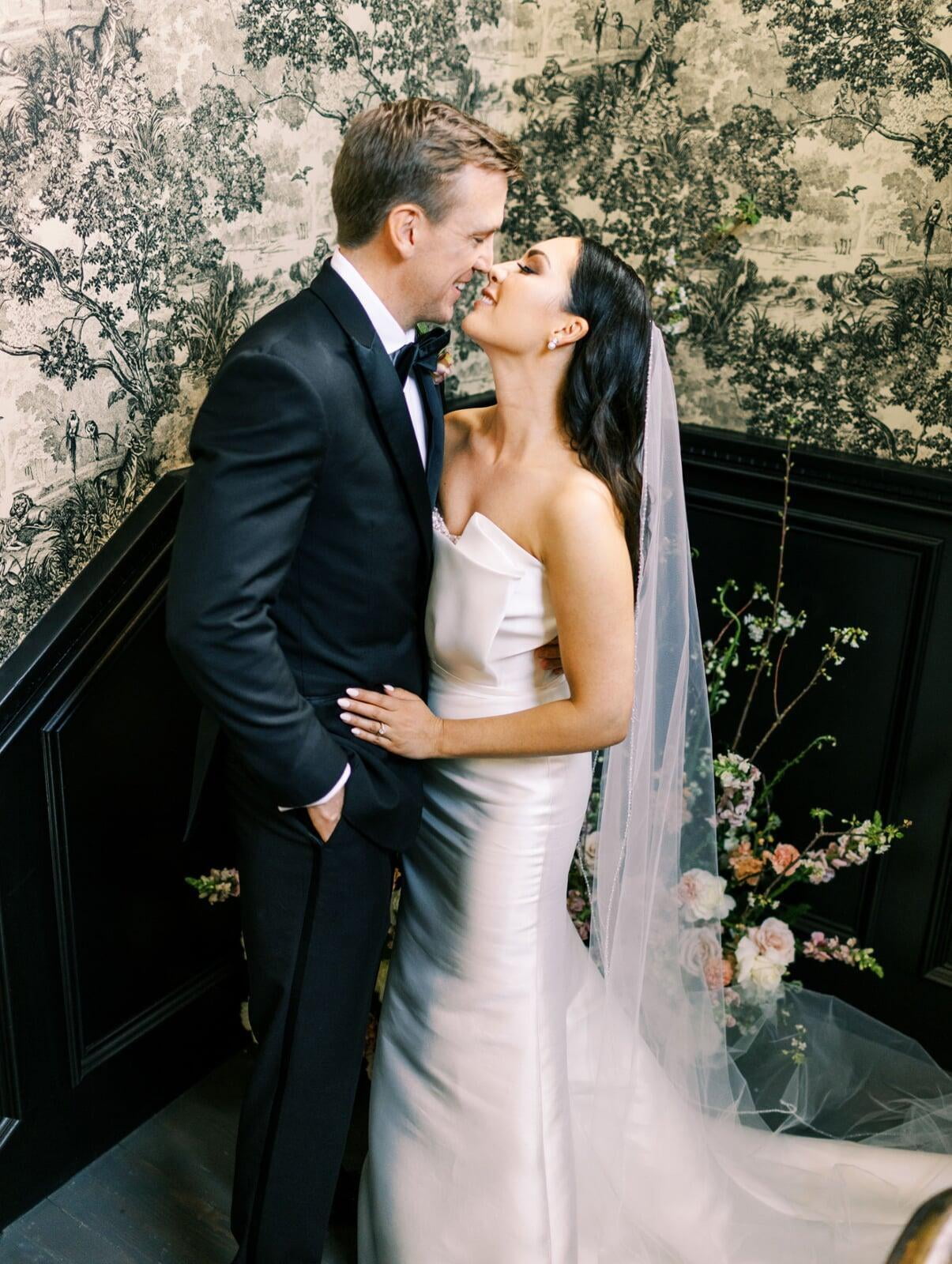 Colleen and Patrick were married in Christ the King Catholic Church with reception to follow at The Mason in Dallas, Texas. The couple's invitation suite included a simple laurel wreath monogram and mauve envelopes paired with vintage postage. Their place cards were delicate deckled edge scrolls placed upon glasses. Their escort cards doubled as favors — miniature olive oil bottles with their wedding monogram and each guest's seat and table assignment. Their classic, yet modern style was carried throughout the wedding day on menus, bar signage and cocktail napkins. The table setting was complete with a classic black and white menu paired with black satin ribbon weaved through it.