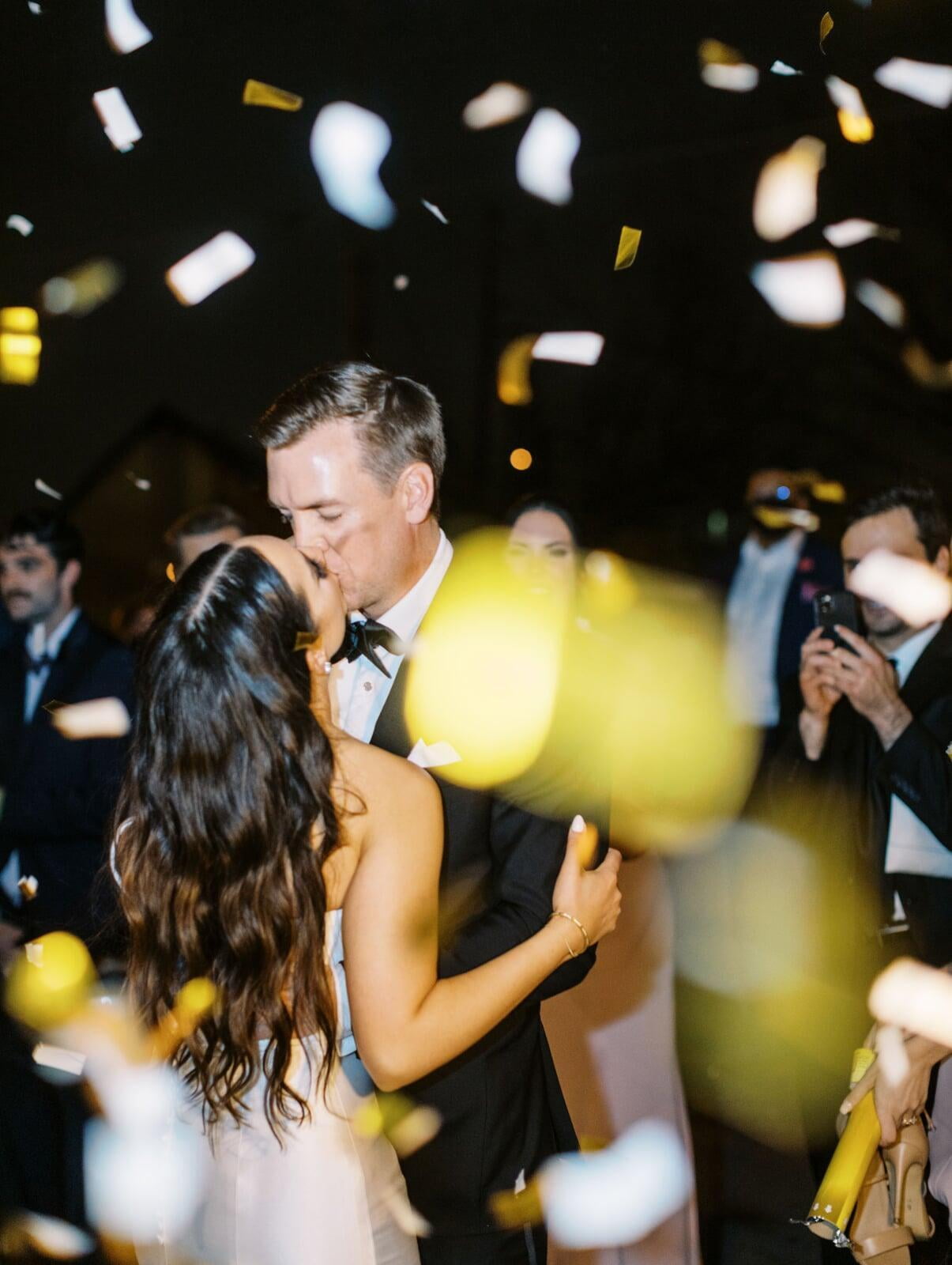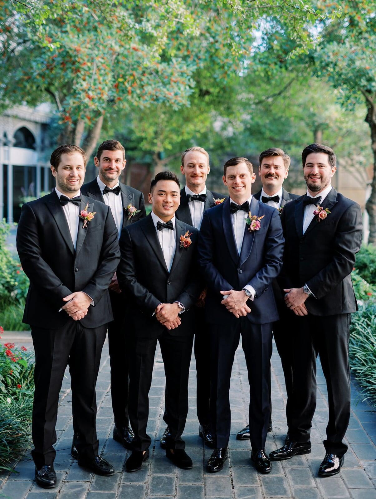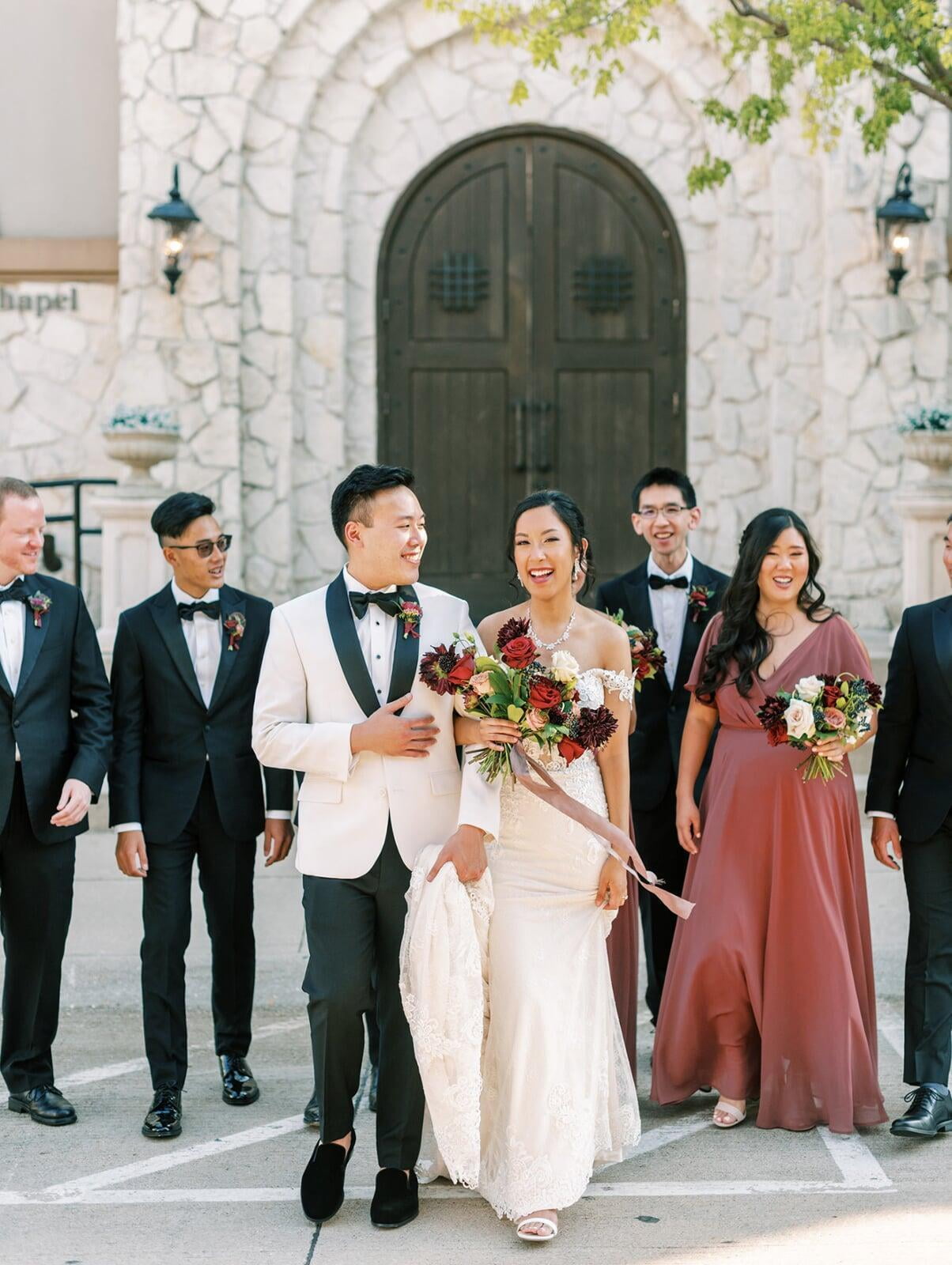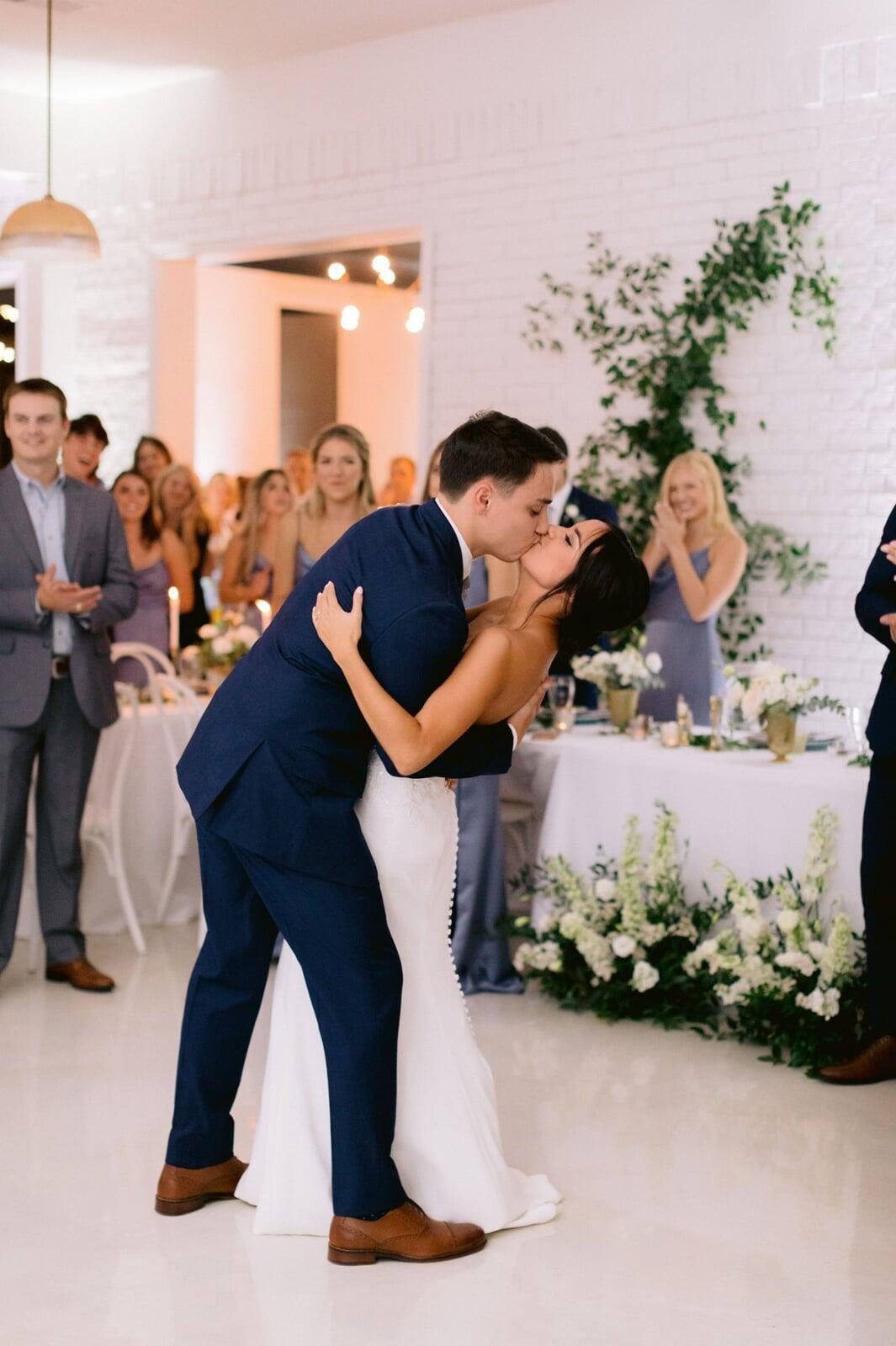 Colleen and Patrick were married in Christ the King Catholic Church with reception to follow at The Mason in Dallas, Texas. The couple's invitation suite included a simple laurel wreath monogram and mauve envelopes paired with vintage postage. Their place cards were delicate deckled edge scrolls placed upon glasses. Their escort cards doubled as favors — miniature olive oil bottles with their wedding monogram and each guest's seat and table assignment. Their classic, yet modern style was carried throughout the wedding day on menus, bar signage and cocktail napkins. The table setting was complete with a classic black and white menu paired with black satin ribbon weaved through it.