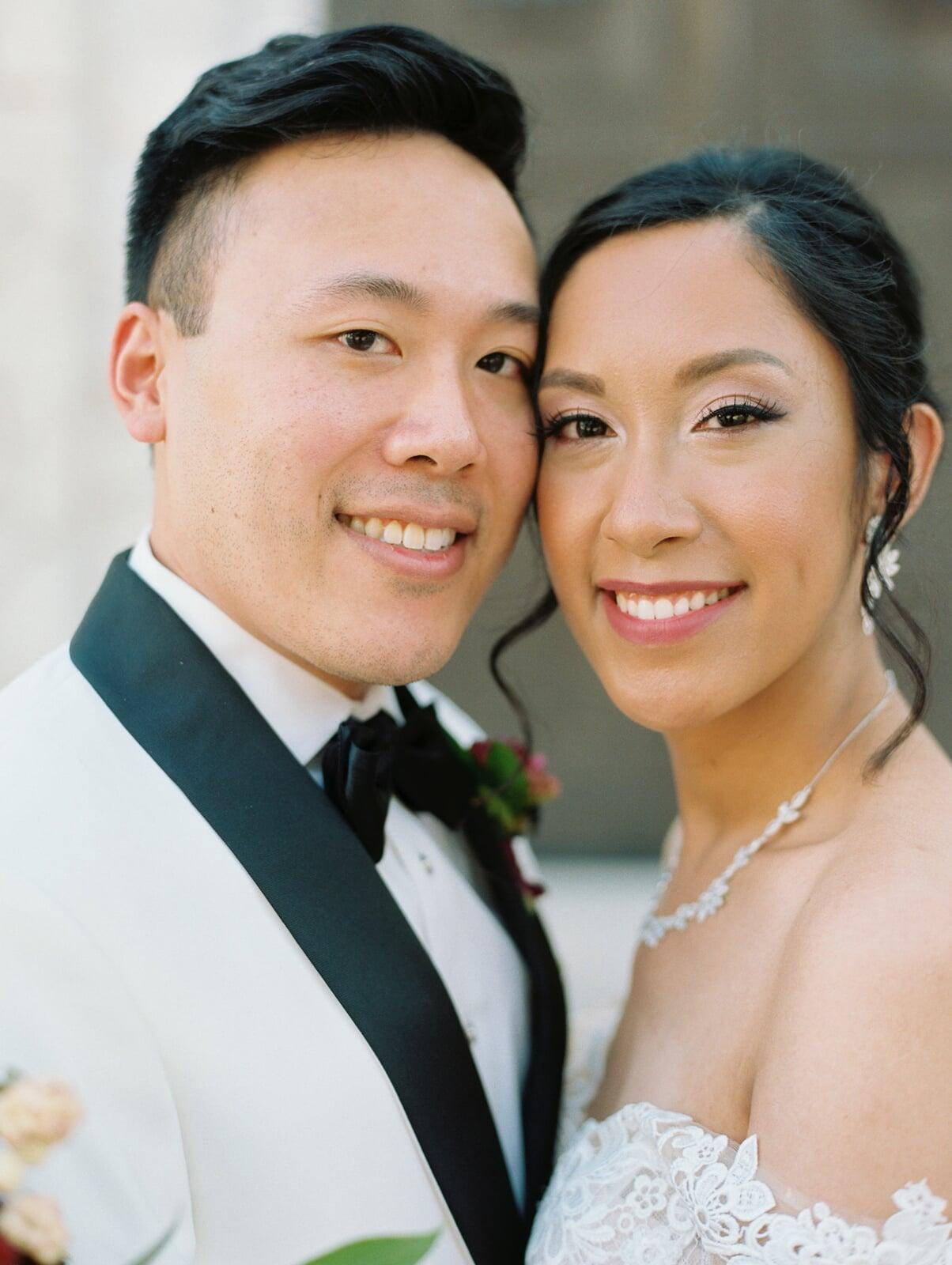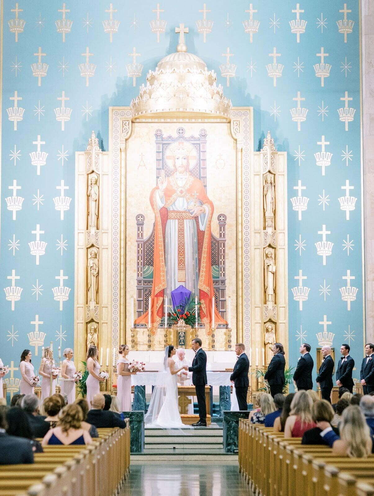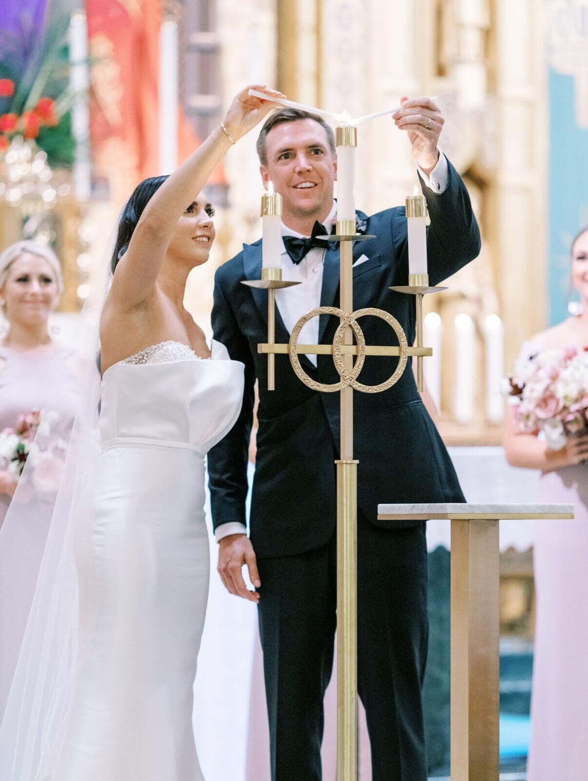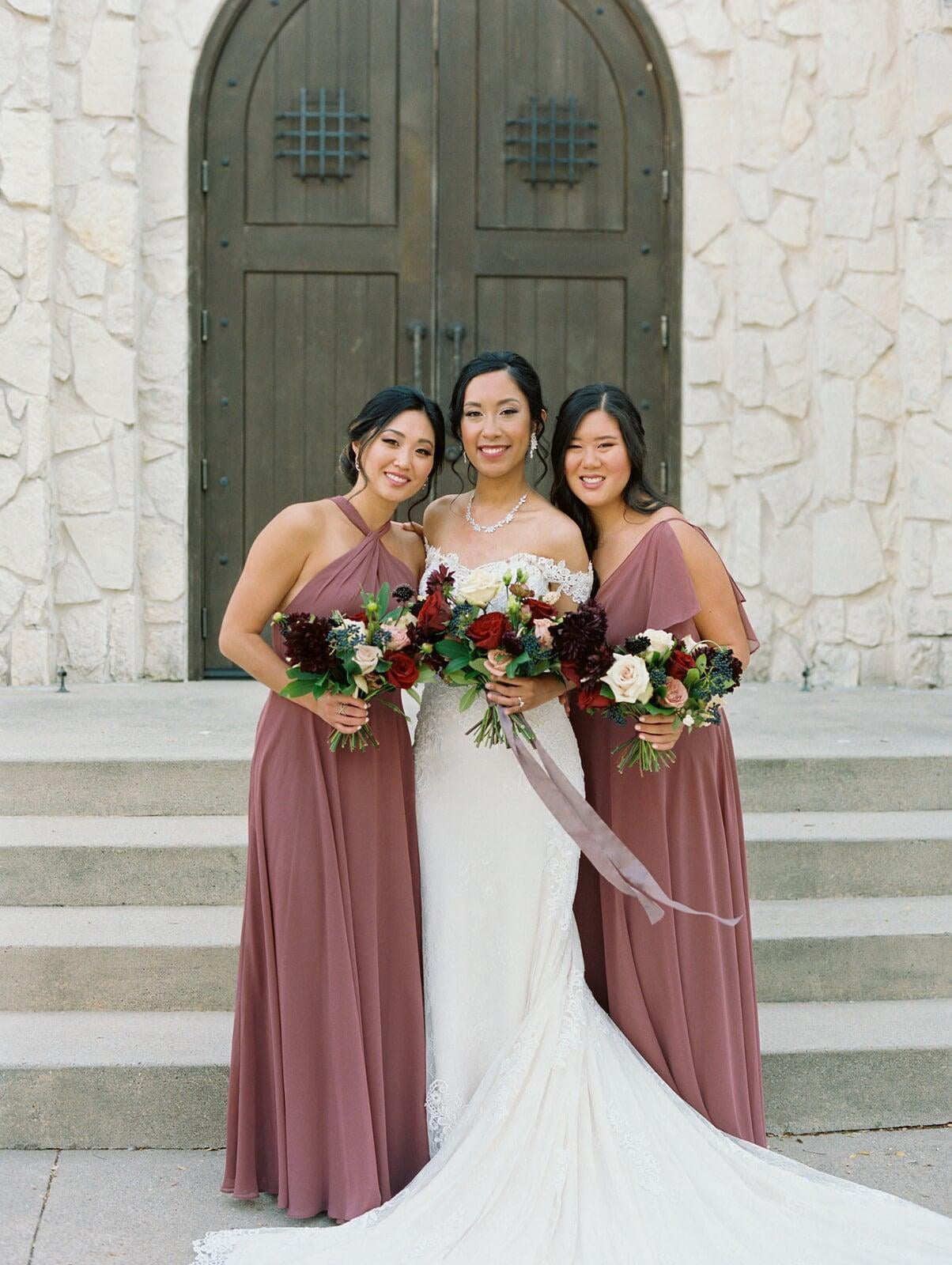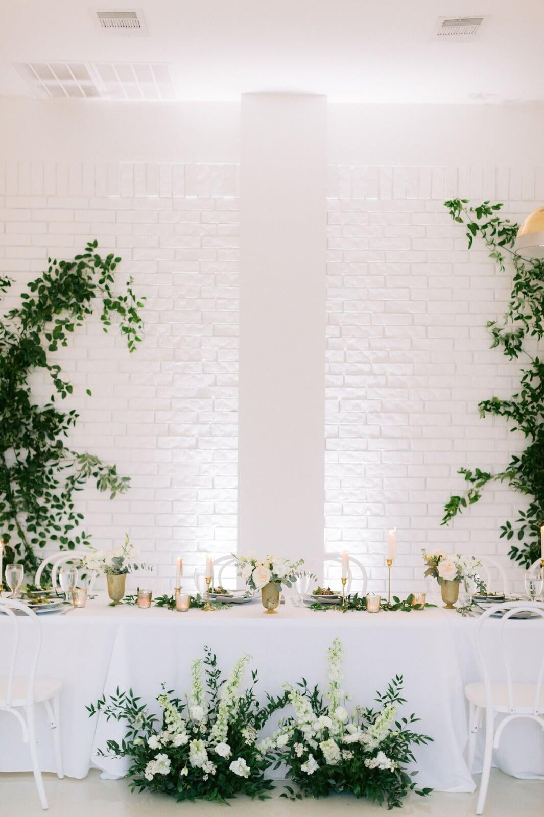 Colleen and Patrick were married in Christ the King Catholic Church with reception to follow at The Mason in Dallas, Texas. The couple's invitation suite included a simple laurel wreath monogram and mauve envelopes paired with vintage postage. Their place cards were delicate deckled edge scrolls placed upon glasses. Their escort cards doubled as favors — miniature olive oil bottles with their wedding monogram and each guest's seat and table assignment. Their classic, yet modern style was carried throughout the wedding day on menus, bar signage and cocktail napkins. The table setting was complete with a classic black and white menu paired with black satin ribbon weaved through it.