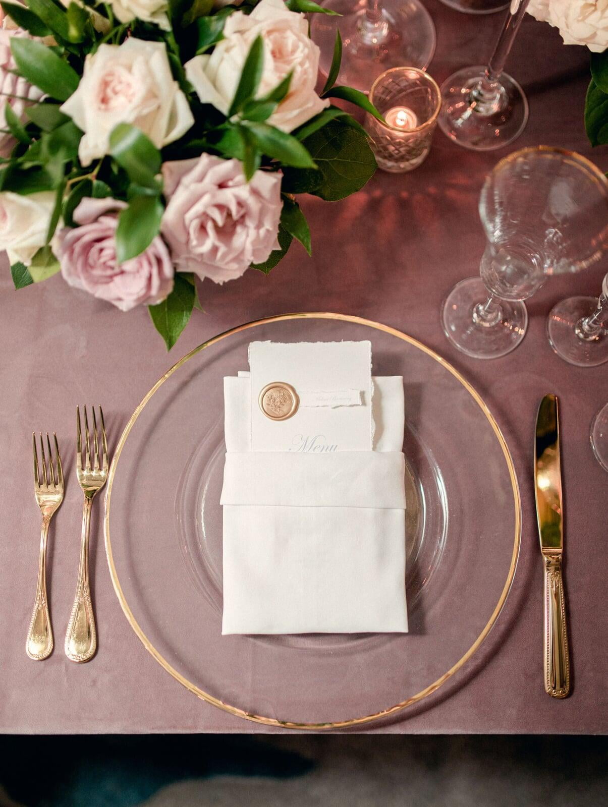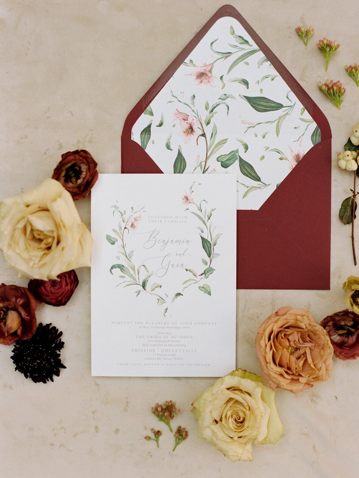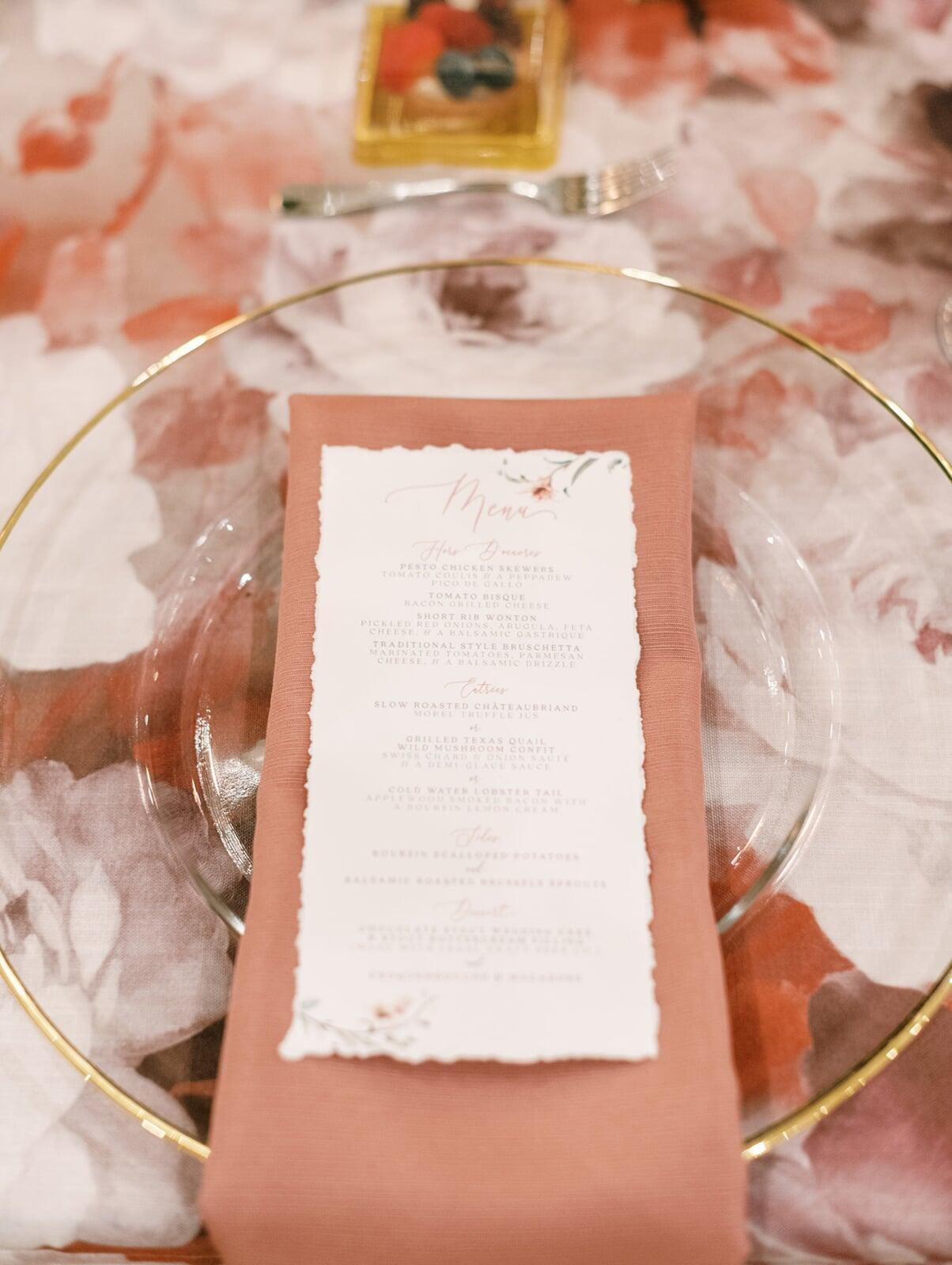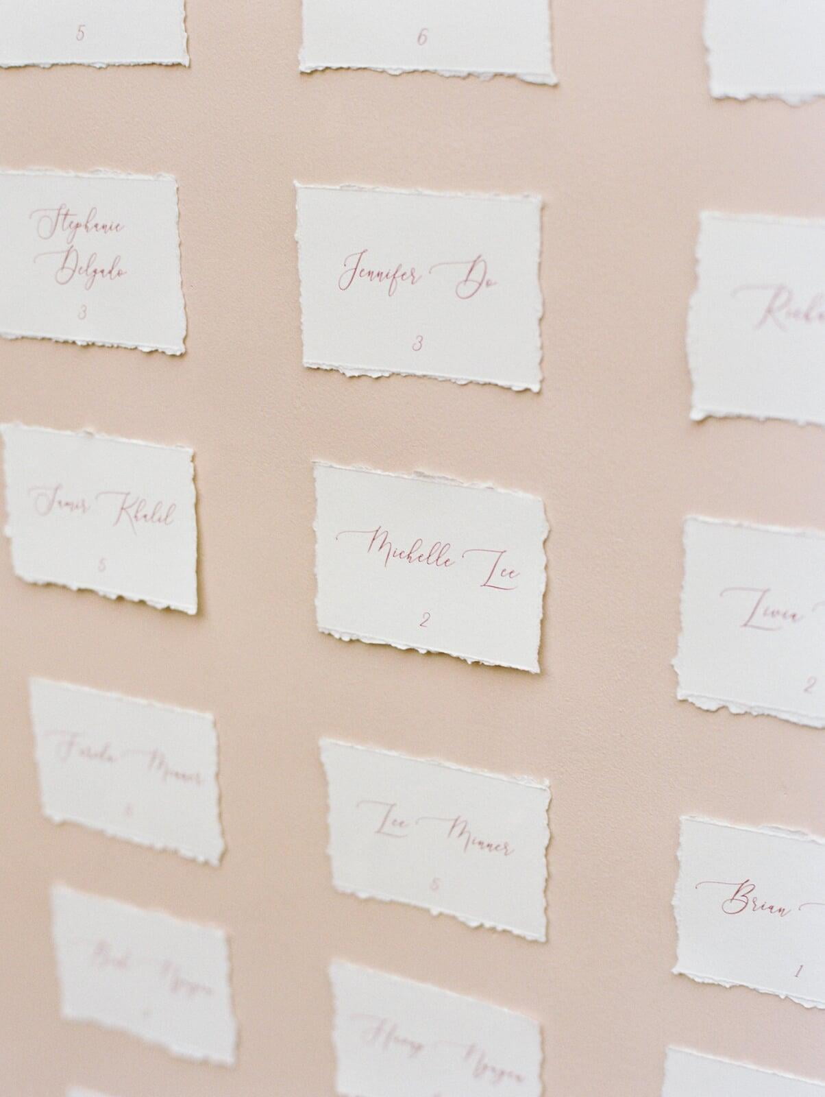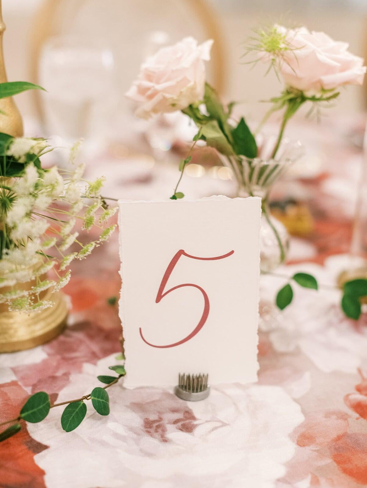 Guia and Ben envisioned a rich, elegant affair. The couple's invitation suite included organic florals illustrated in water color style with hues of blush, complete with burgundy and peachy pink envelopes, and sealed with white wax seal. Their guests found their seats with deckled place cards under a French-inspired escort display adorned with florals. Their place cards were delicate deckled edge scrolls placed upon glasses. The couple's menus featured a deckled edge as well, and hints of the florals that were present in the invitation suite. Each table featured a deckled edge table number to carry the design throughout the event.