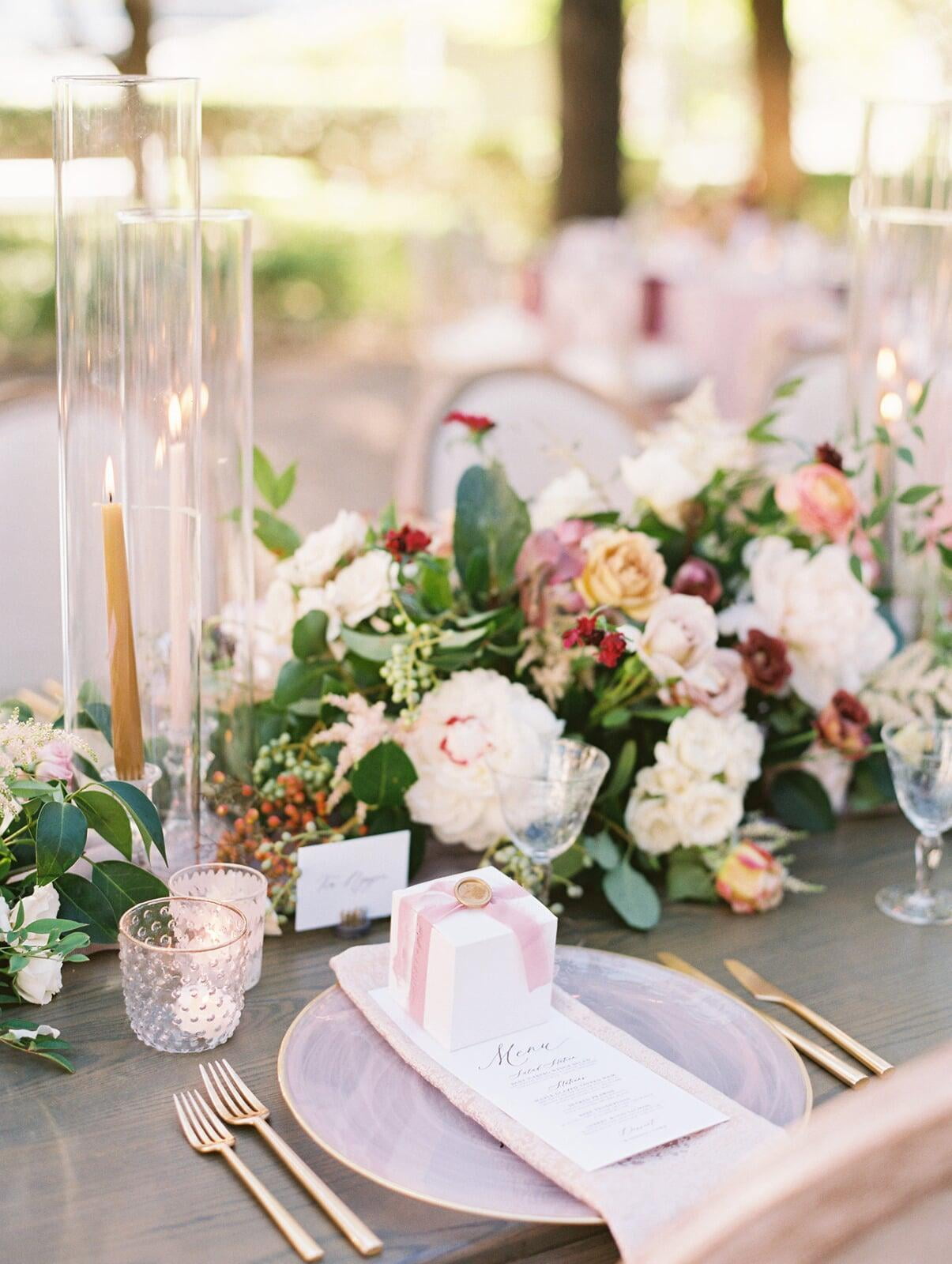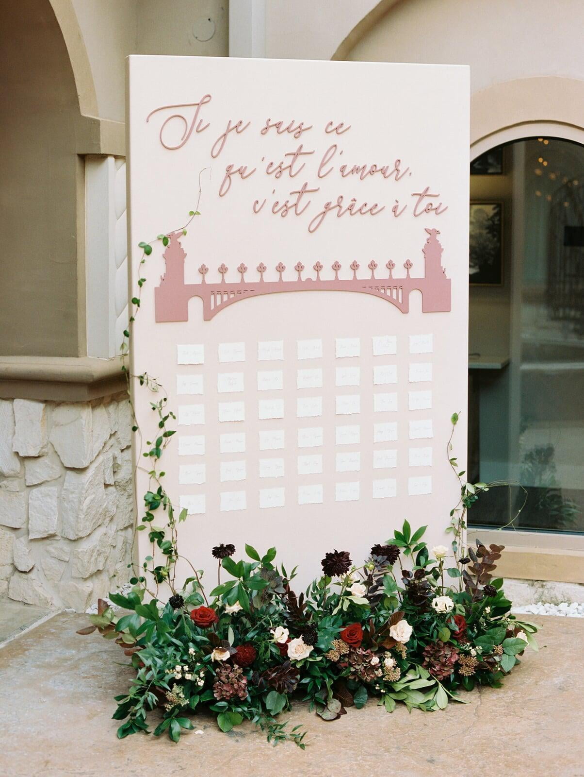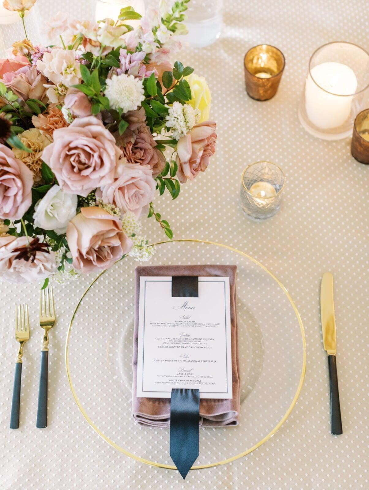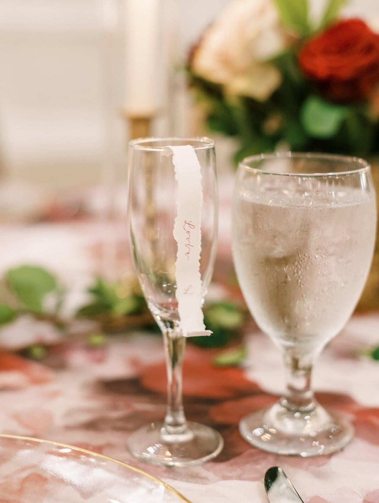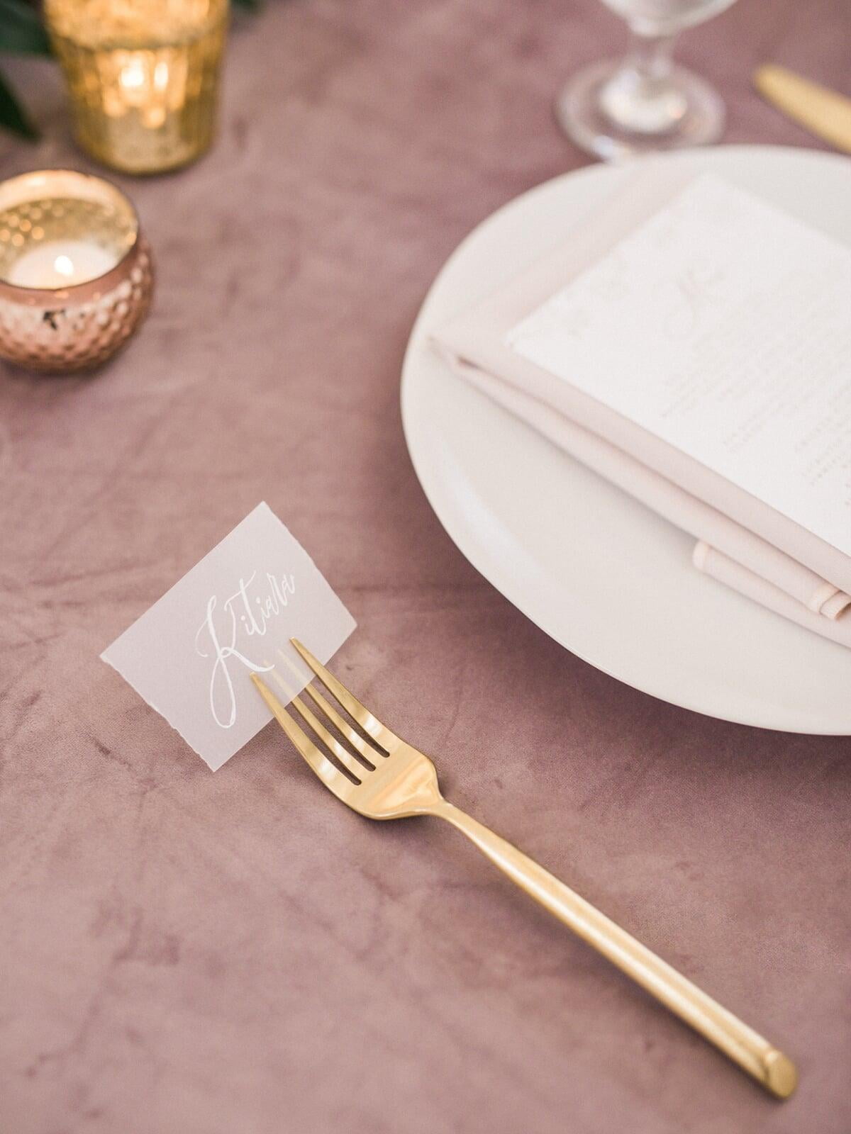 Guia and Ben envisioned a rich, elegant affair. The couple's invitation suite included organic florals illustrated in water color style with hues of blush, complete with burgundy and peachy pink envelopes, and sealed with white wax seal. Their guests found their seats with deckled place cards under a French-inspired escort display adorned with florals. Their place cards were delicate deckled edge scrolls placed upon glasses. The couple's menus featured a deckled edge as well, and hints of the florals that were present in the invitation suite. Each table featured a deckled edge table number to carry the design throughout the event.