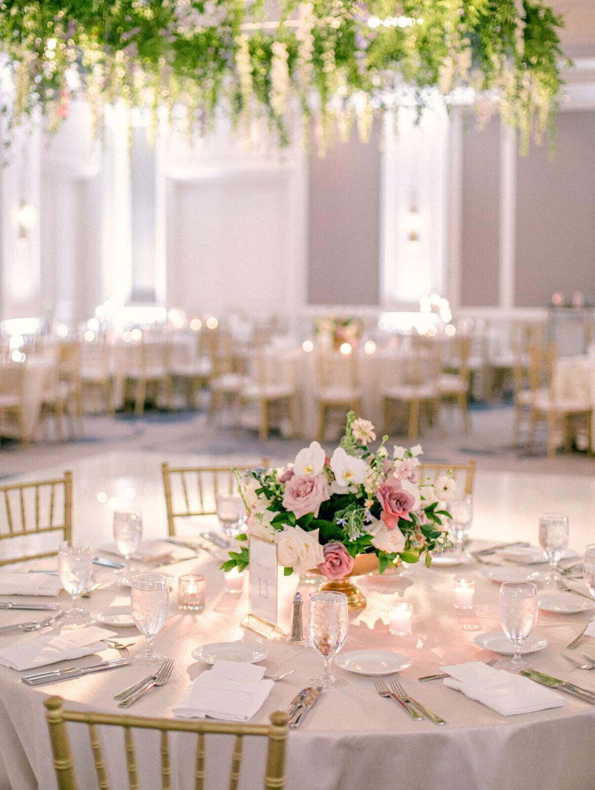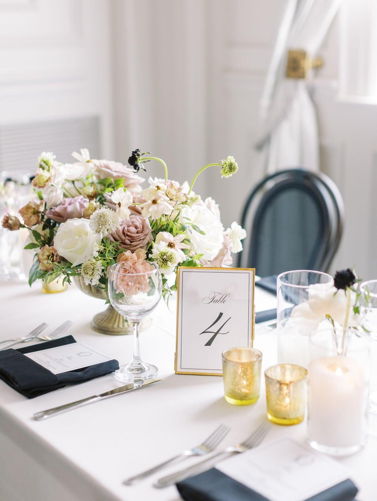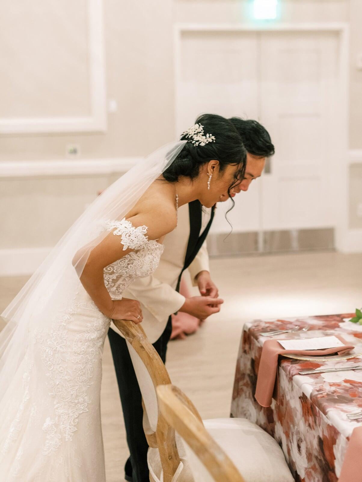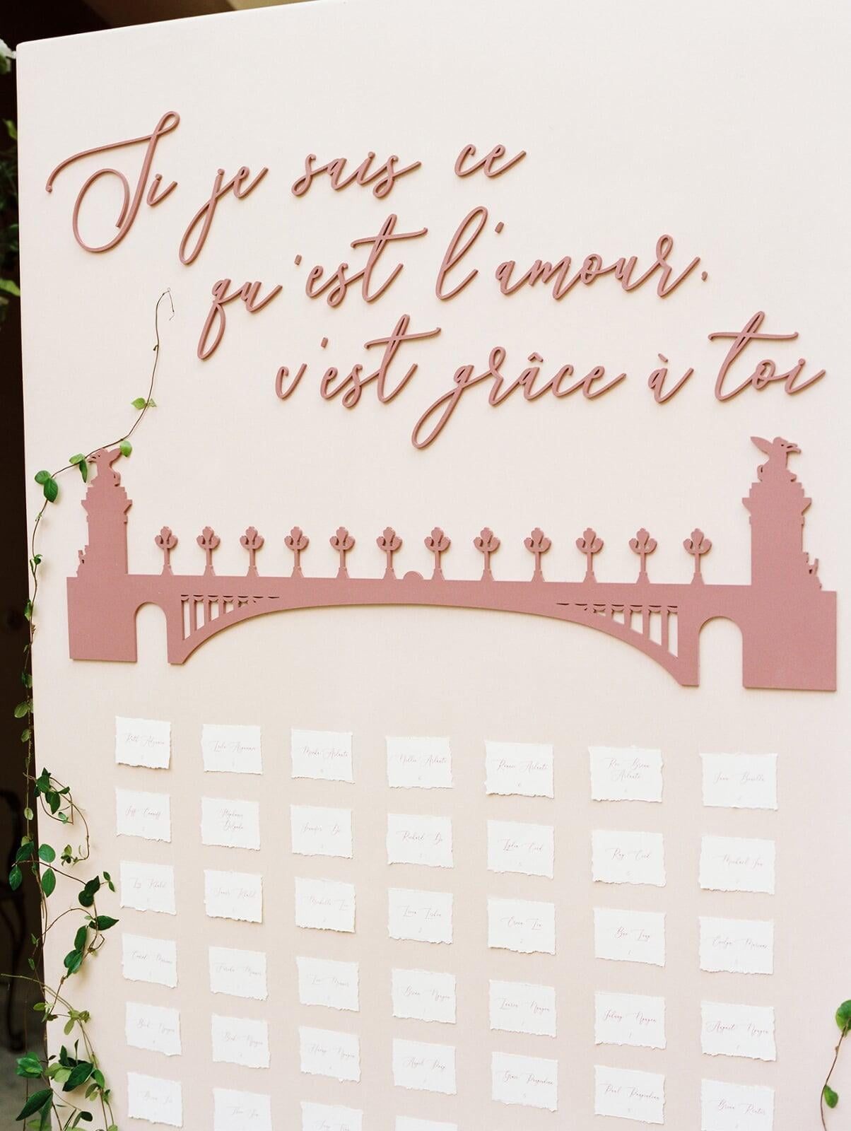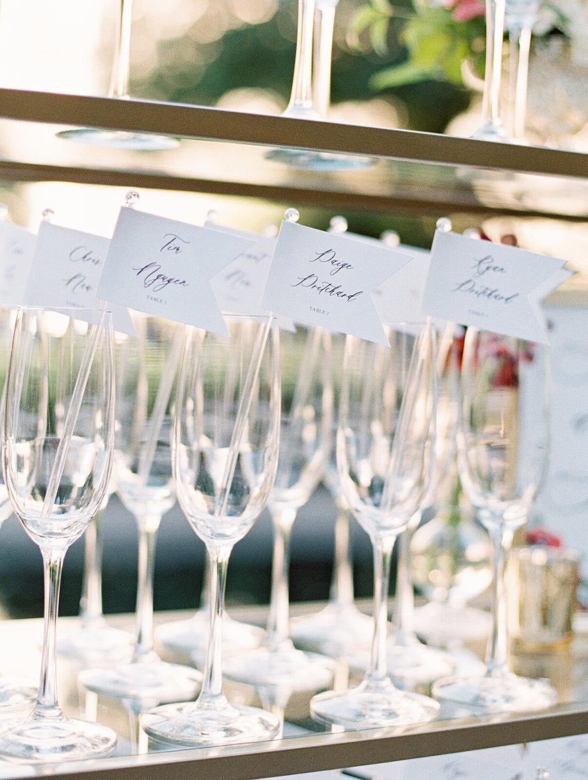 Guia and Ben envisioned a rich, elegant affair. The couple's invitation suite included organic florals illustrated in water color style with hues of blush, complete with burgundy and peachy pink envelopes, and sealed with white wax seal. Their guests found their seats with deckled place cards under a French-inspired escort display adorned with florals. Their place cards were delicate deckled edge scrolls placed upon glasses. The couple's menus featured a deckled edge as well, and hints of the florals that were present in the invitation suite. Each table featured a deckled edge table number to carry the design throughout the event.