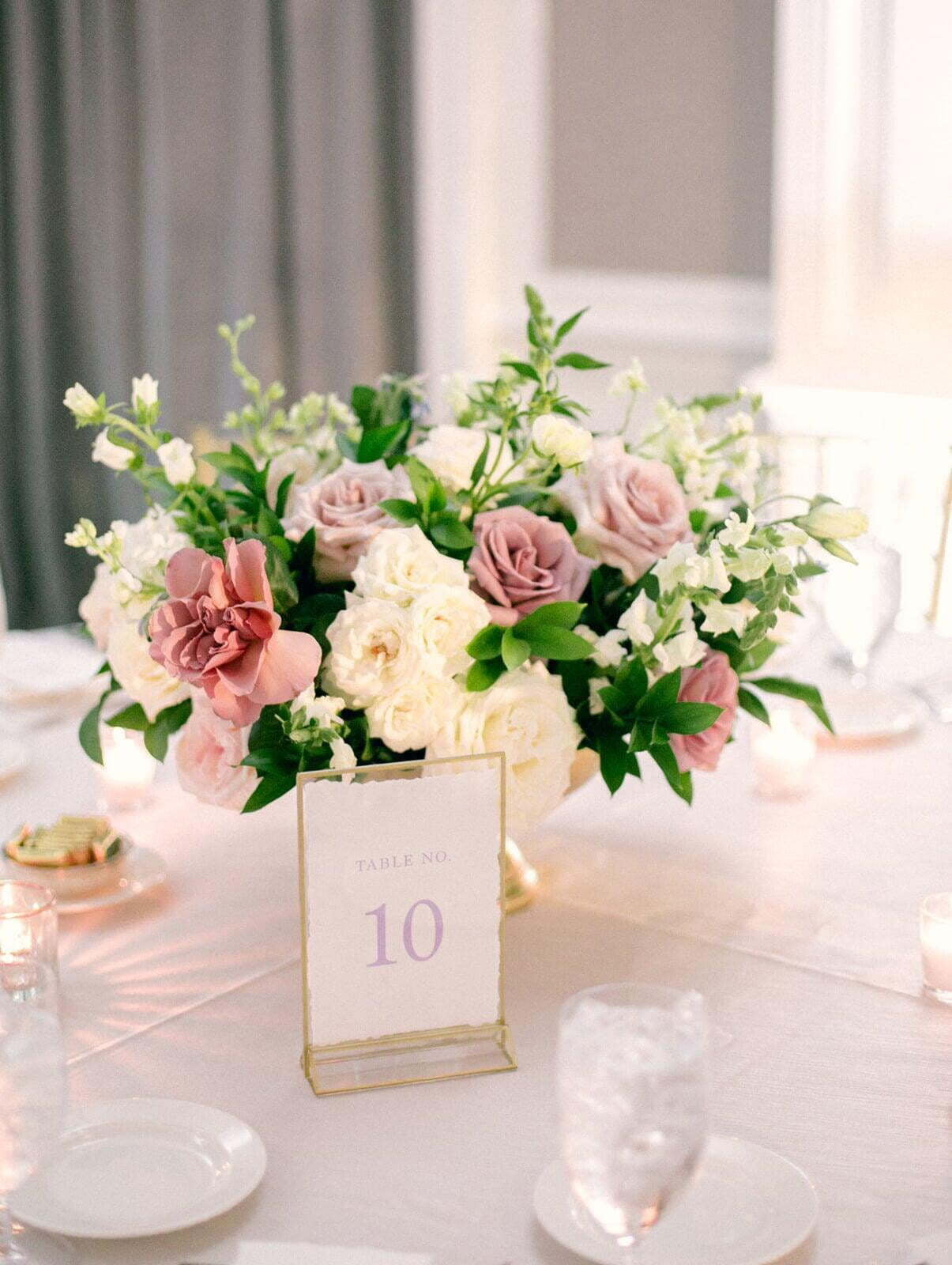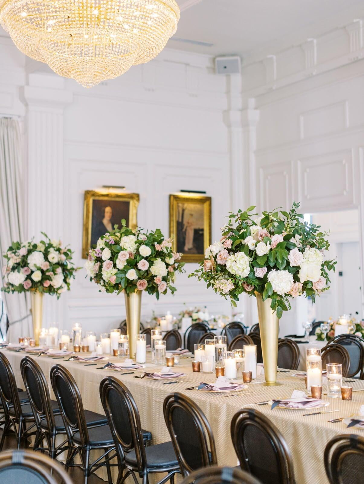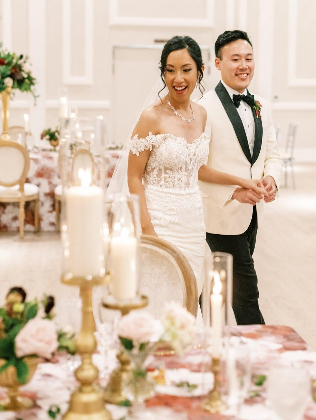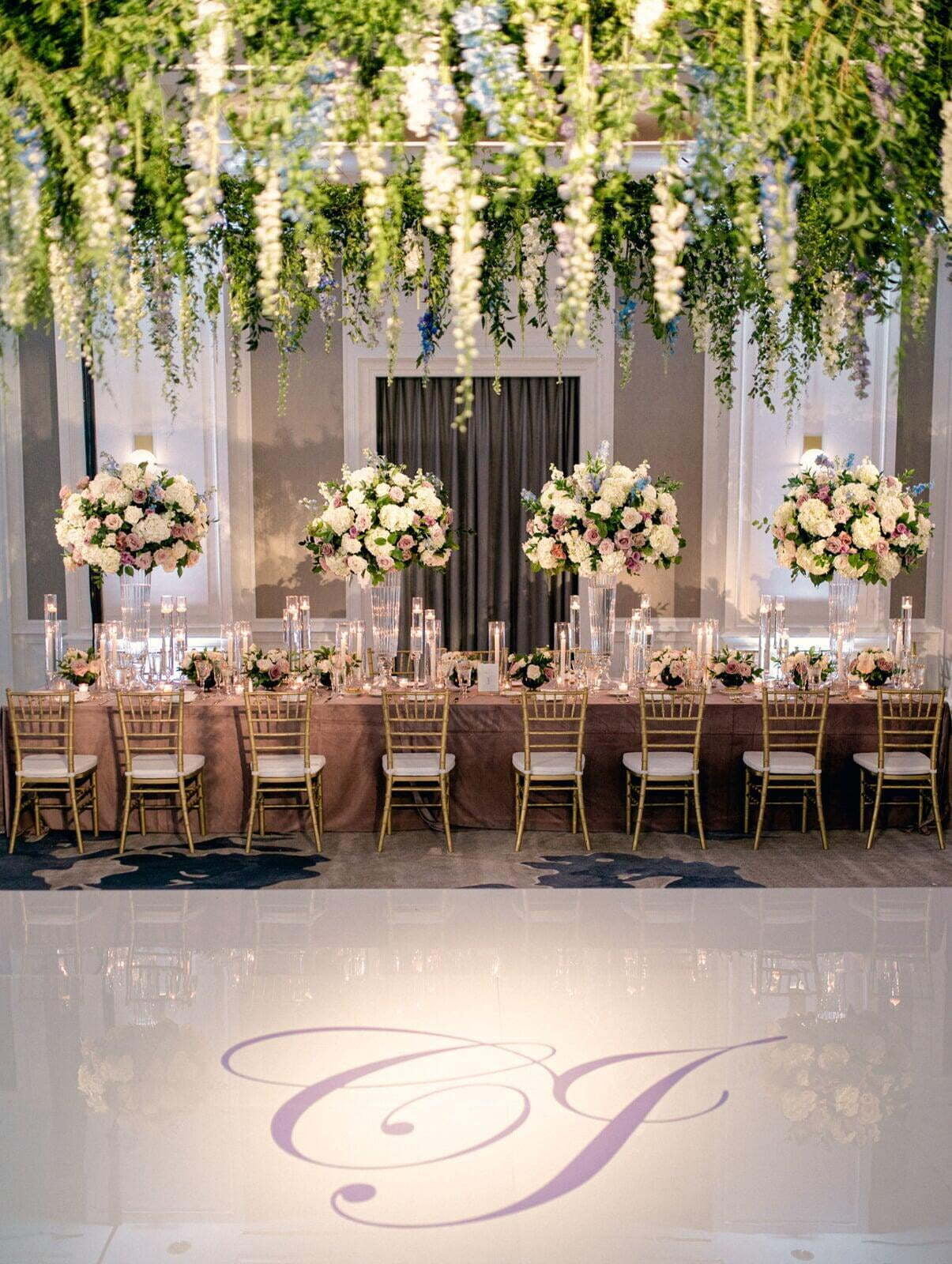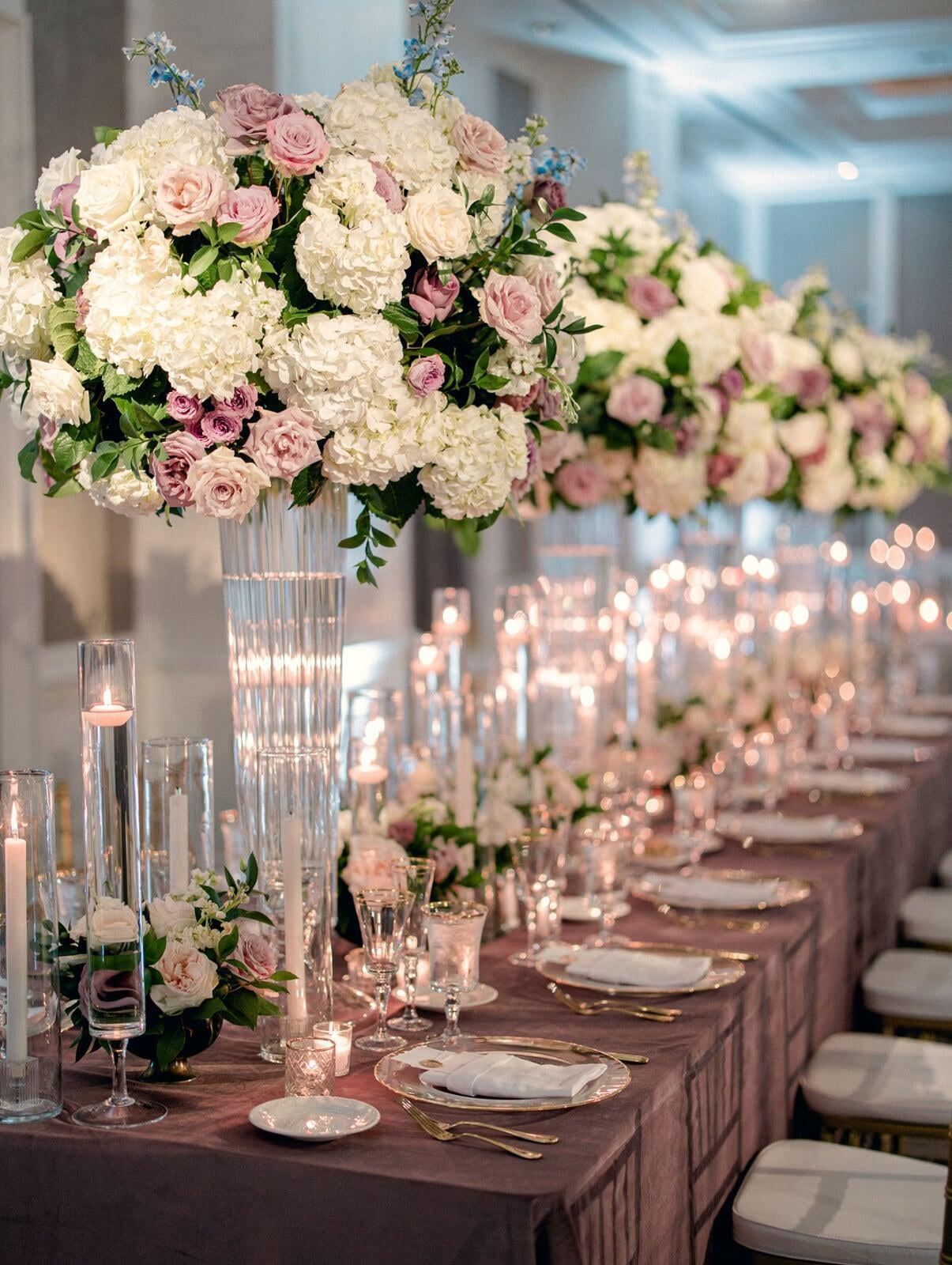 Guia and Ben envisioned a rich, elegant affair. The couple's invitation suite included organic florals illustrated in water color style with hues of blush, complete with burgundy and peachy pink envelopes, and sealed with white wax seal. Their guests found their seats with deckled place cards under a French-inspired escort display adorned with florals. Their place cards were delicate deckled edge scrolls placed upon glasses. The couple's menus featured a deckled edge as well, and hints of the florals that were present in the invitation suite. Each table featured a deckled edge table number to carry the design throughout the event.