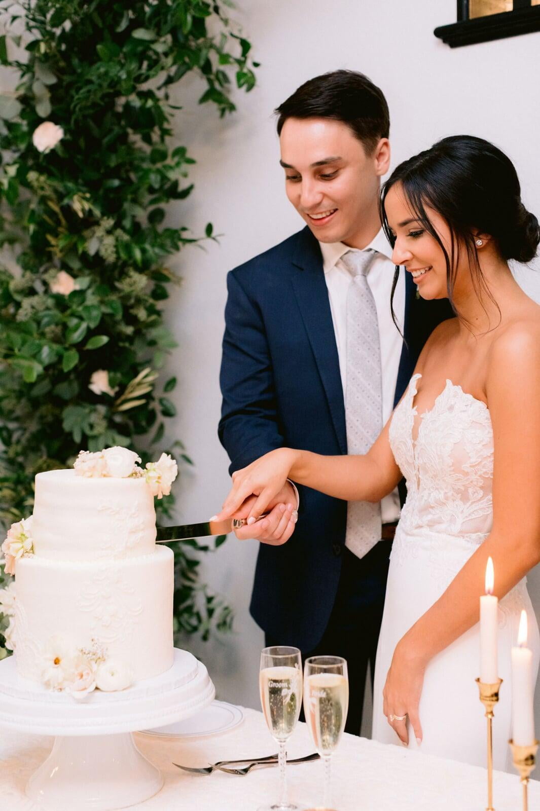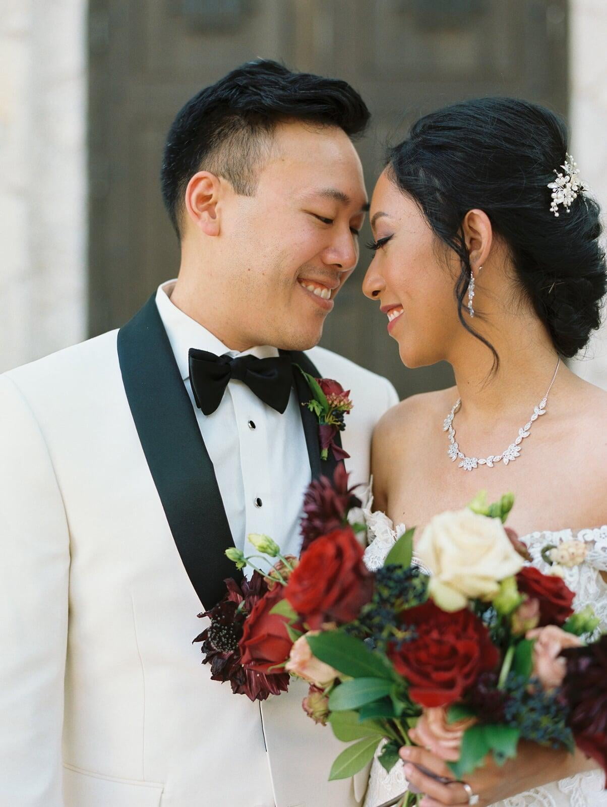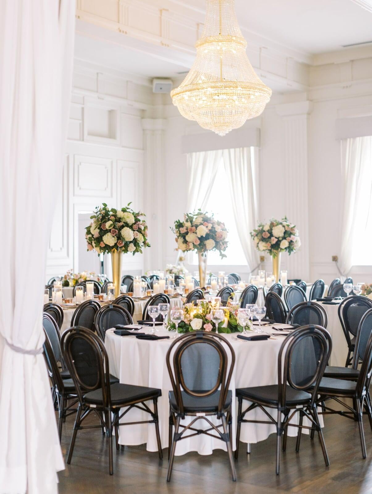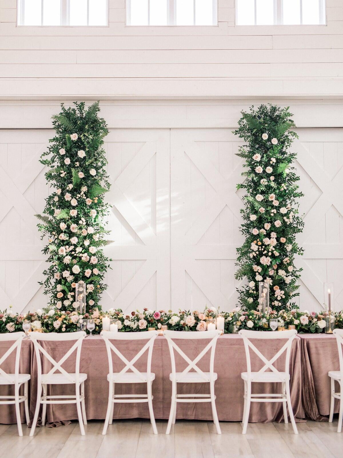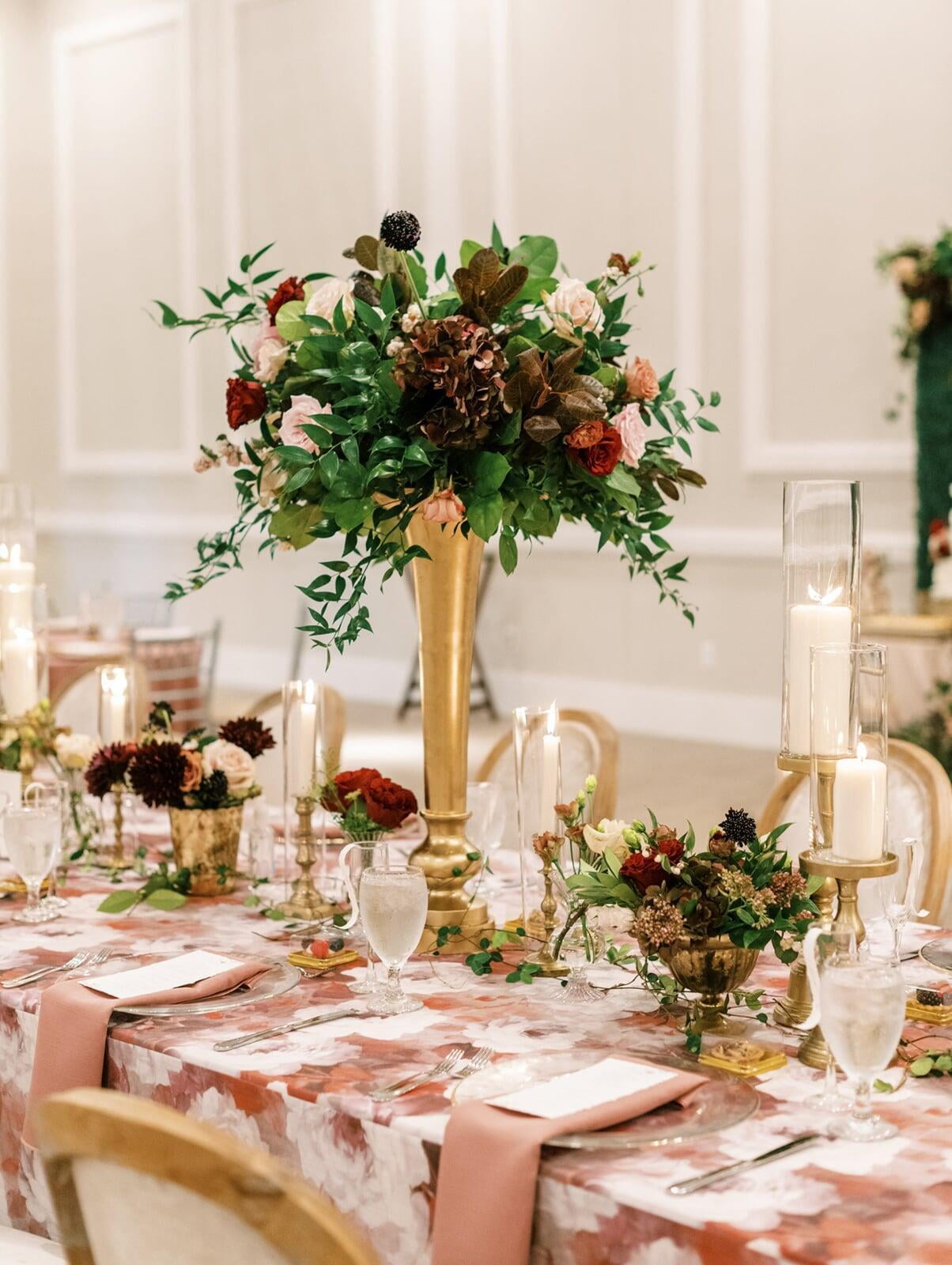 Guia and Ben envisioned a rich, elegant affair. The couple's invitation suite included organic florals illustrated in water color style with hues of blush, complete with burgundy and peachy pink envelopes, and sealed with white wax seal. Their guests found their seats with deckled place cards under a French-inspired escort display adorned with florals. Their place cards were delicate deckled edge scrolls placed upon glasses. The couple's menus featured a deckled edge as well, and hints of the florals that were present in the invitation suite. Each table featured a deckled edge table number to carry the design throughout the event.