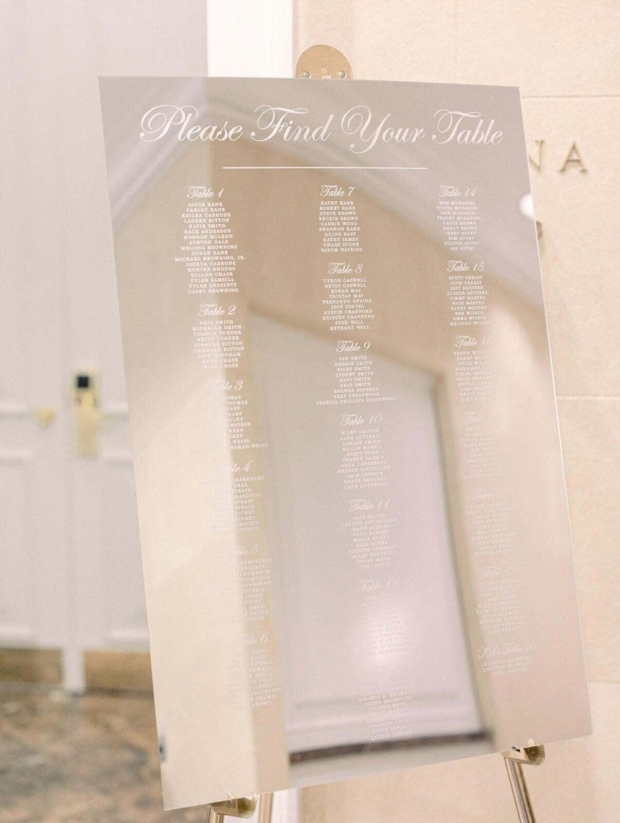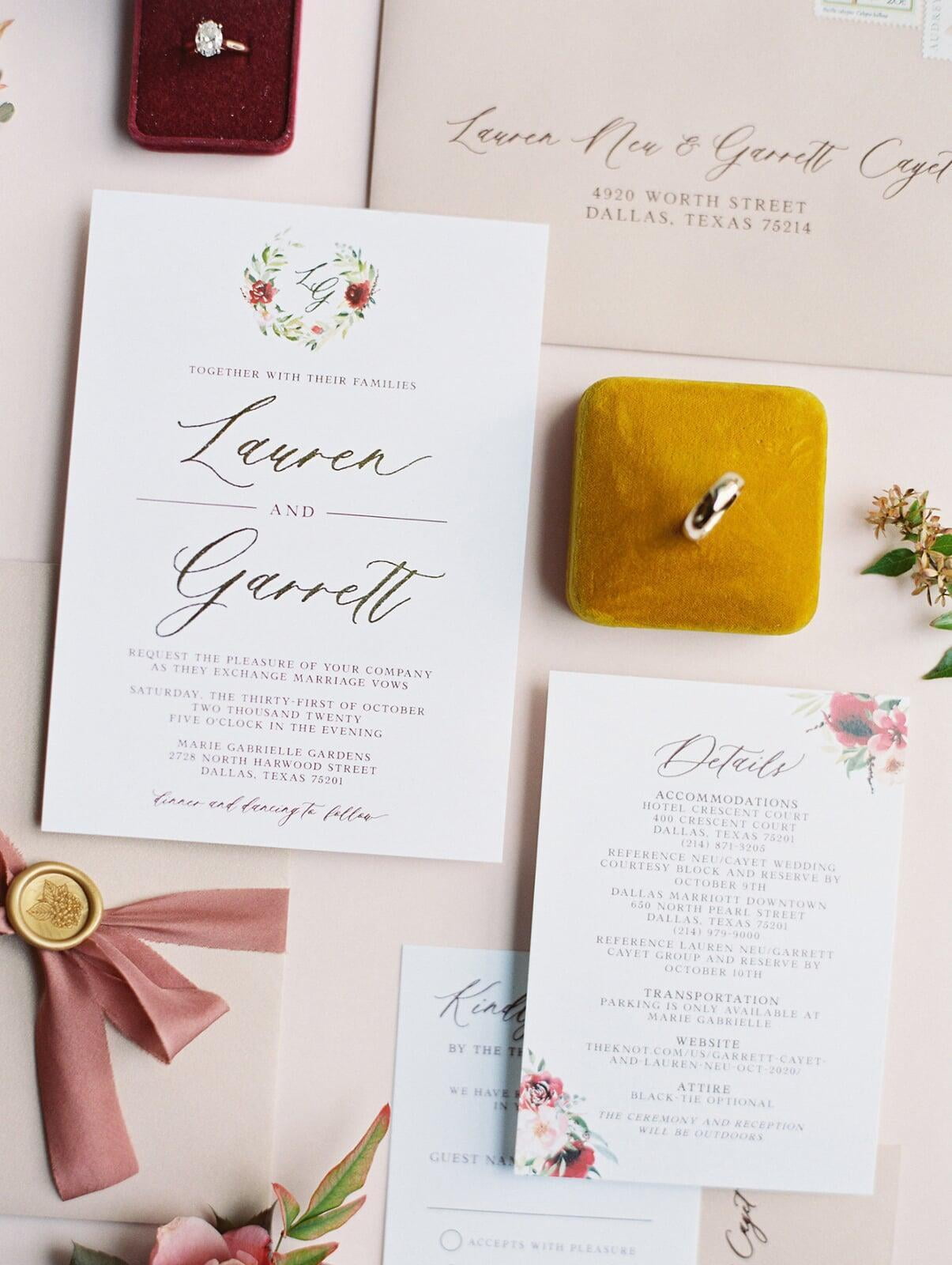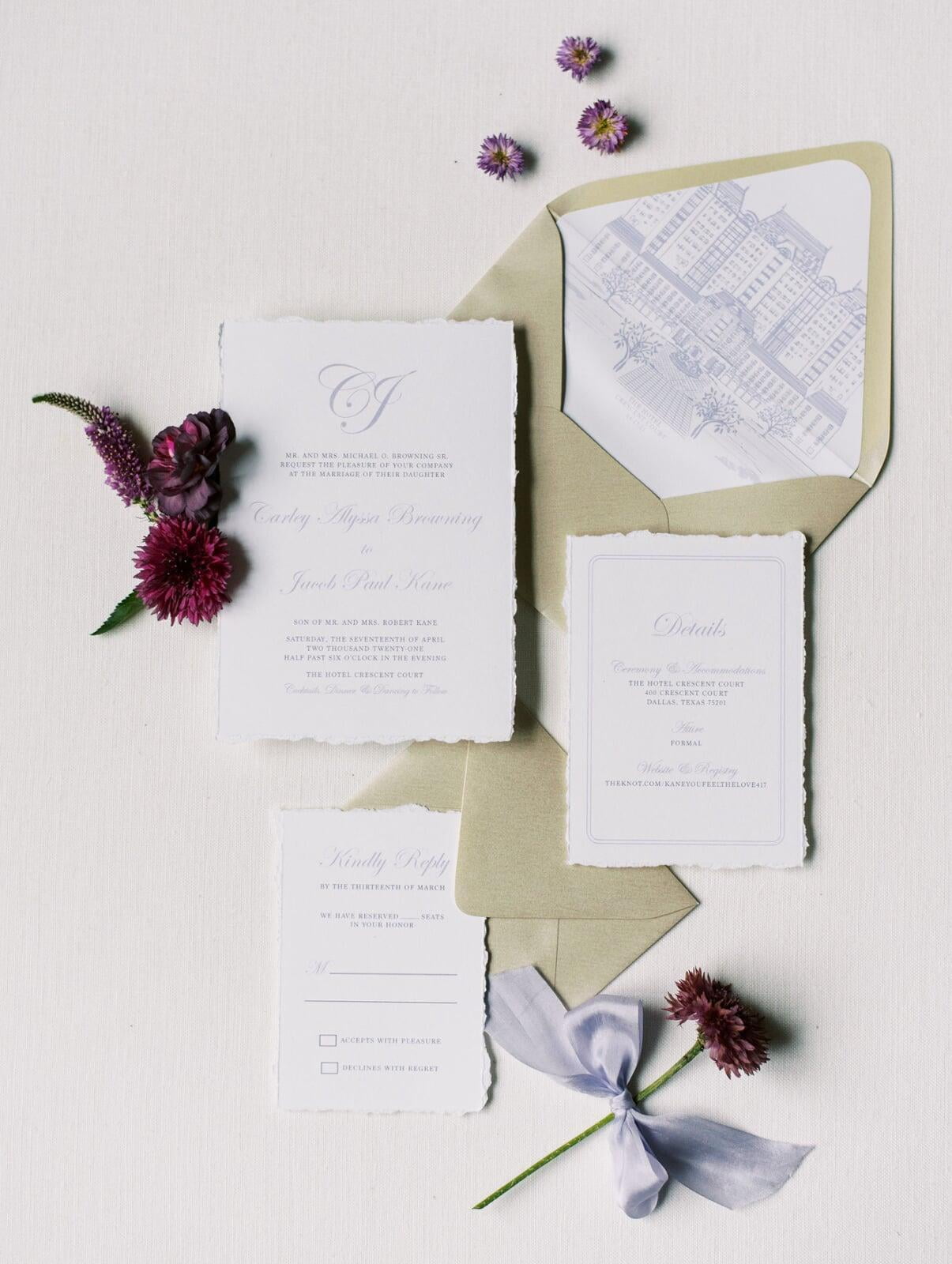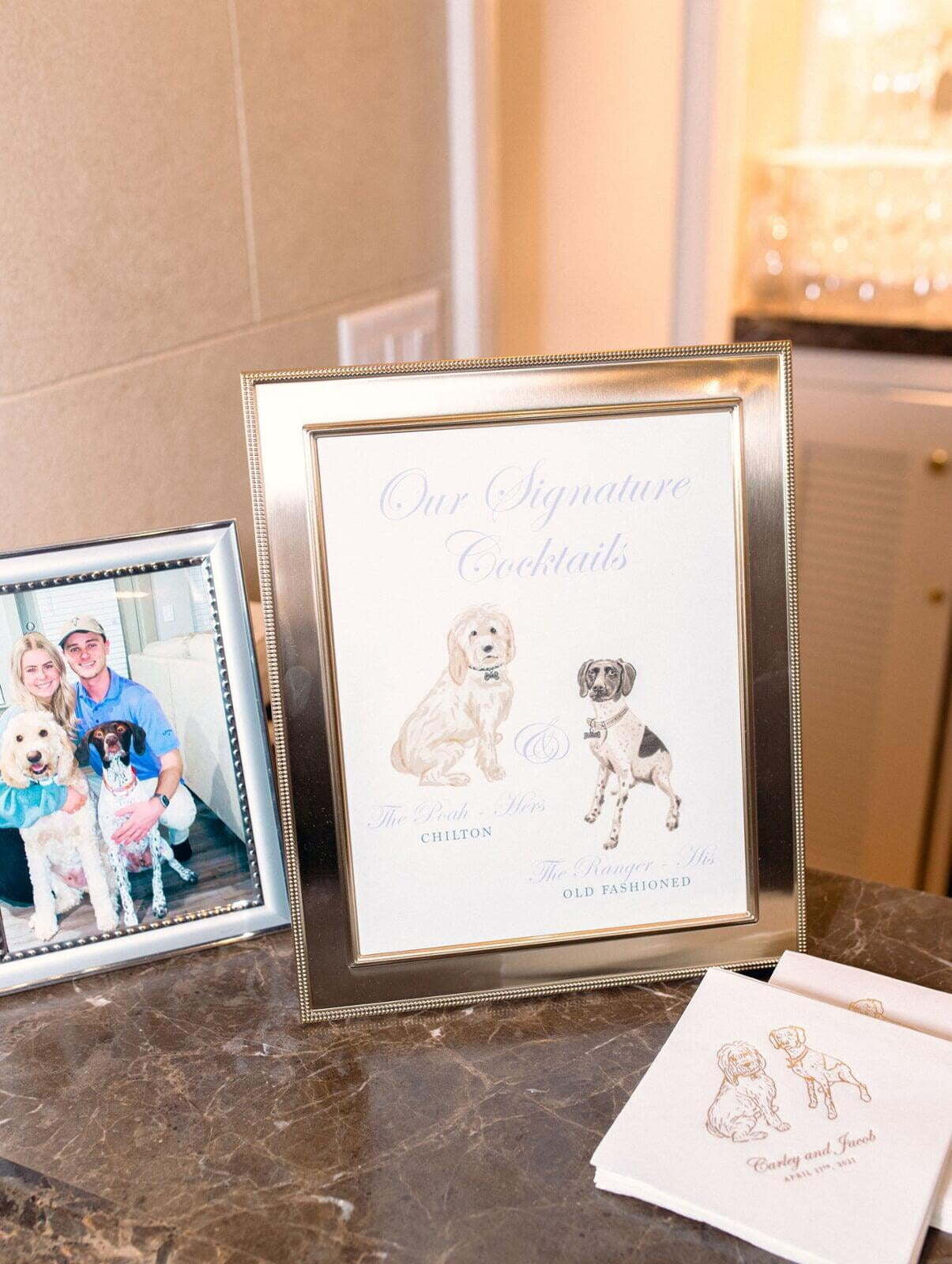 Carly and Jake determined to wed at the iconic Dallas Hotel Crescent Court. Their invitation suite featured romantic deckled edges, a simple interlocking monogram, and a custom sketch of the Hotel Crescent Court in a soft lavender, with gold envelopes. The guests found their seats via a mirrored white ink escort display and their favors were personalized koozies with water color illustrations of their pups. The couples' monogram appeared on the dance floor and DJ booth. The couple also had coordinating cocktail napkins with sketch style illustrations of their dogs and a signature cocktail signage.