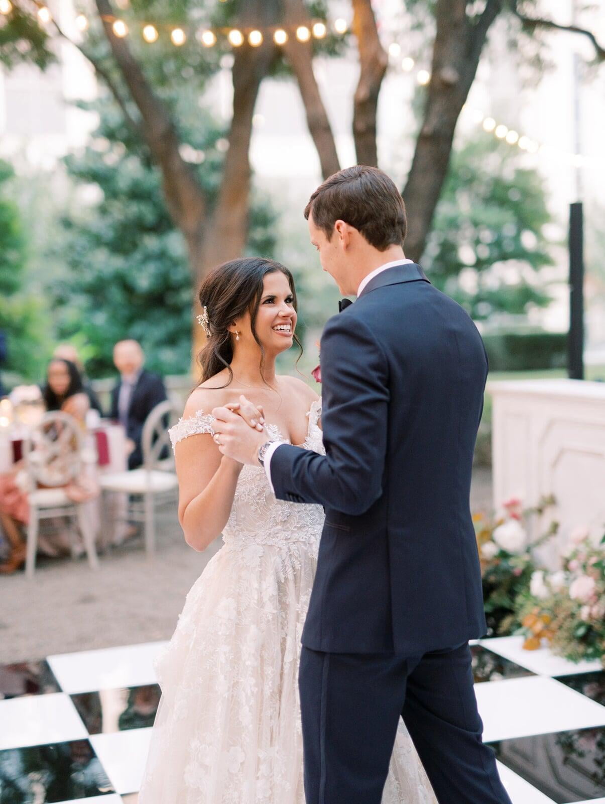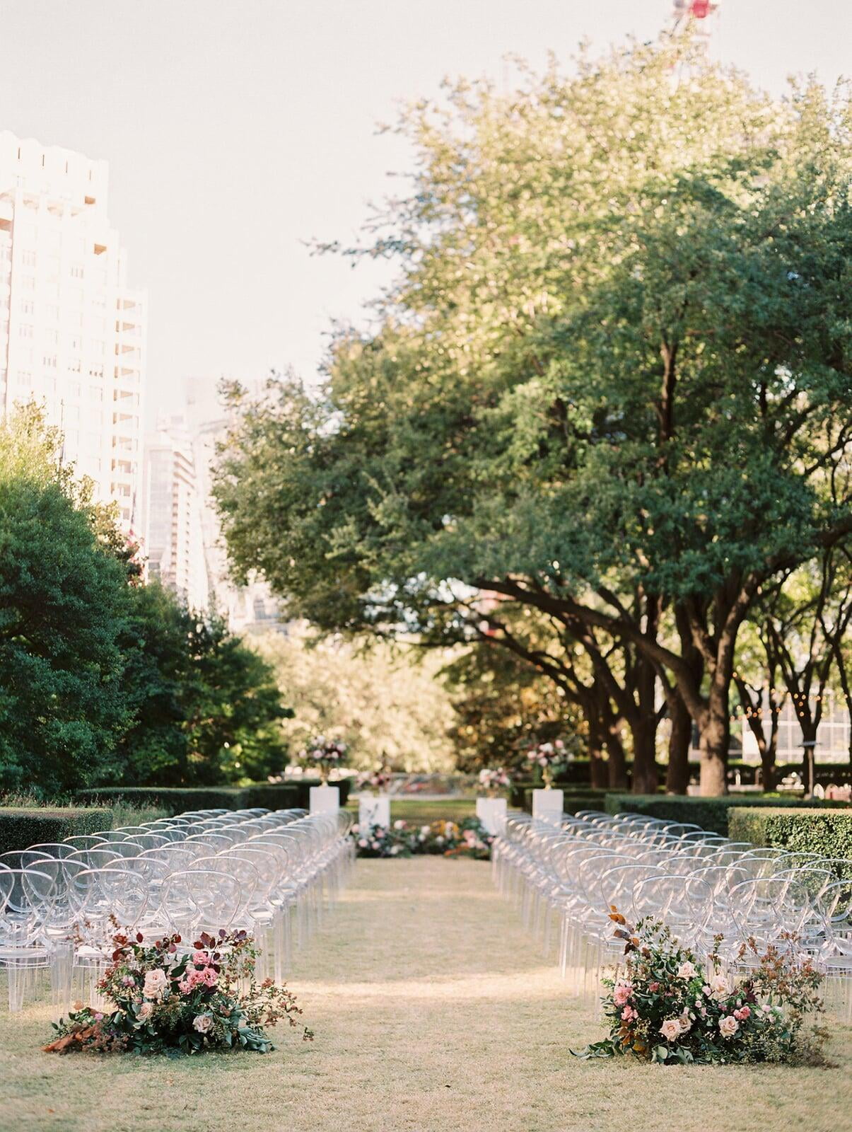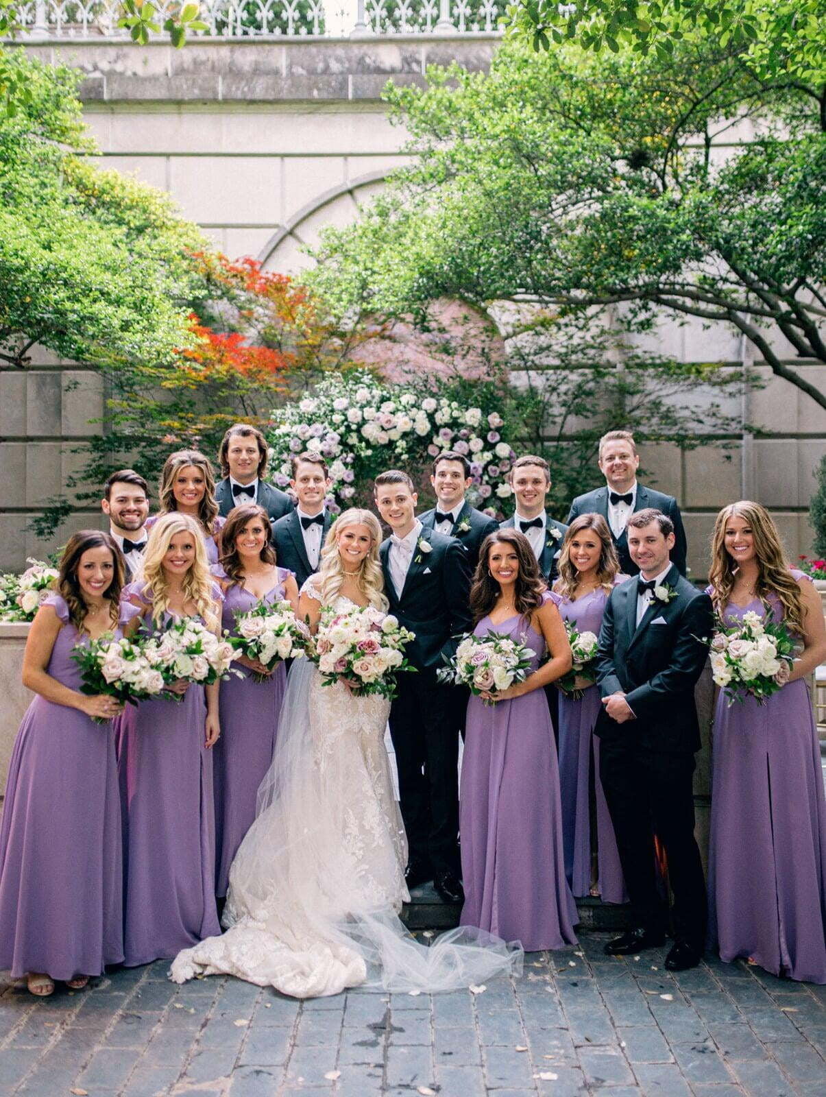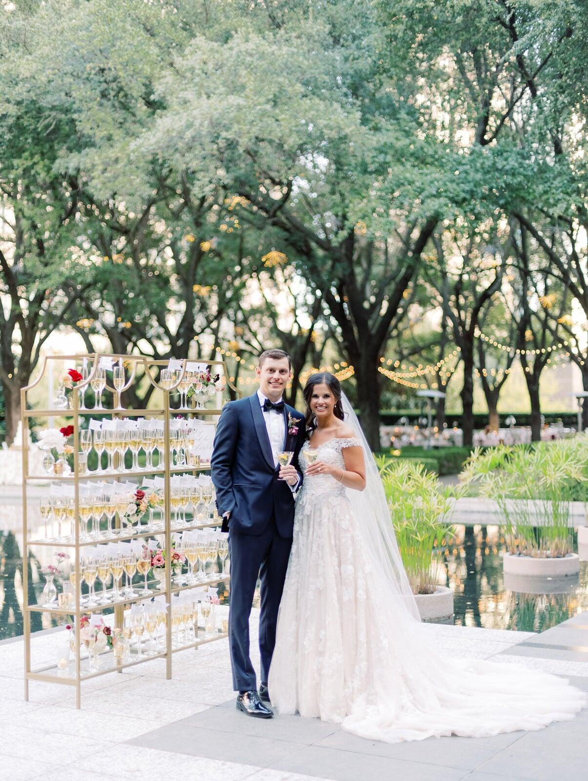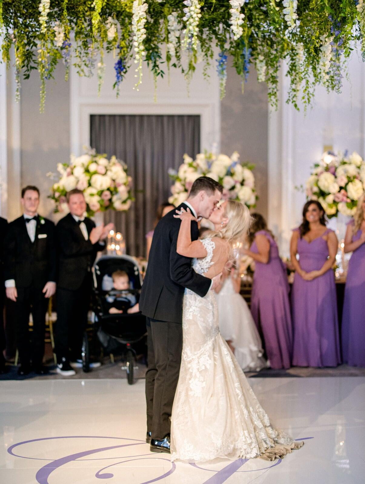 Carly and Jake determined to wed at the iconic Dallas Hotel Crescent Court. Their invitation suite featured romantic deckled edges, a simple interlocking monogram, and a custom sketch of the Hotel Crescent Court in a soft lavender, with gold envelopes. The guests found their seats via a mirrored white ink escort display and their favors were personalized koozies with water color illustrations of their pups. The couples' monogram appeared on the dance floor and DJ booth. The couple also had coordinating cocktail napkins with sketch style illustrations of their dogs and a signature cocktail signage.
