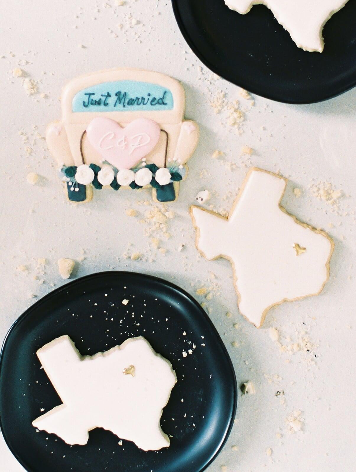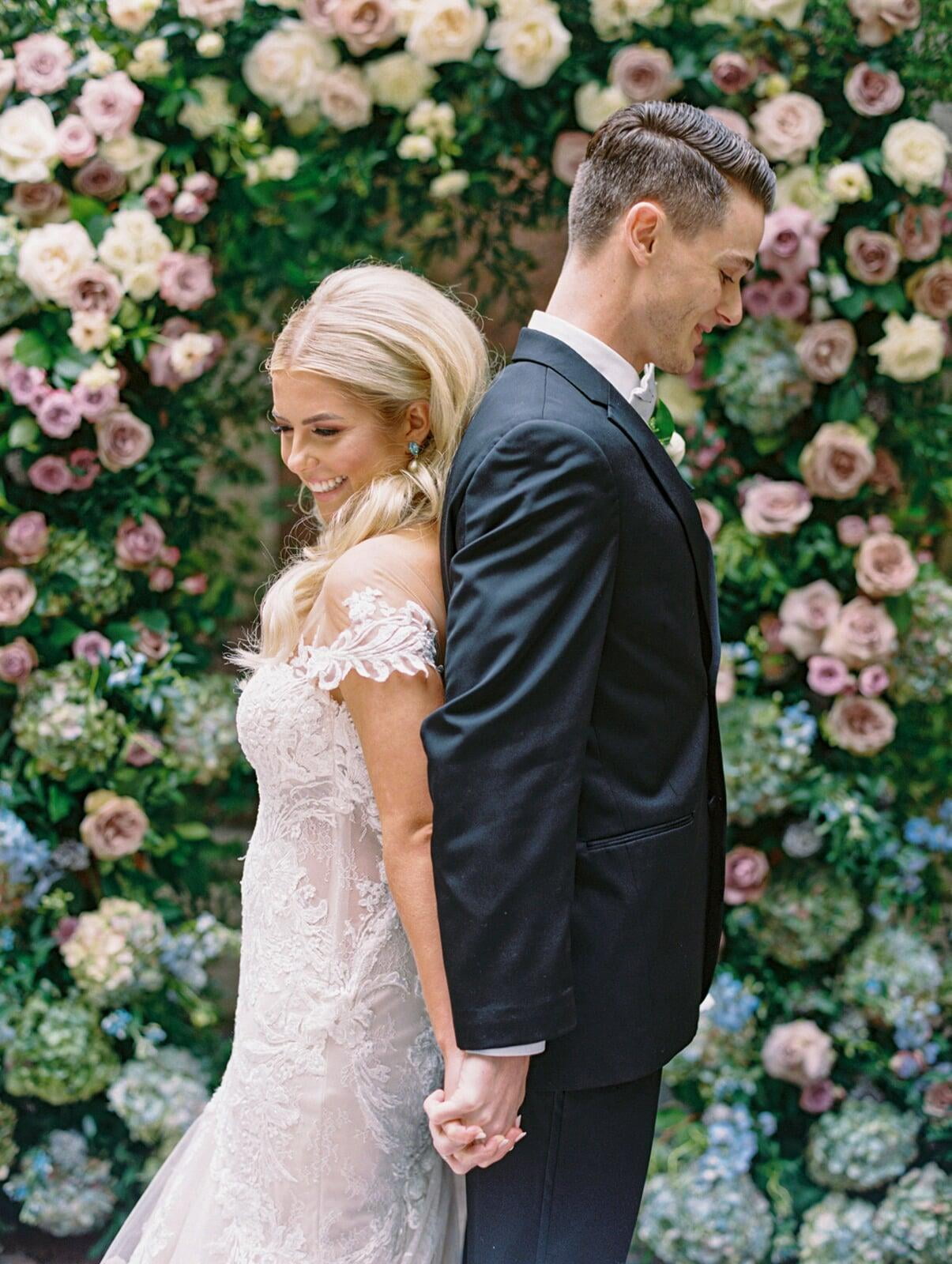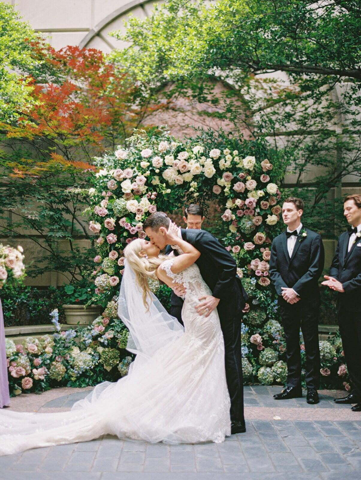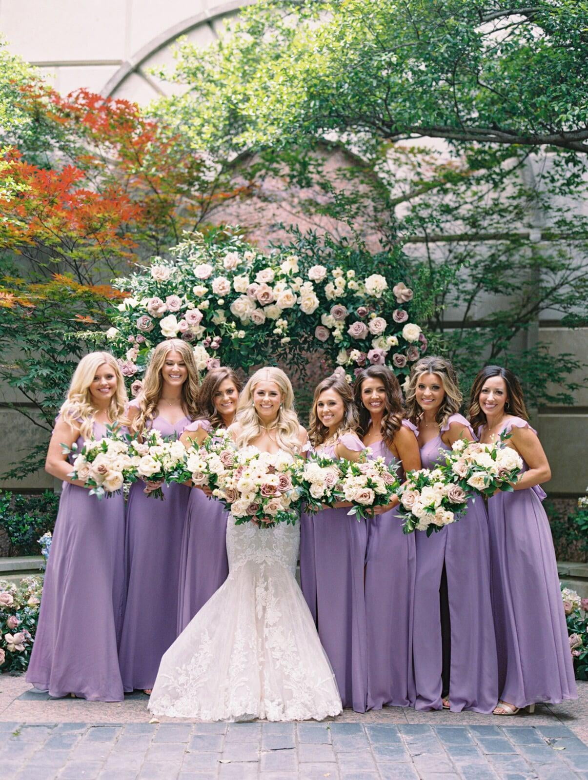 Carly and Jake determined to wed at the iconic Dallas Hotel Crescent Court. Their invitation suite featured romantic deckled edges, a simple interlocking monogram, and a custom sketch of the Hotel Crescent Court in a soft lavender, with gold envelopes. The guests found their seats via a mirrored white ink escort display and their favors were personalized koozies with water color illustrations of their pups. The couples' monogram appeared on the dance floor and DJ booth. The couple also had coordinating cocktail napkins with sketch style illustrations of their dogs and a signature cocktail signage.