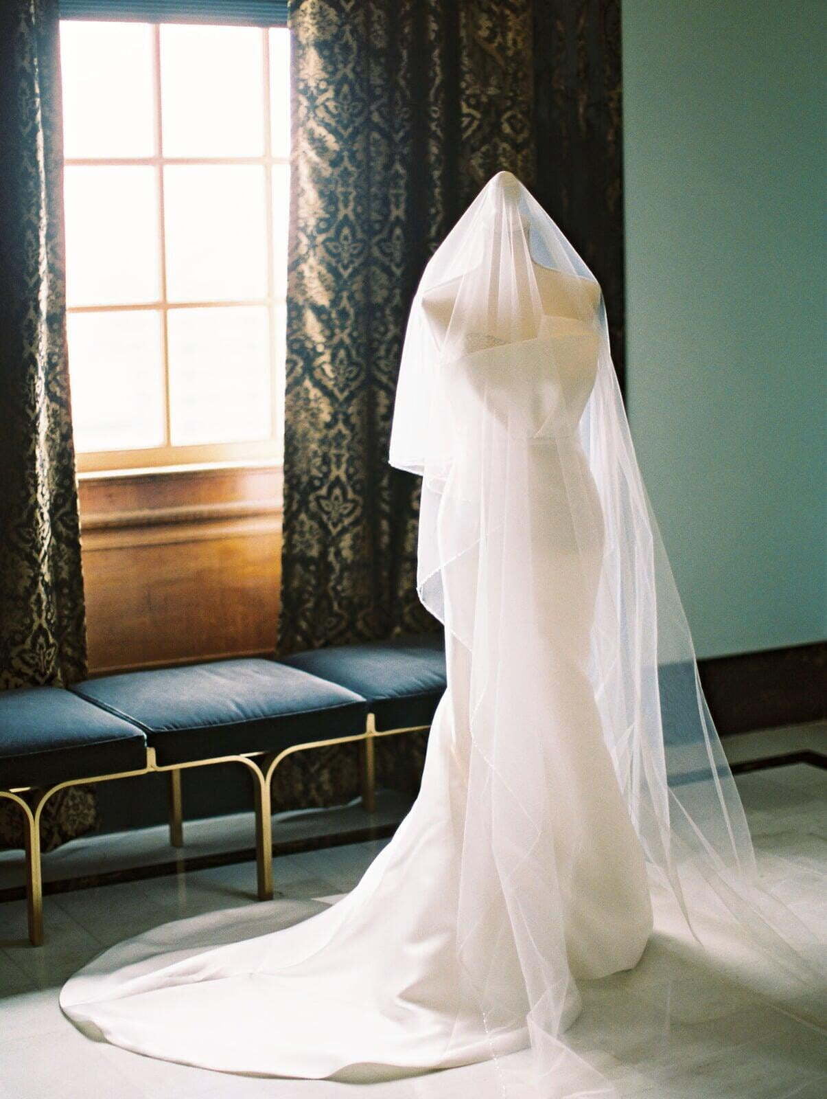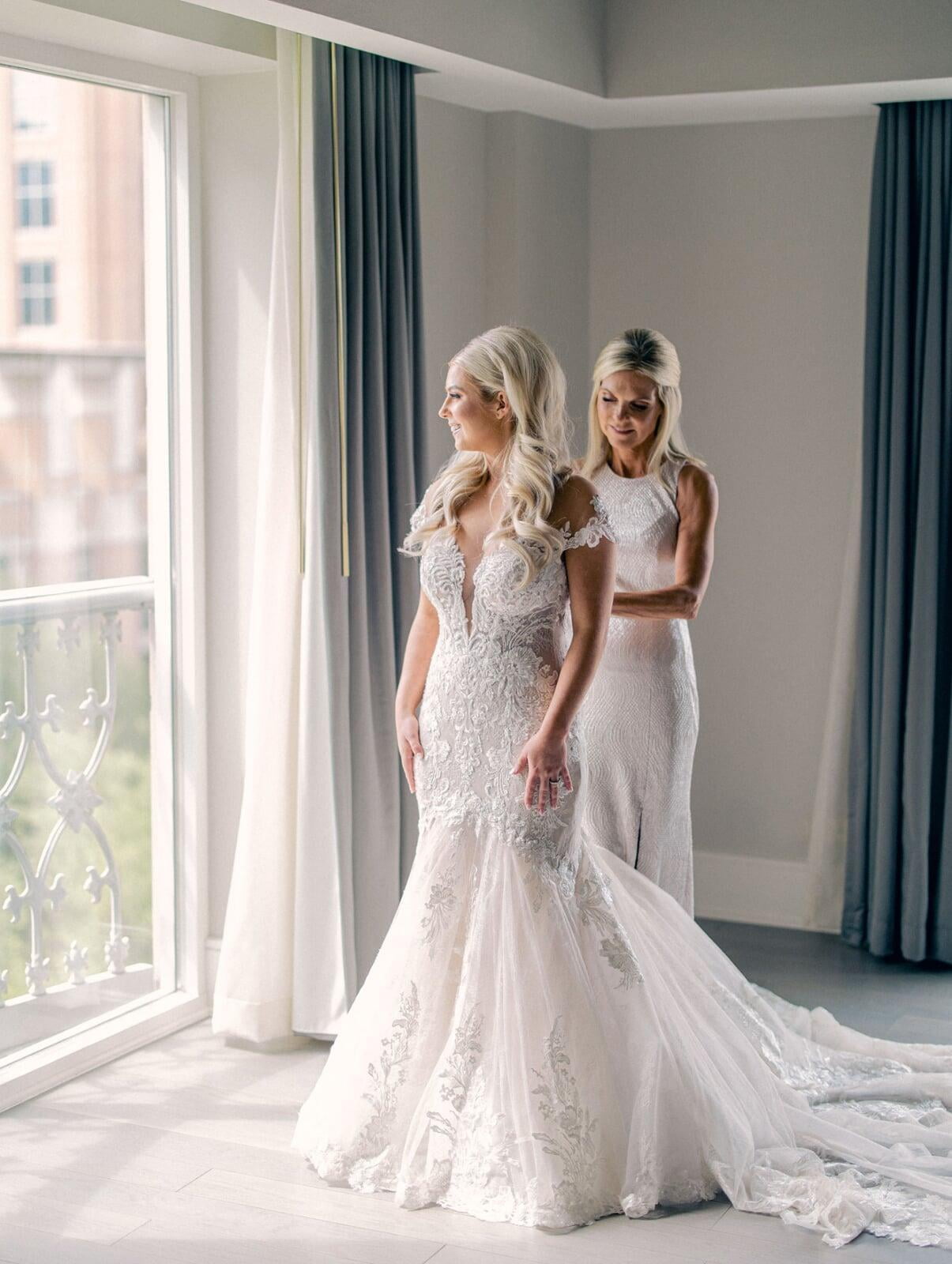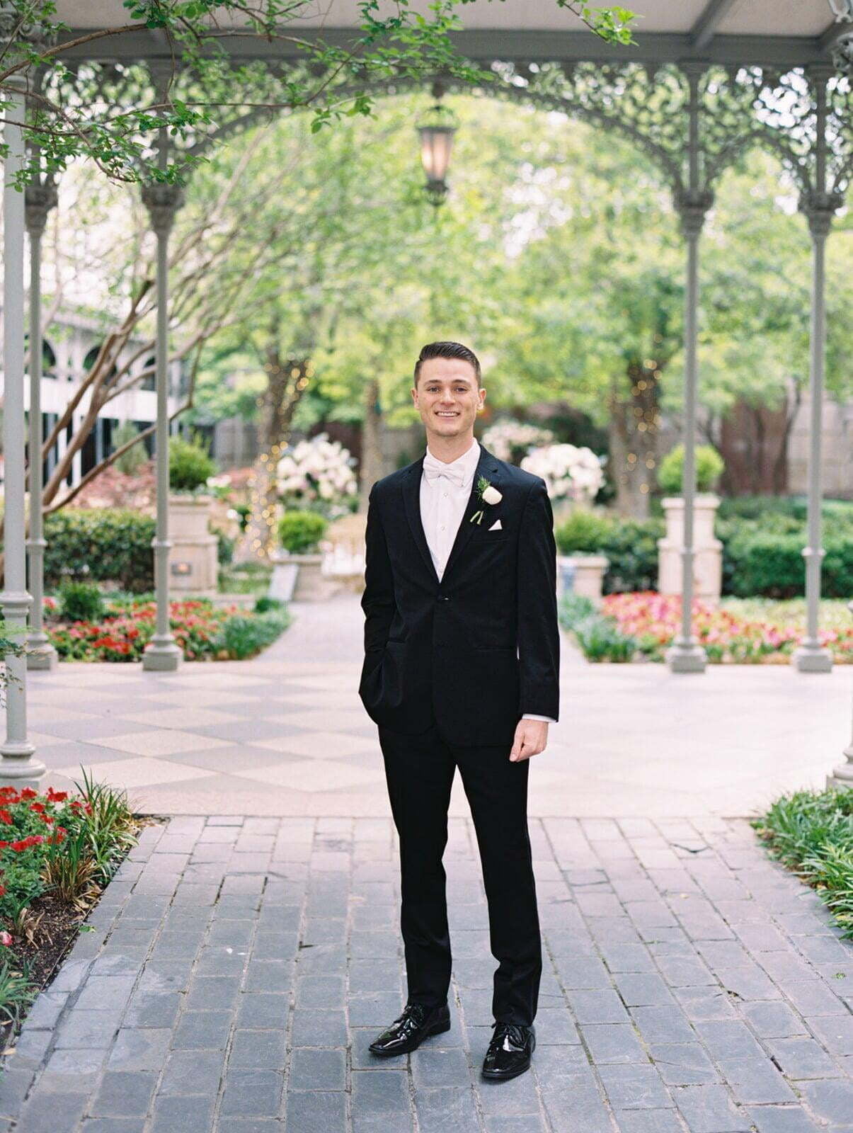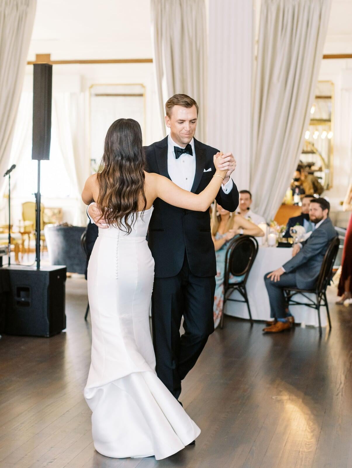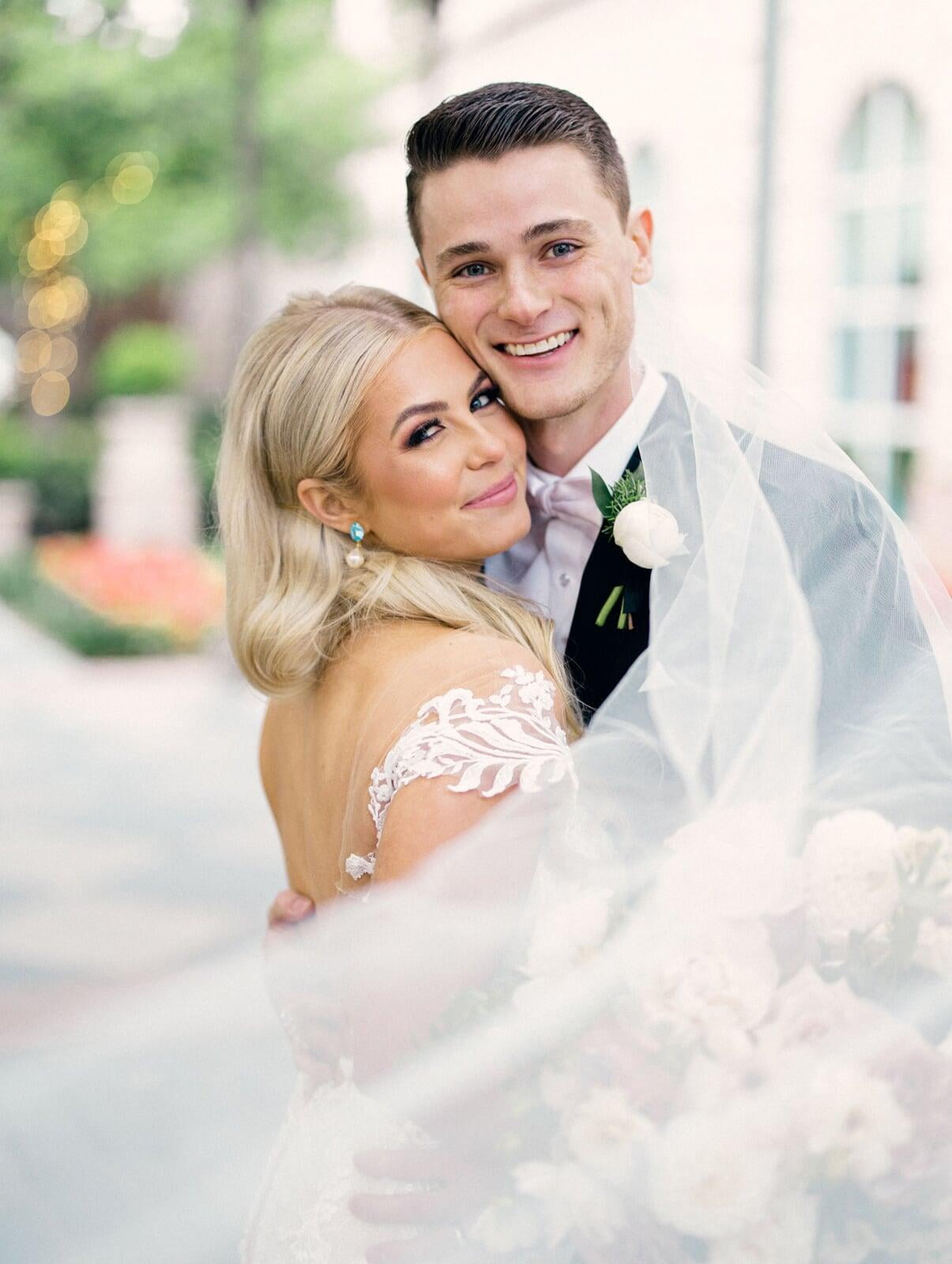 Carly and Jake determined to wed at the iconic Dallas Hotel Crescent Court. Their invitation suite featured romantic deckled edges, a simple interlocking monogram, and a custom sketch of the Hotel Crescent Court in a soft lavender, with gold envelopes. The guests found their seats via a mirrored white ink escort display and their favors were personalized koozies with water color illustrations of their pups. The couples' monogram appeared on the dance floor and DJ booth. The couple also had coordinating cocktail napkins with sketch style illustrations of their dogs and a signature cocktail signage.