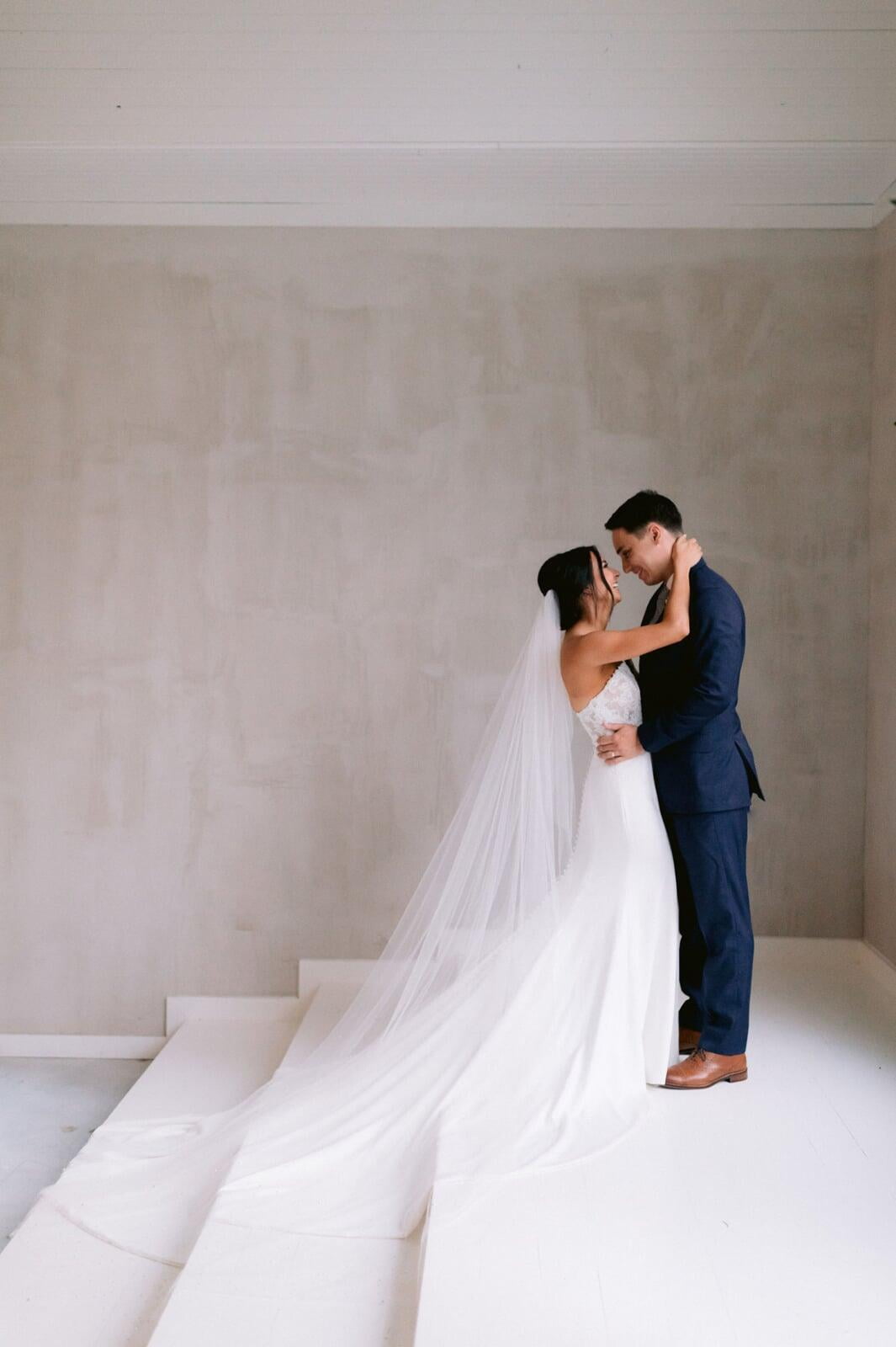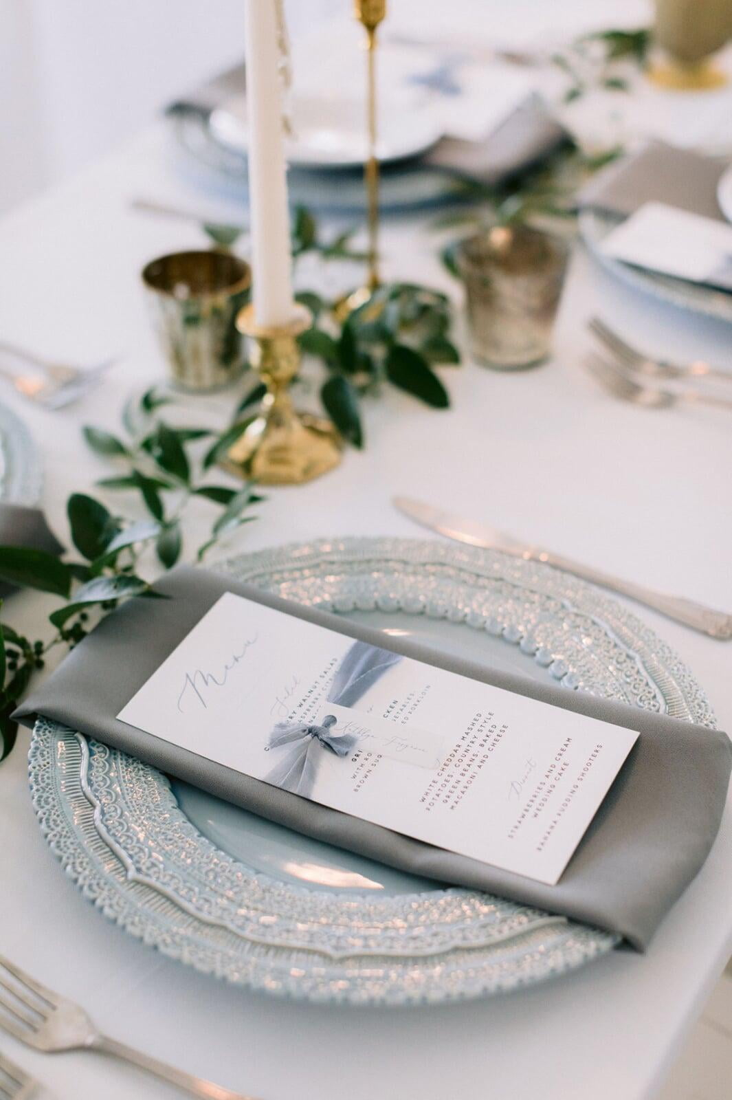 Maddy and Jared's style leaned minimal modern. We began their stationery design with a casual, photo save the date, and carried the tone with the invitation suite. Maddy wanted to give a glimpse of her dress, so we created a custom hand drawn illustration of the lace pattern of her wedding dress, and put it in the envelope liner. The suite was packaged with shades of blue silk ribbon, and paired with a light and dark blue envelope. At the reception, guests were greeted with a coordinating menu, ribbon and place card. The couple also utilized coordinating signage in the same style.
